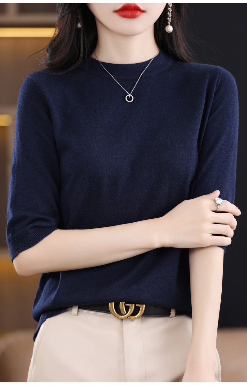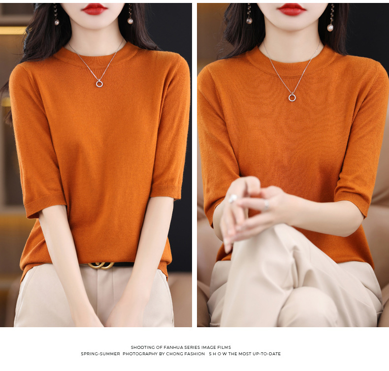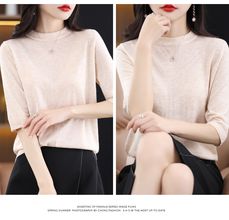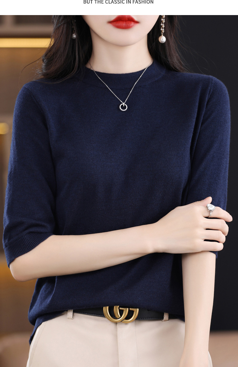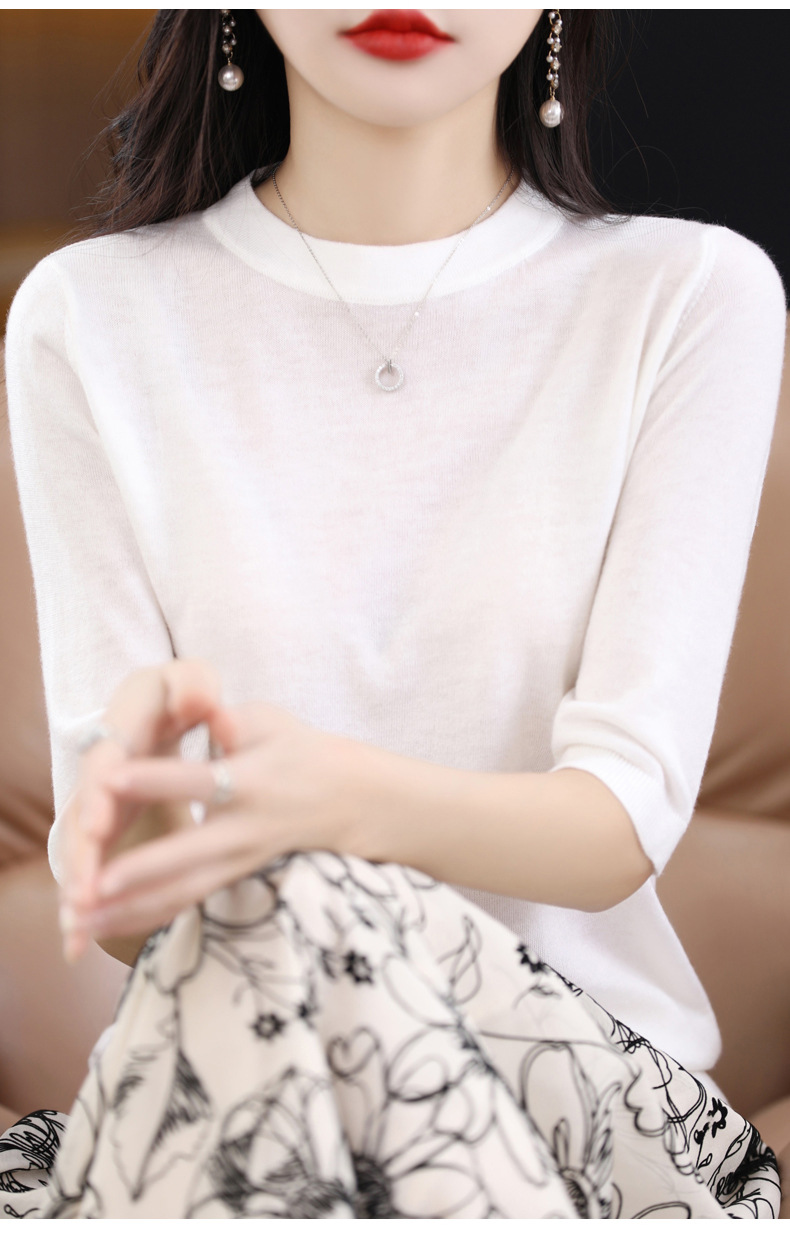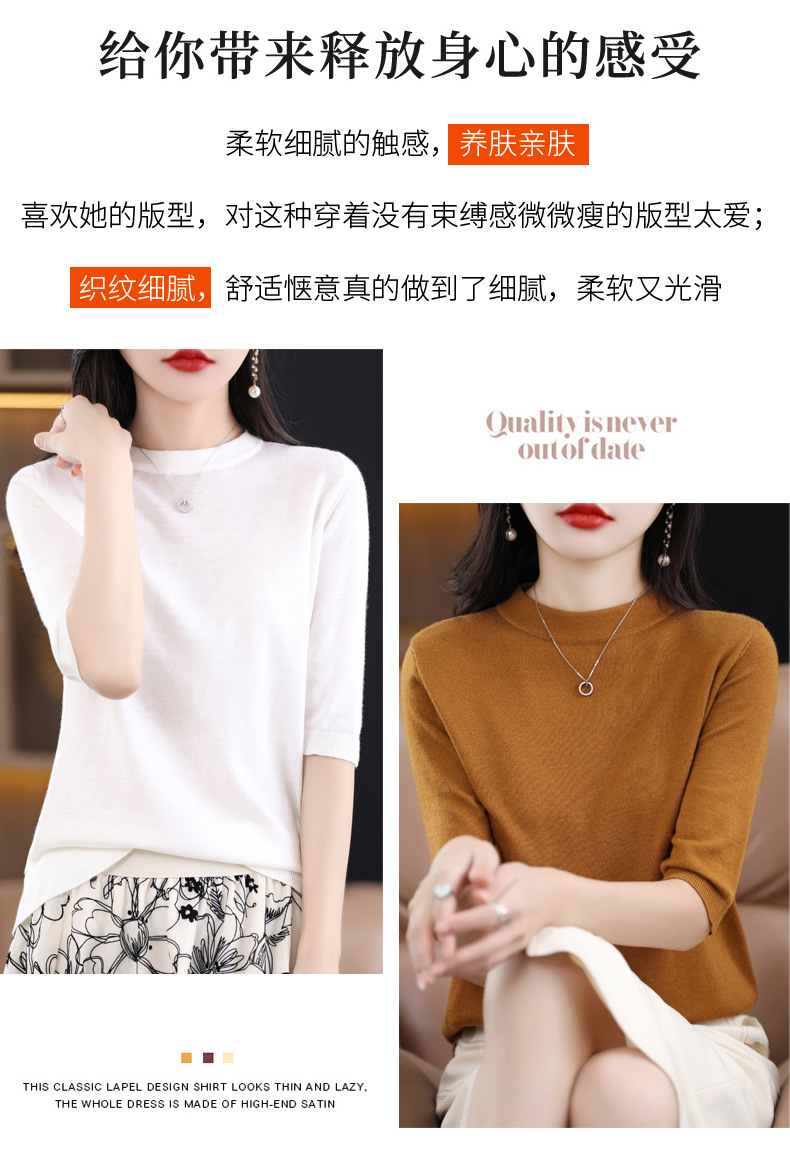 QHJY-202311春款半袖精纺羊毛衫宽松打底衫五分袖针织衫中袖薄款毛衣