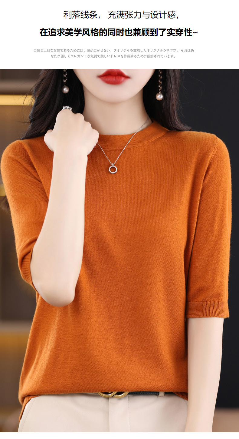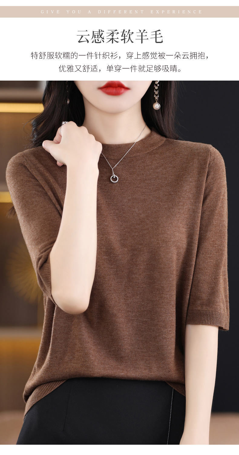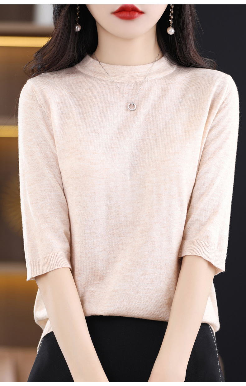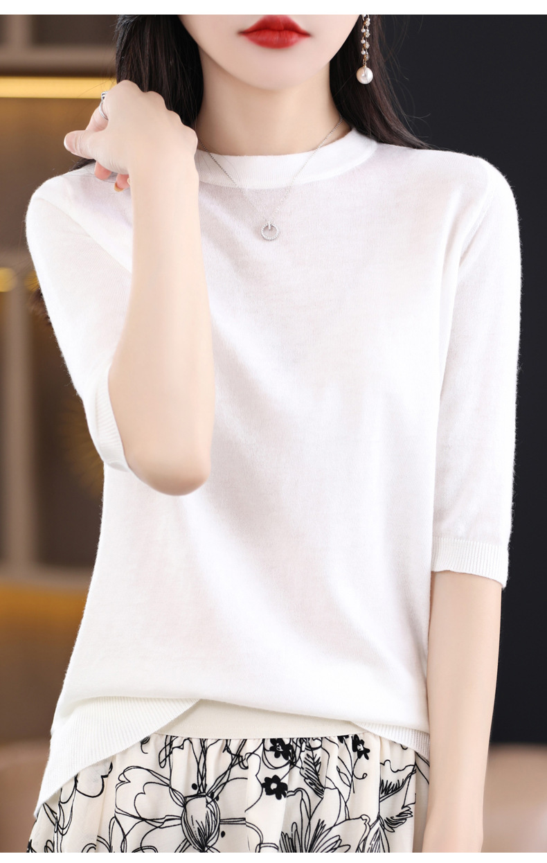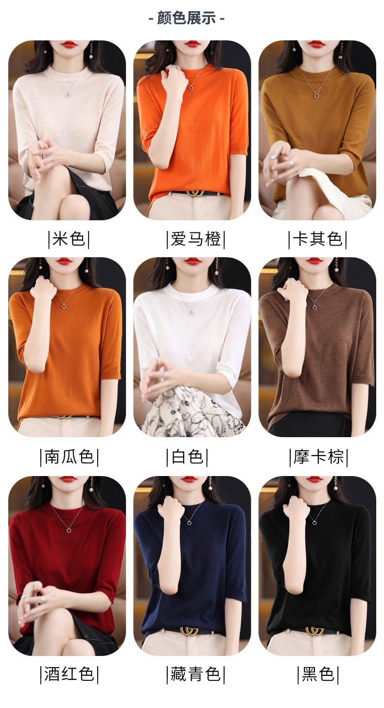 QHJY-202311春款半袖精纺羊毛衫宽松打底衫五分袖针织衫中袖薄款毛衣