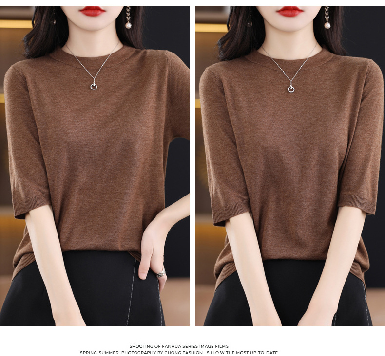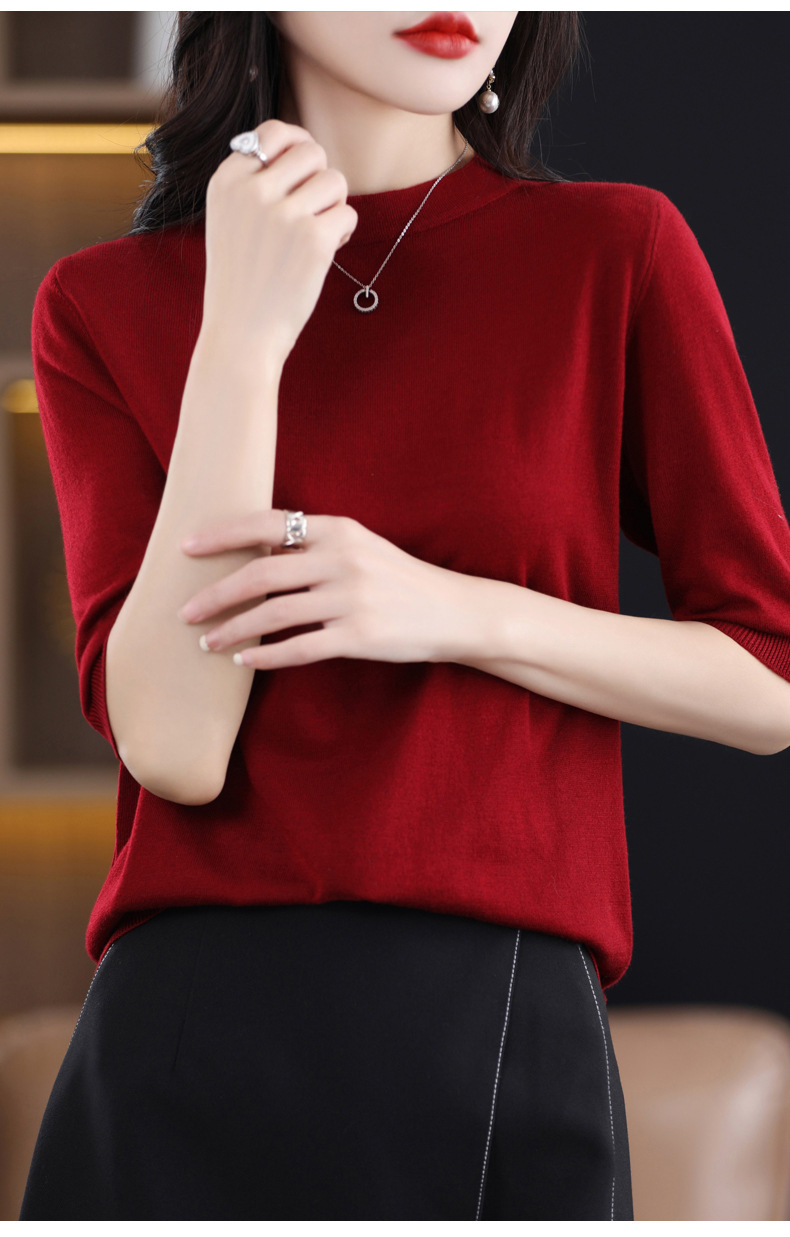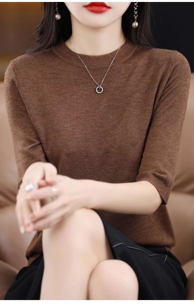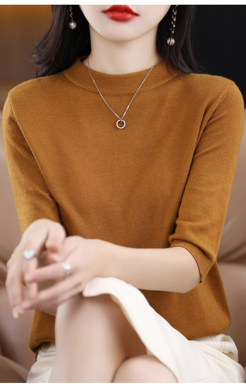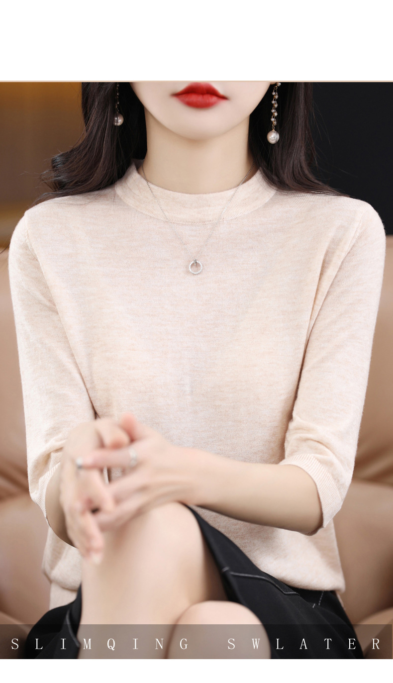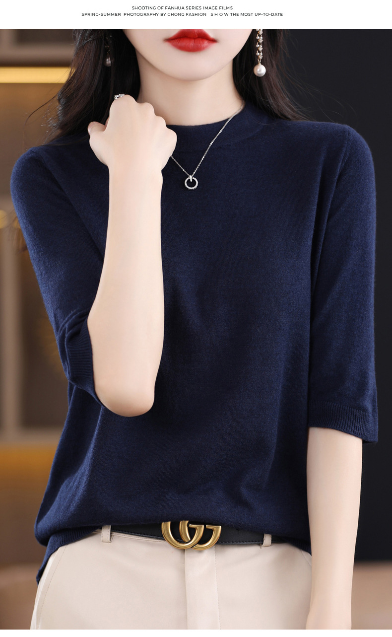 QHJY-202311春款半袖精纺羊毛衫宽松打底衫五分袖针织衫中袖薄款毛衣