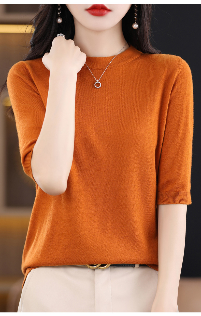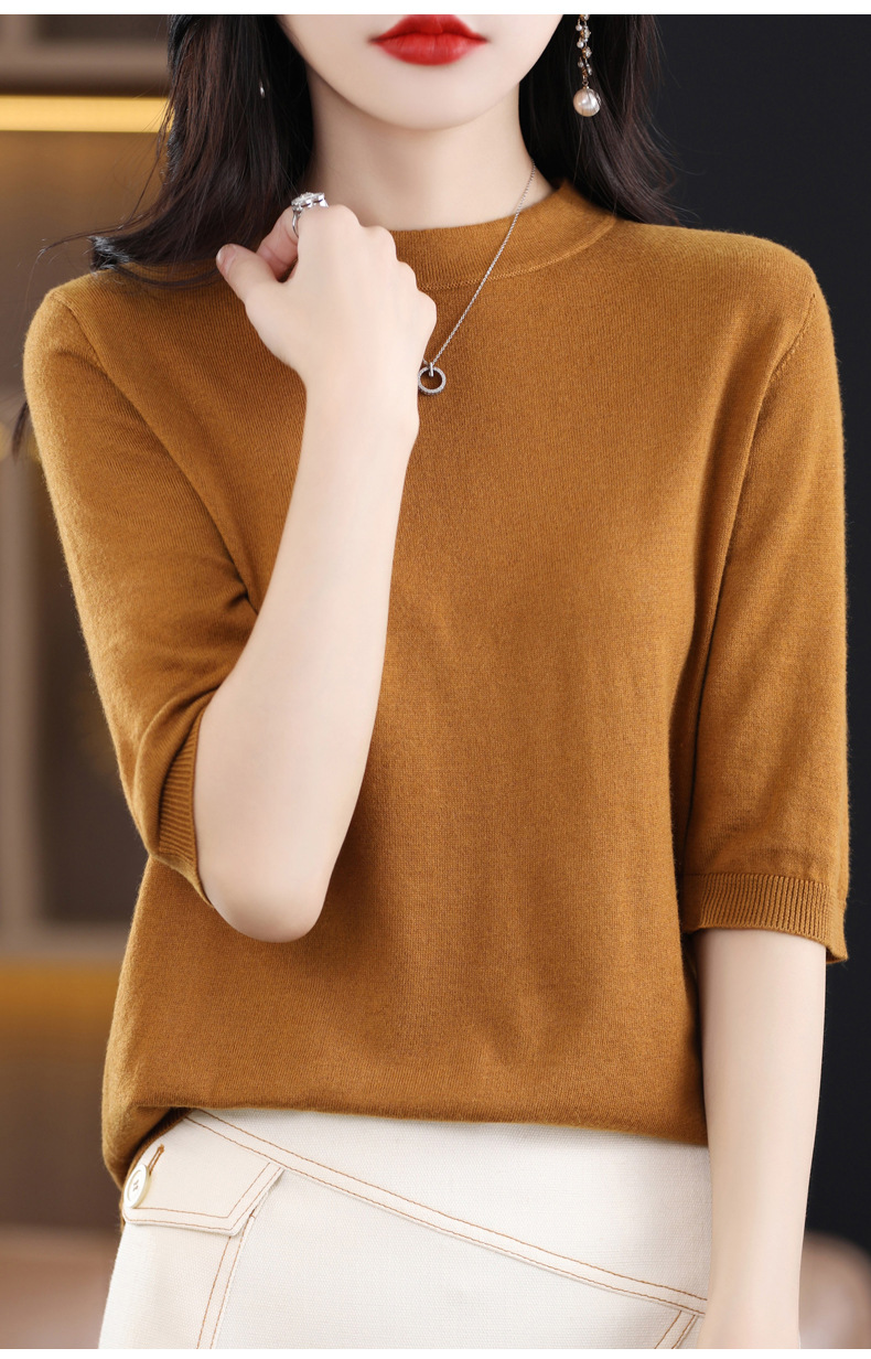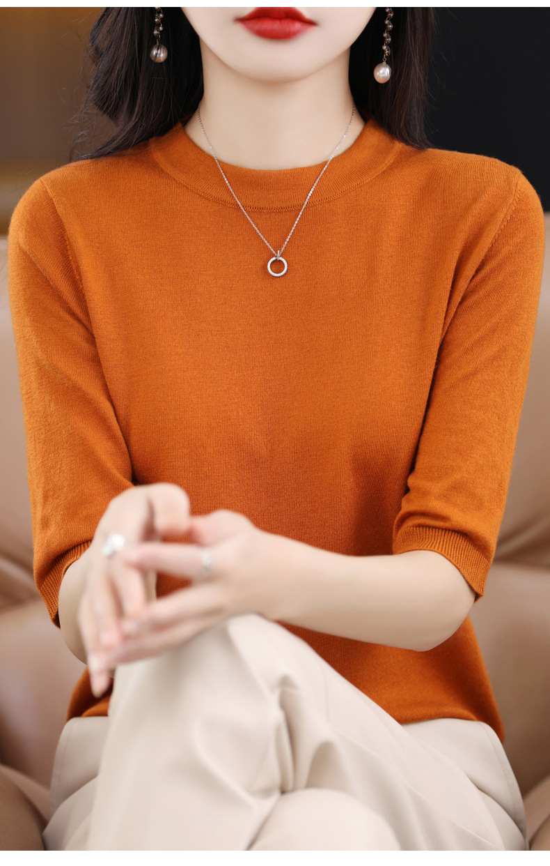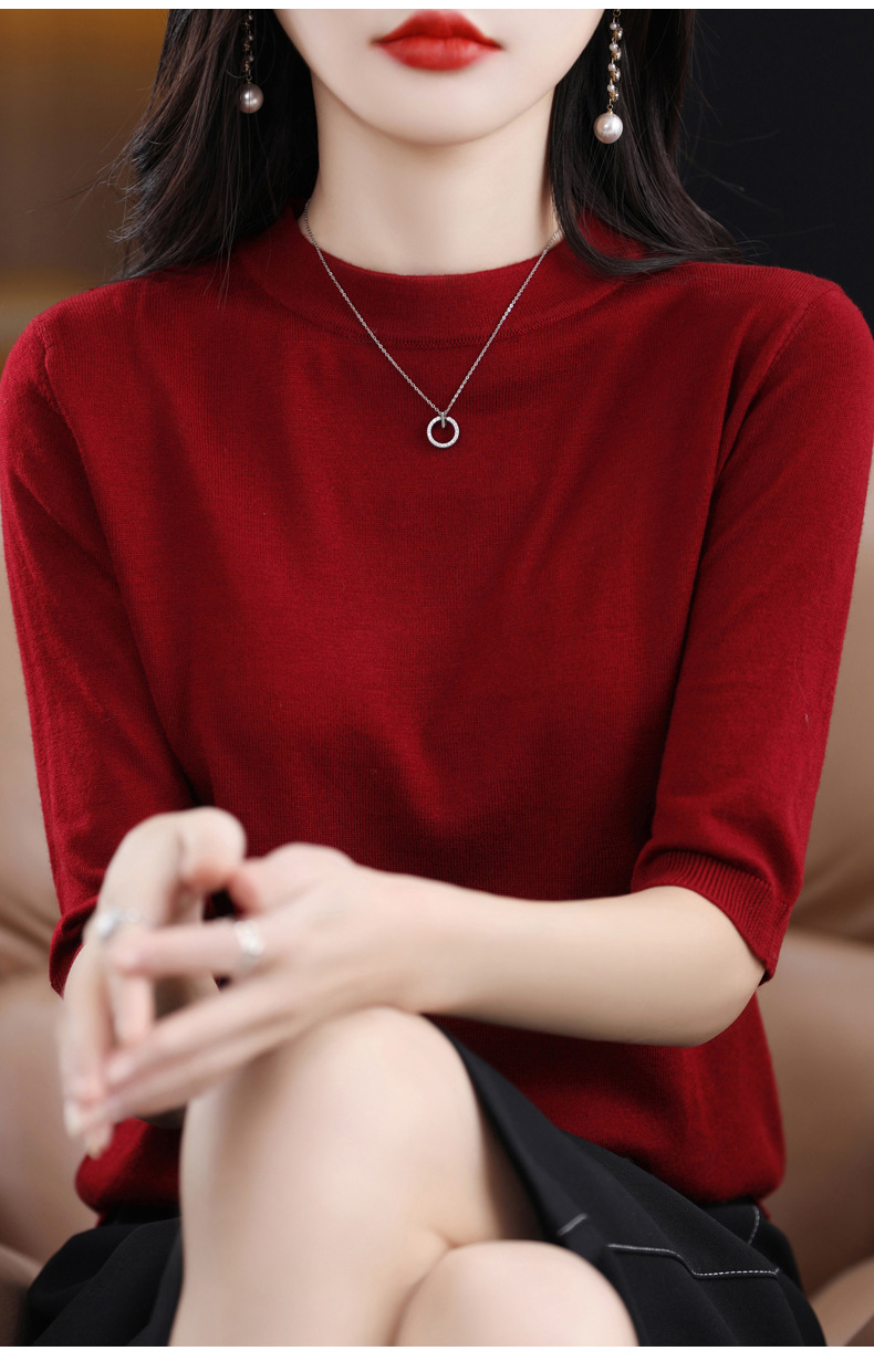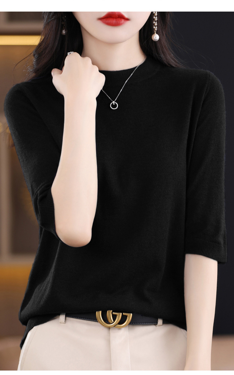 QHJY-202311春款半袖精纺羊毛衫宽松打底衫五分袖针织衫中袖薄款毛衣