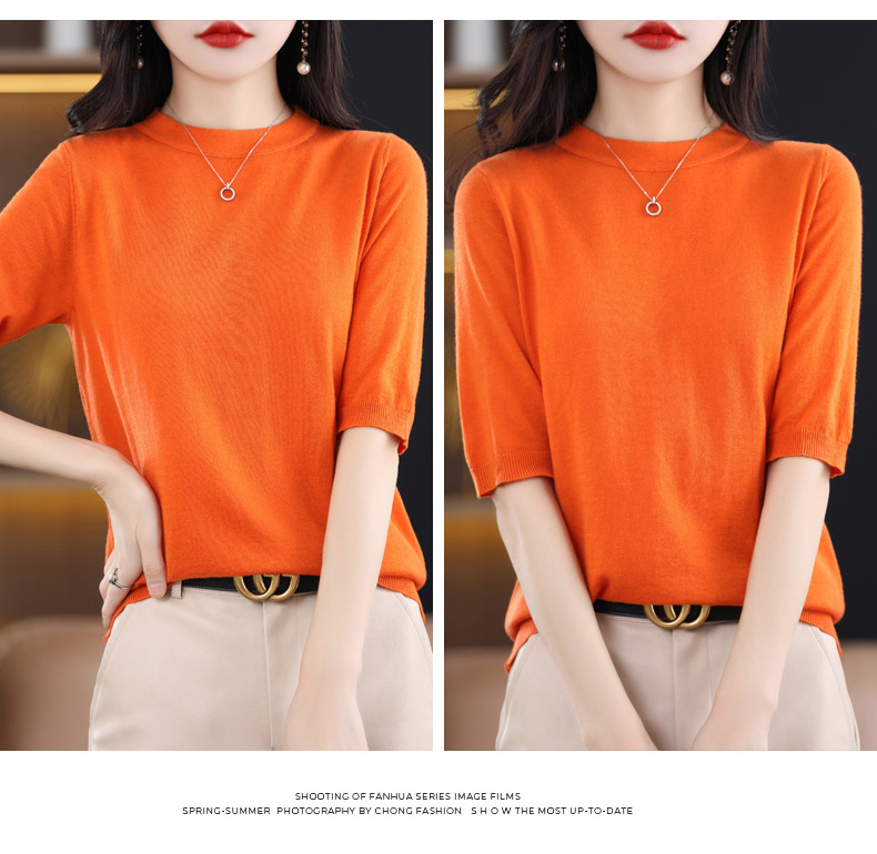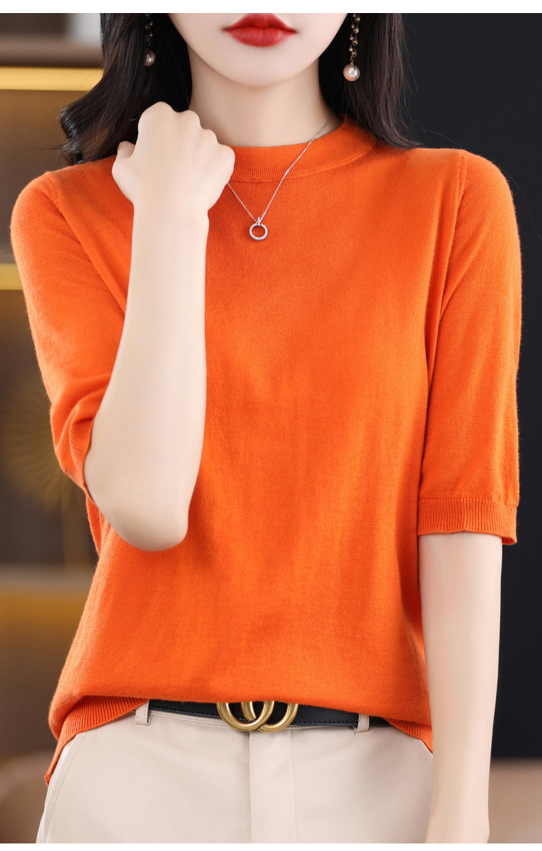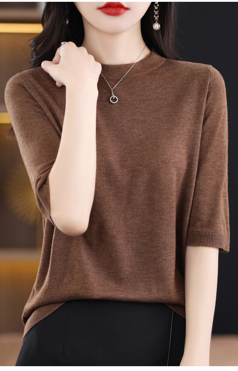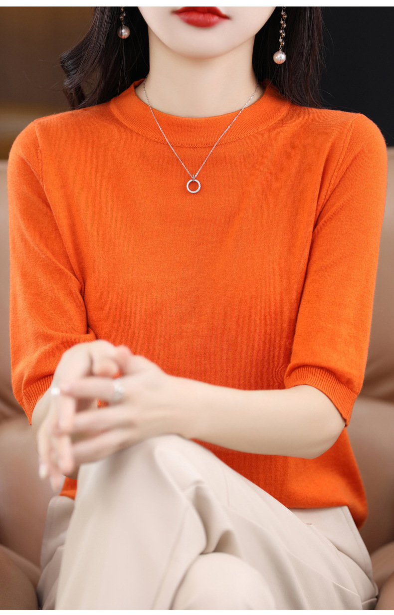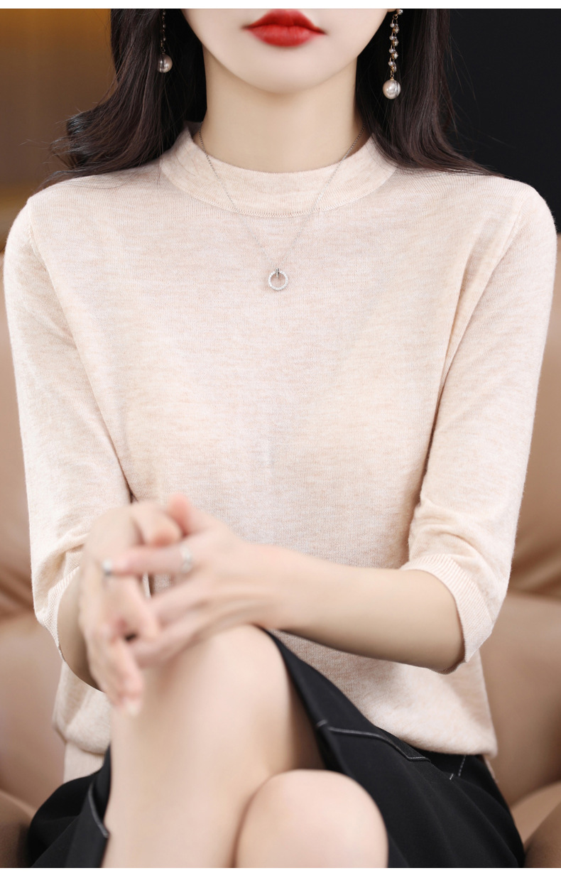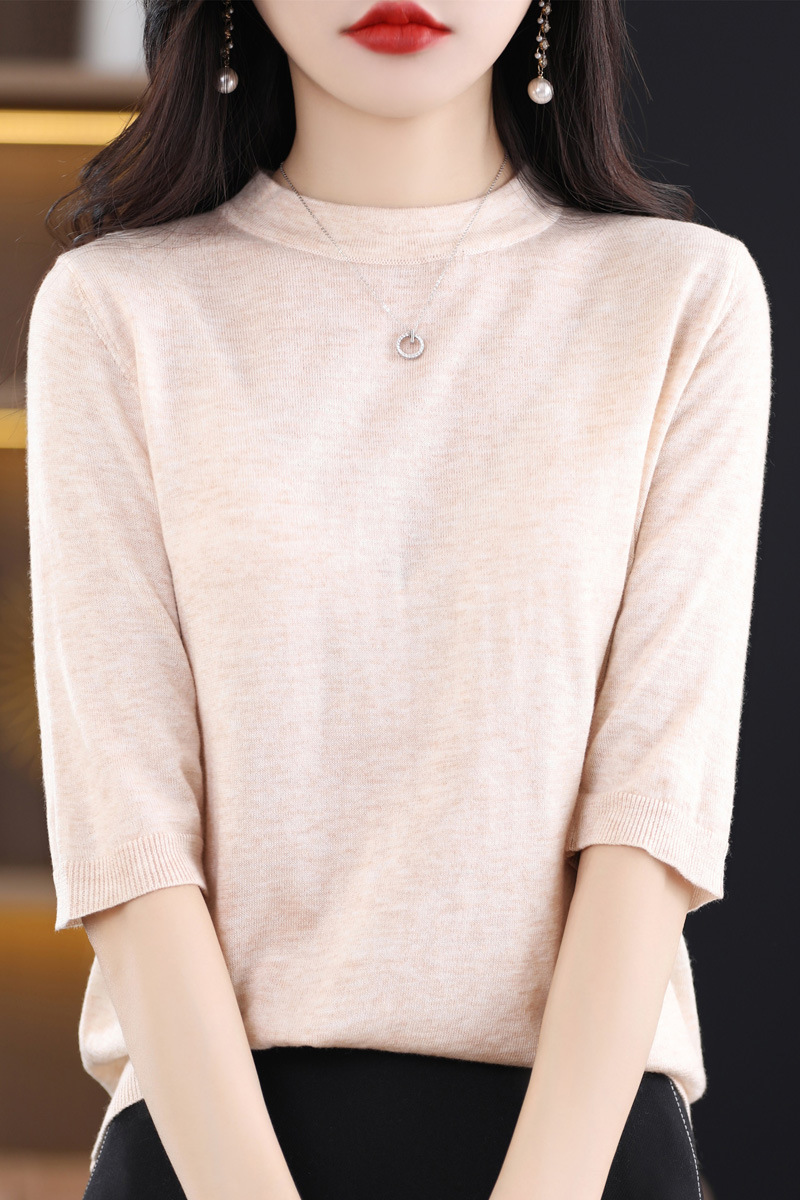 QHJY-202311春款半袖精纺羊毛衫宽松打底衫五分袖针织衫中袖薄款毛衣
