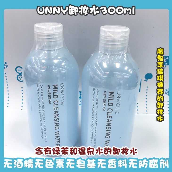 韩国矿物质UNNY卸妆水300ml👍超级温和的卸妆水来啦,魔鬼李佳琪推荐❗猪猪女孩们🐽都可以试试哦,平价中的战斗机😈。含有丰富矿物质,绿茶🍵和温泉水🥚的卸妆水,水倒在化妆棉在脸上擦一擦😇,面部柔软无比~一下子哗啦啦的粉底液睫毛膏啥的都掉下来啦😜!接近眼泪ph值 ,无刺痛感✅。无酒精无色素无皂基无香料无防腐剂,💁痘痘肌敏感肌妥妥用~