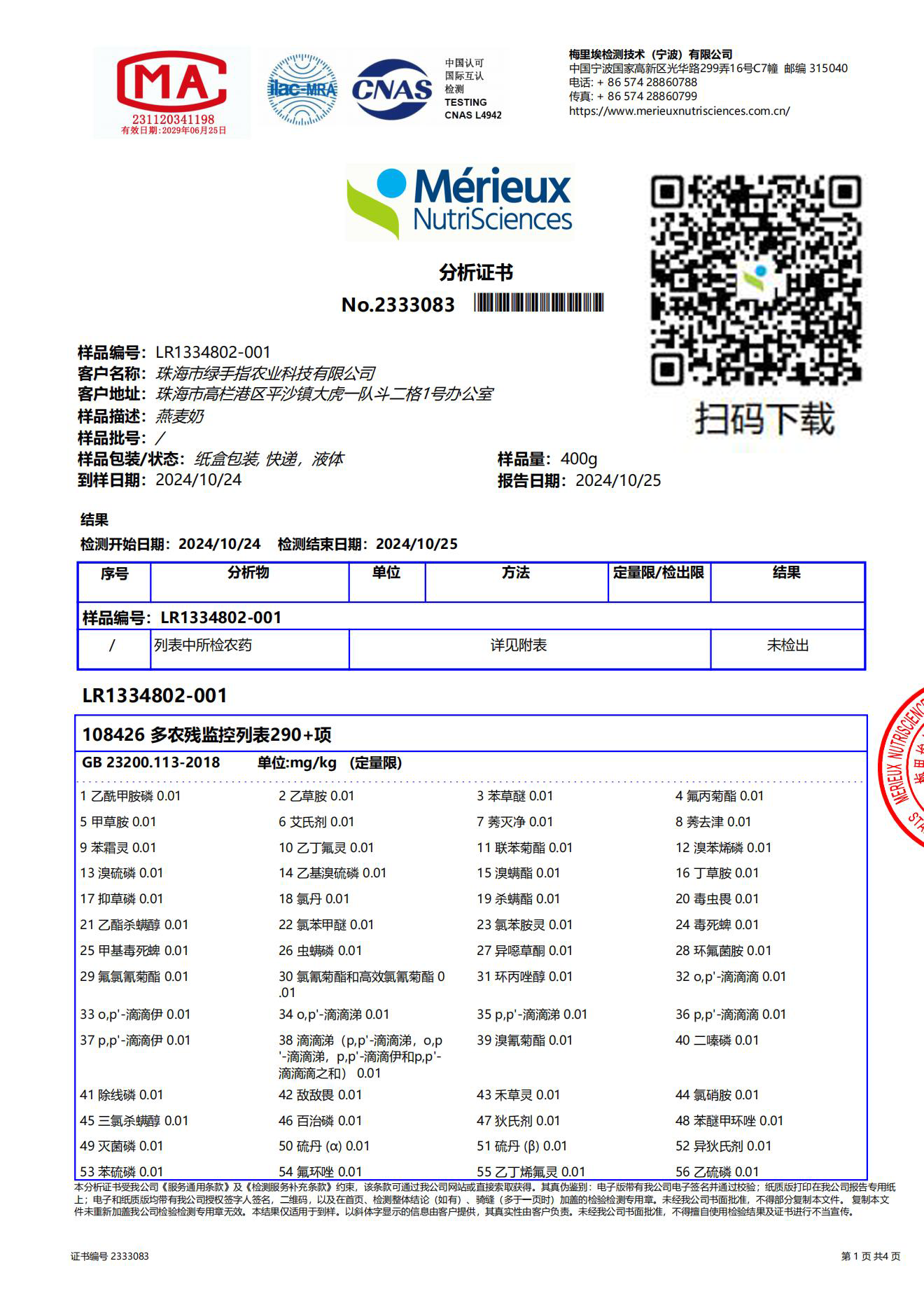 这款产品不仅原料燕麦是有机的,全程真有机,加工过程零添加。农场拿到产品后,也送去化验单位检验,结果不失所望——290项+农残检测,未检出。
