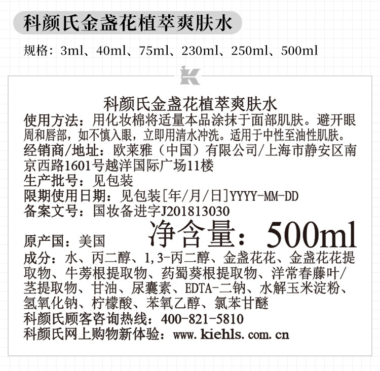 科颜氏(Kiehl’s)金盏花植萃爽肤水护肤水收缩毛孔抗痘补水保湿