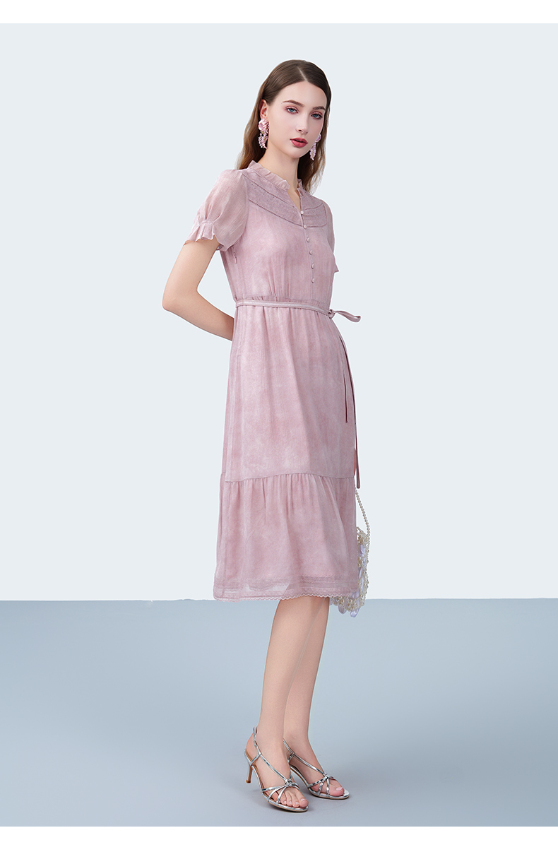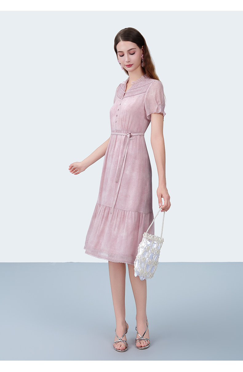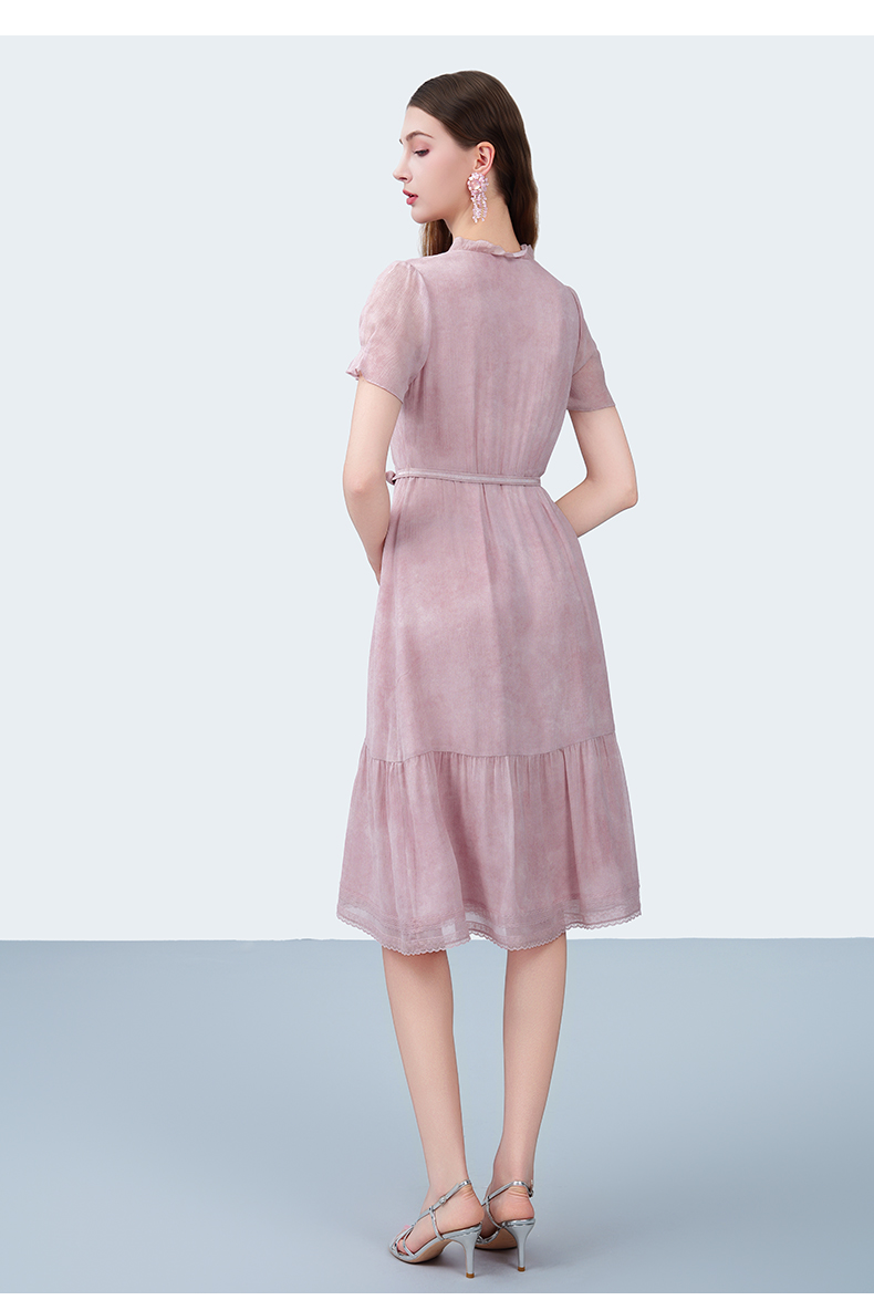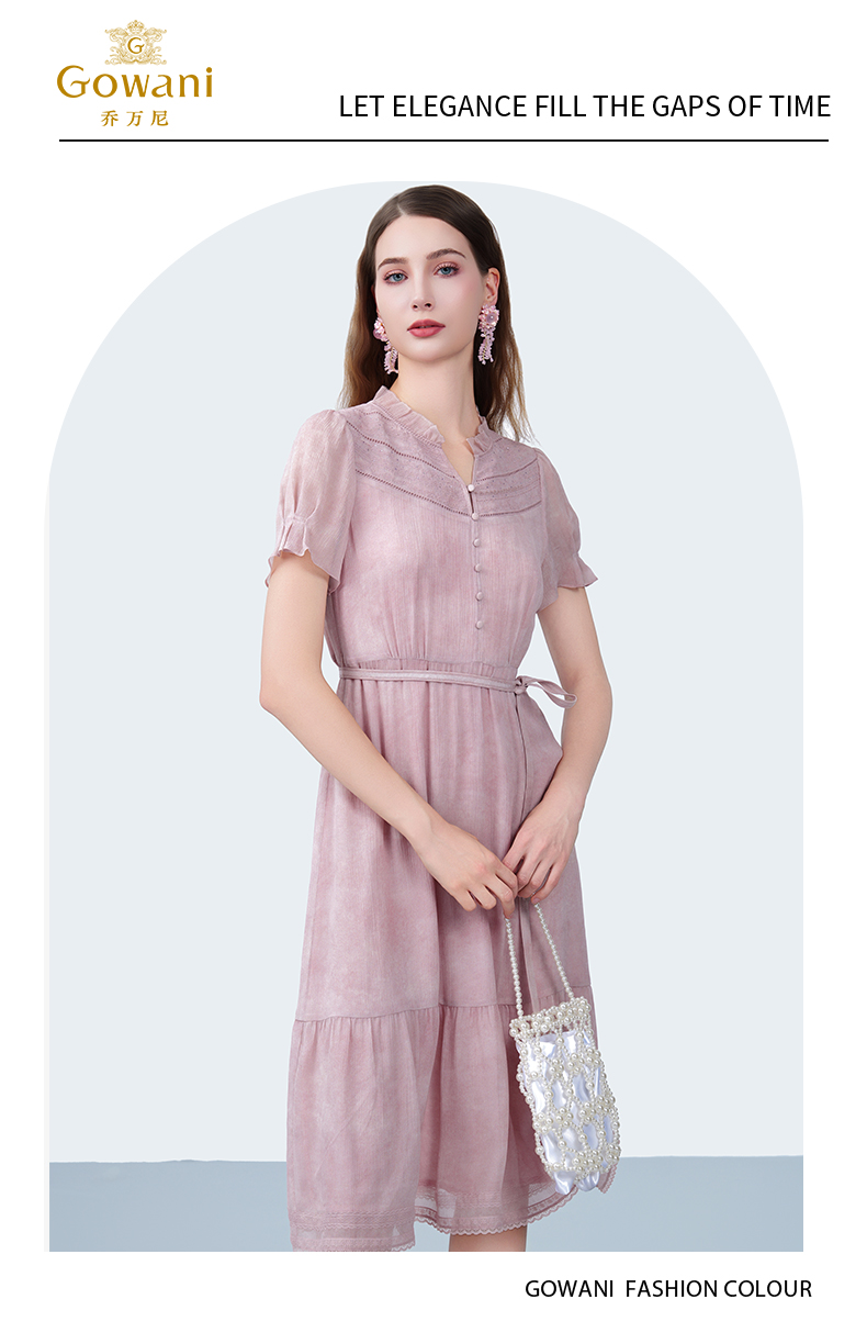 乔万尼新品2025100%真丝晕染浪漫木耳边V领收腰连衣裙ED2E408