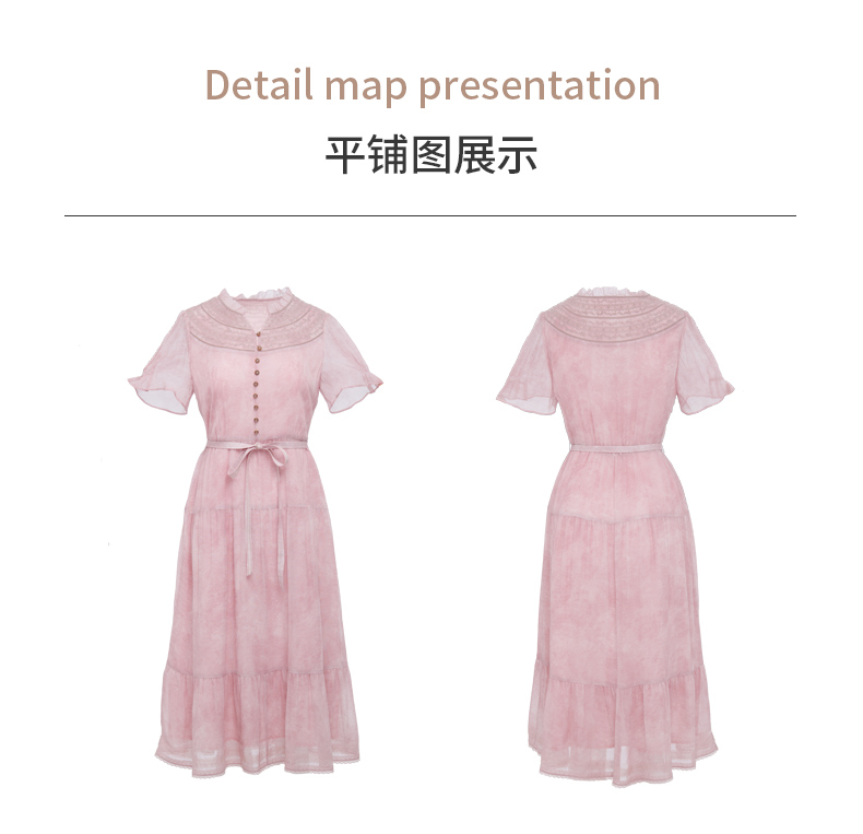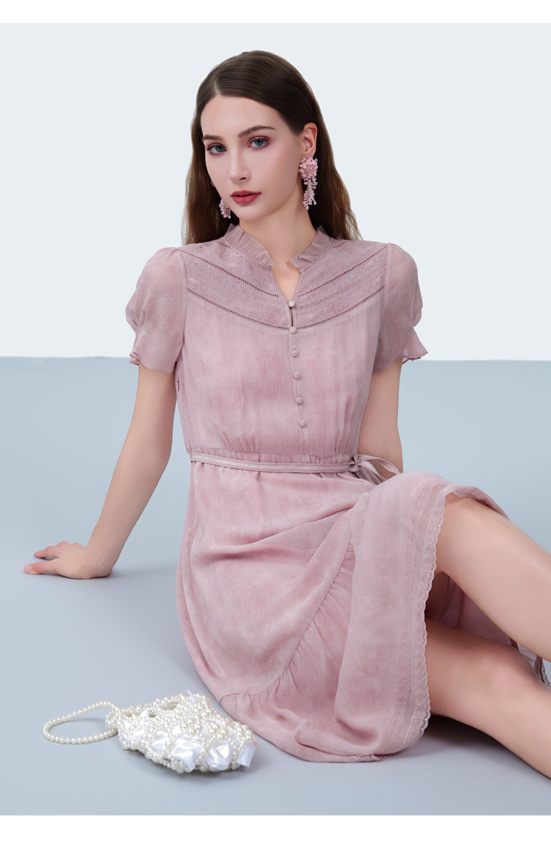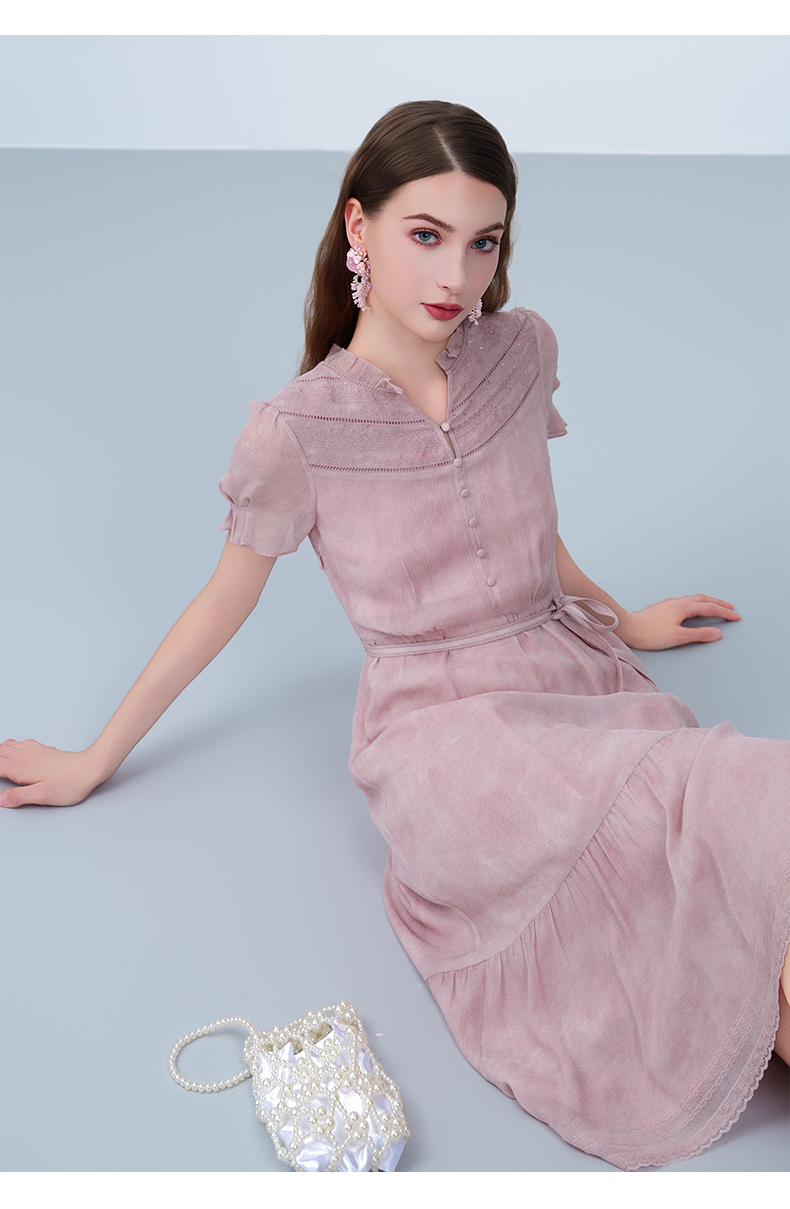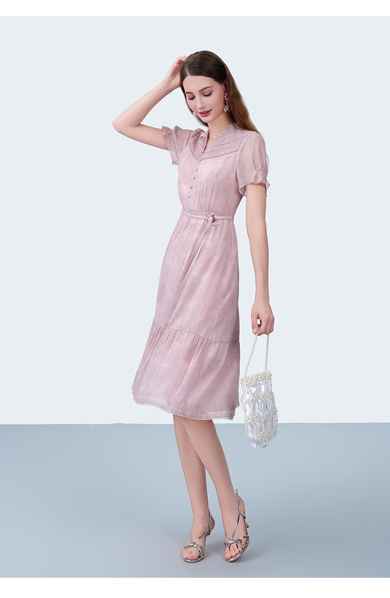 乔万尼新品2025100%真丝晕染浪漫木耳边V领收腰连衣裙ED2E408