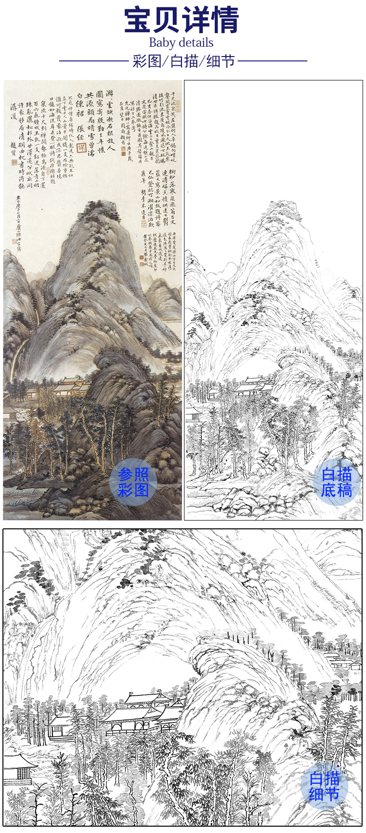 竖幅工笔画山水白描底稿-金城-《临陈汝言百丈泉图》-多种白描尺寸可选-JS05