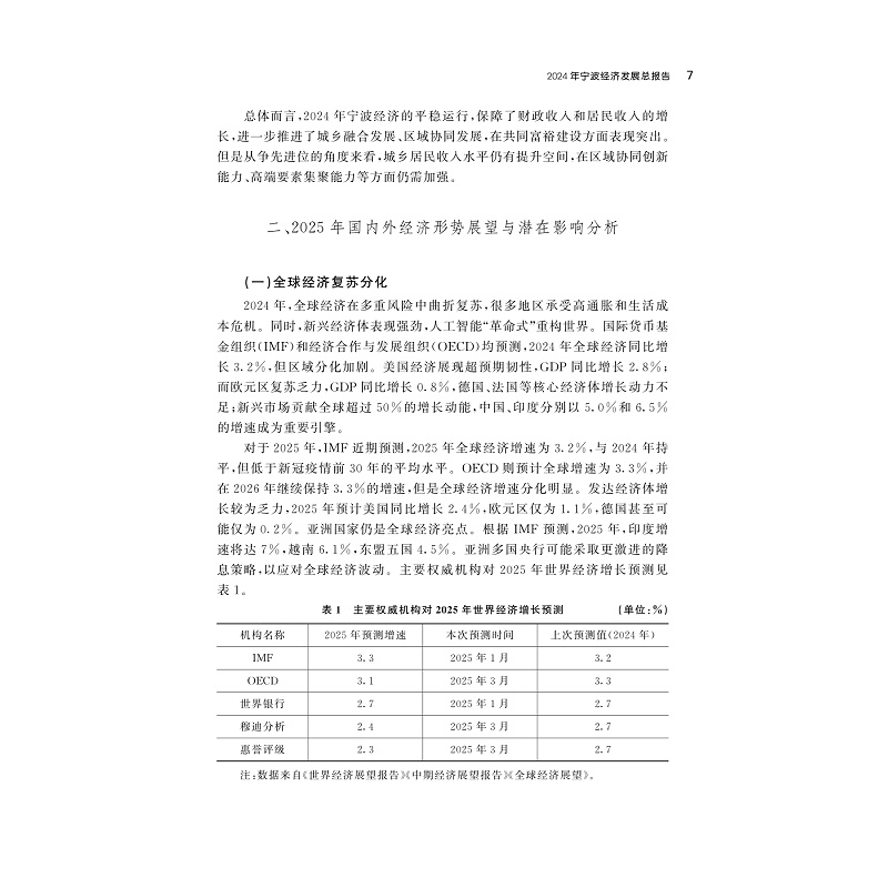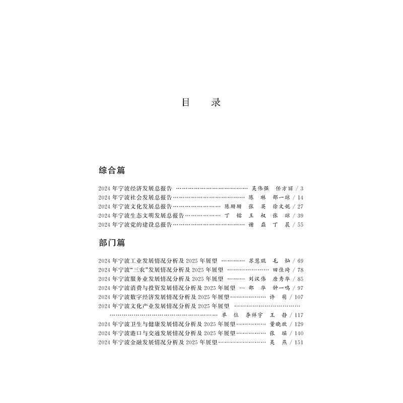 本书是宁波市社会科学院(宁波市社会科学界联合会)深入贯彻习近平新时代中国特色社会主义思想,强化并推进学科体系、学术观点和研究方法创新,集中组织各区县(市)、全市高校、研究机构、各行业(产业)等部门的优秀专家学者编写的一部服务于宁波经济社会发展的年度研究报告。全书通过对2024年宁波市经济、社会、文化、生态、党建等基本情况进行总结和评估,对2025年的发展趋势进行研判和预测,为各级党委政府科学决策提供理论支持,为社会组织和公众提供有价值的信息,既具有全局性、战略性和理论性,又具有前瞻性、专业性和务实性。