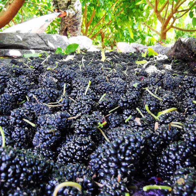桑葚成熟的时候,在树下铺上塑料布,将成熟桑葚摇落,未成熟的会挂在树梢继续生长,留待它们熟透后,再一次摇落,桑葚成熟期有将近一个月时间,这一个月时间内,需要多次进行采摘。