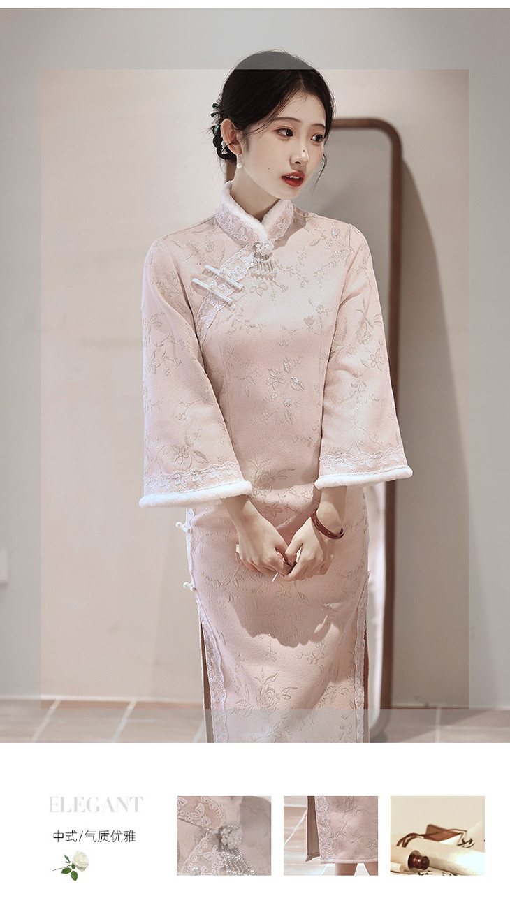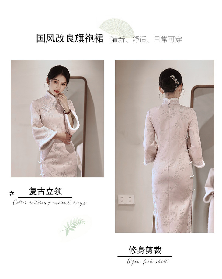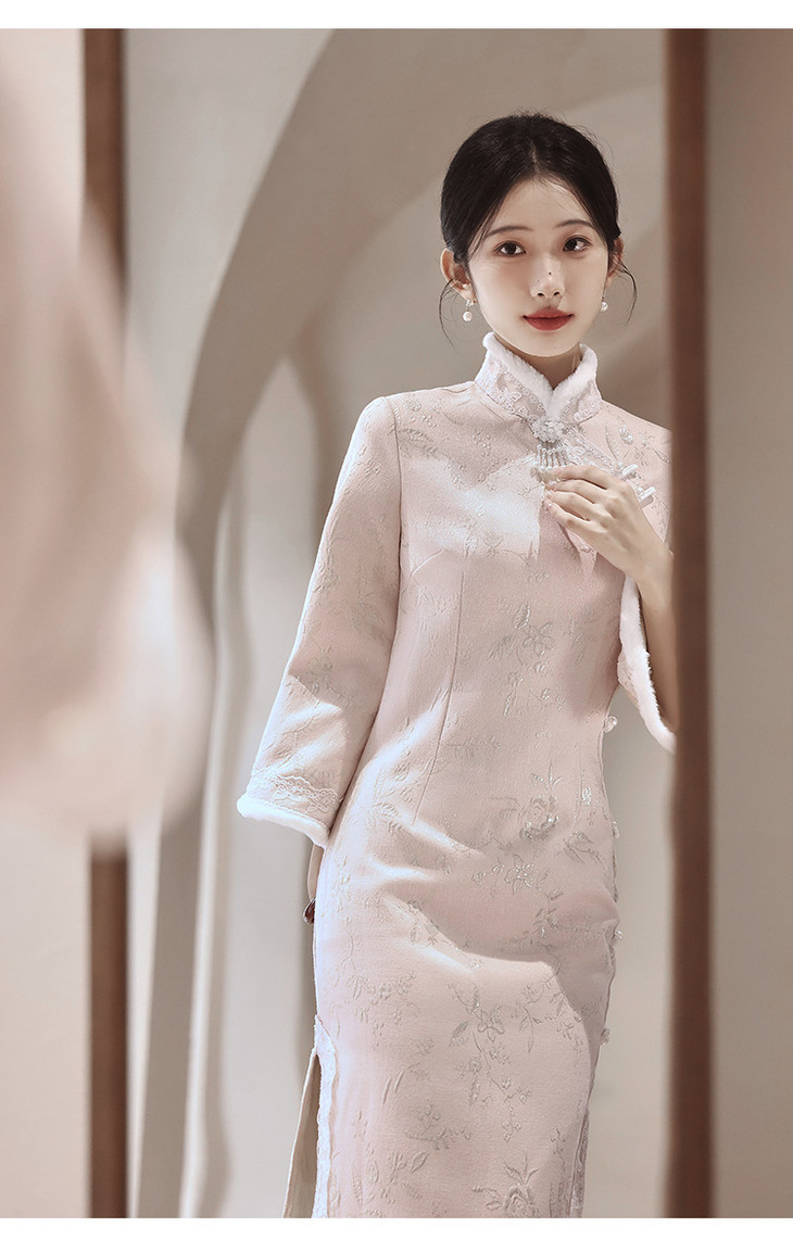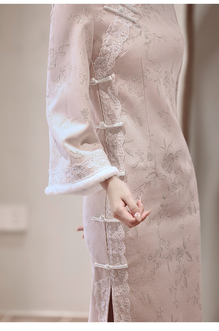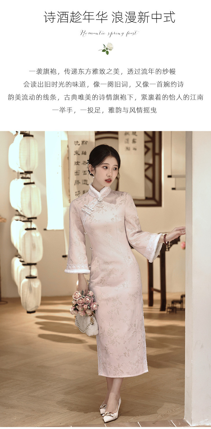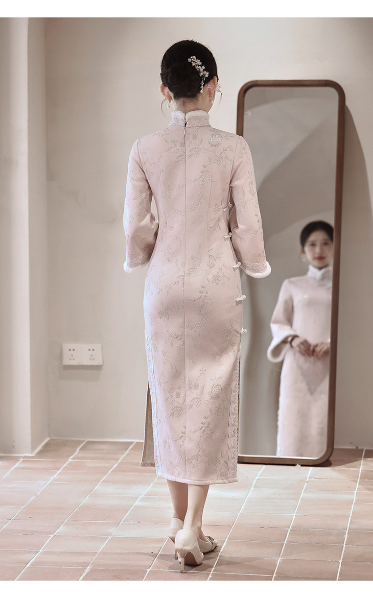 气质高级感,改良年轻款长款加绒厚款长袖粉色旗袍LBS2549