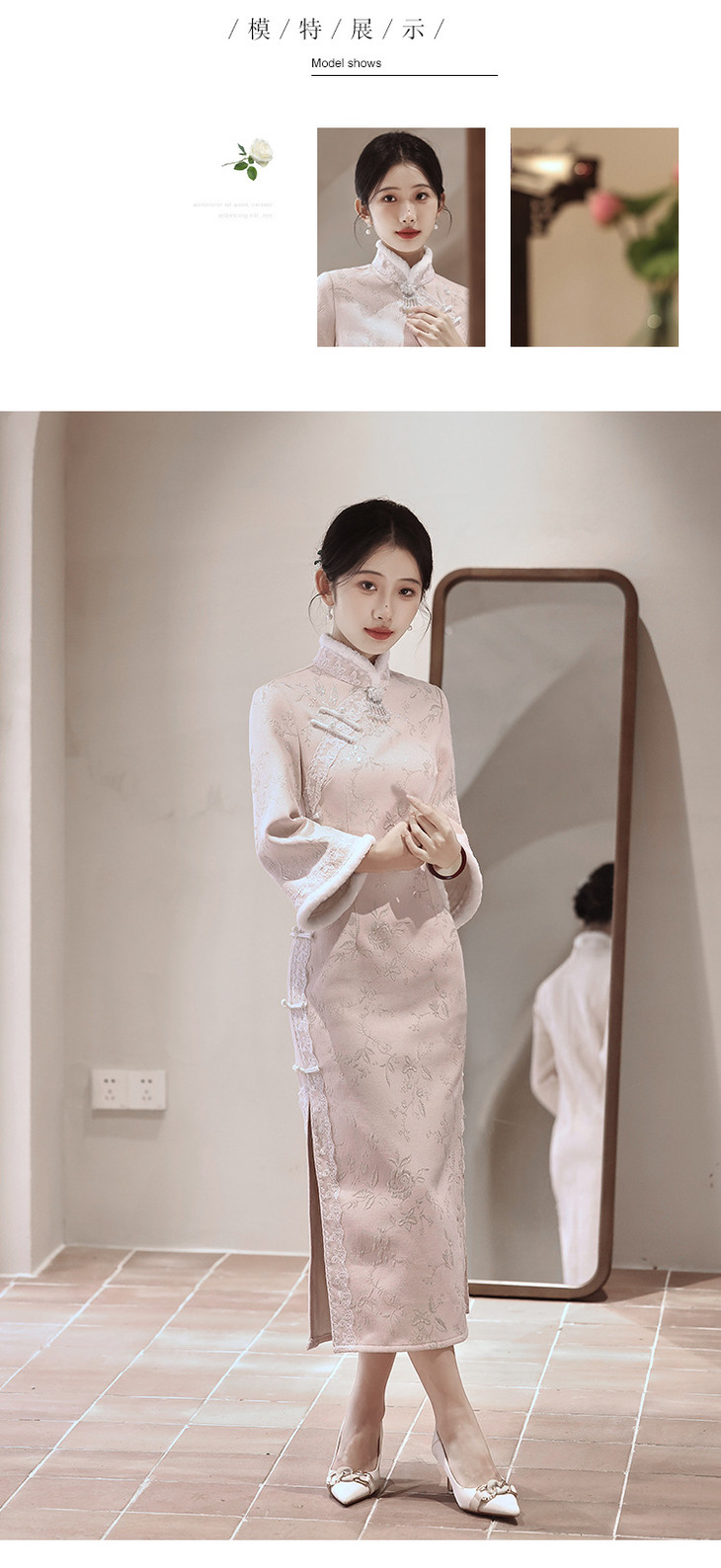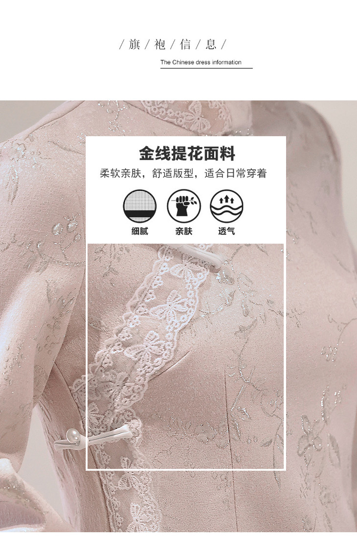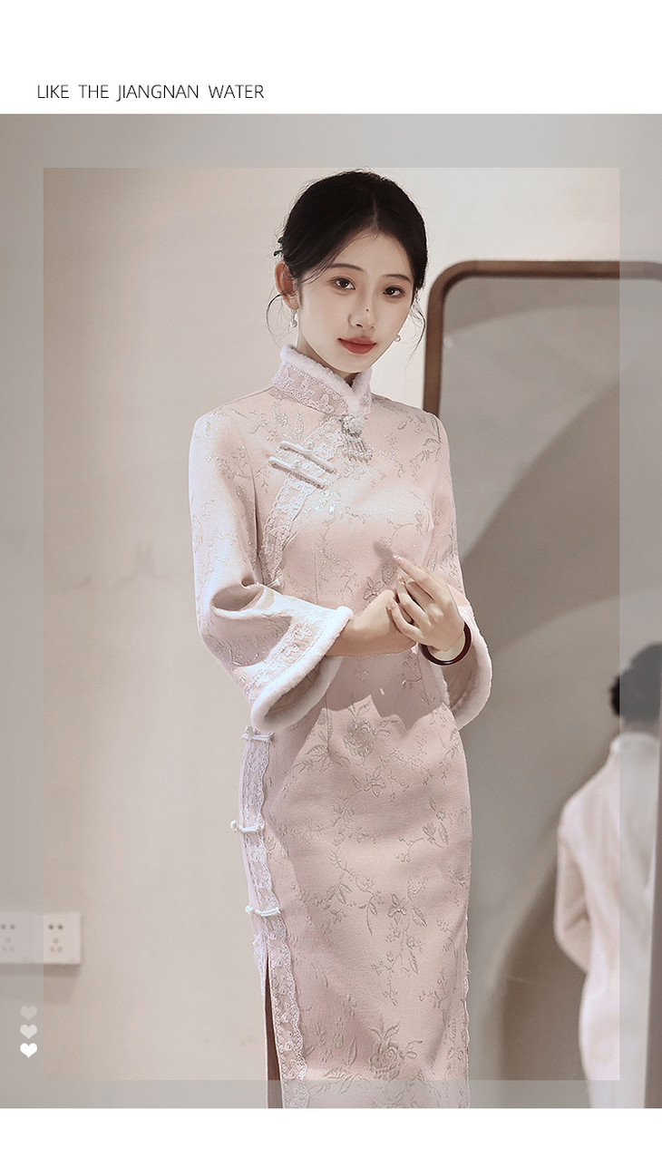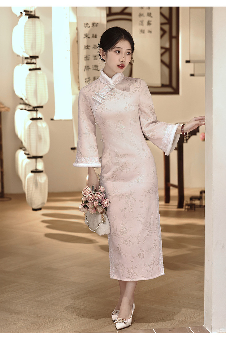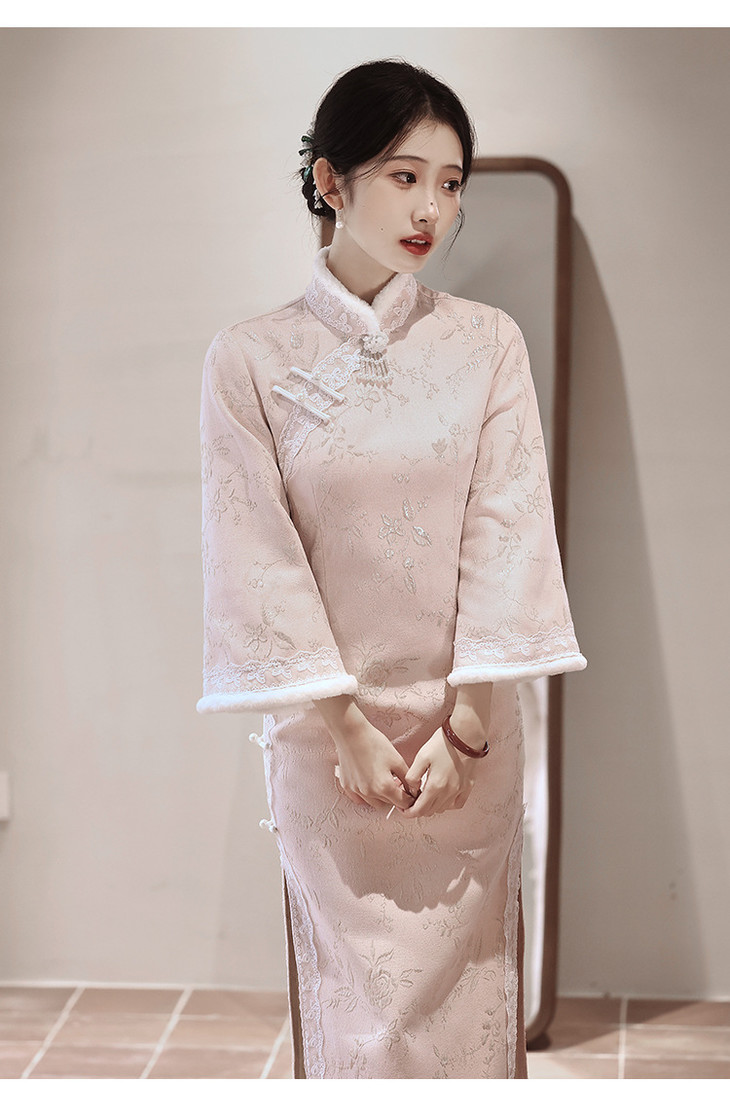 气质高级感,改良年轻款长款加绒厚款长袖粉色旗袍LBS2549
