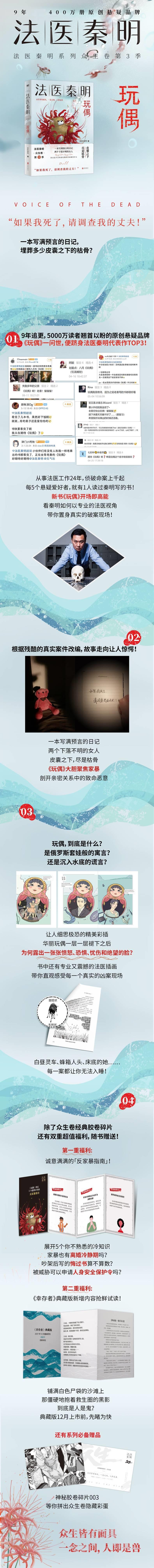 法医秦明系列是无数悬疑迷入坑的经典作品,此次出版的新书《玩偶》是系列的第9部,也是秦明积累沉淀后,充满诚意的高质量新作。从《尸语者》到《玩偶》,法医秦明以专业的法医视角,带你置身真实又震撼的案发现场,聆听解剖刀下的逝者之声。为生者权,为死者言!