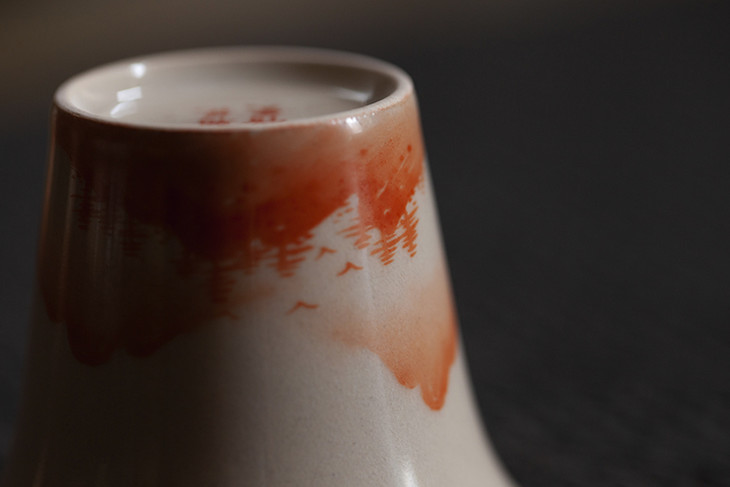 这只杯子的亮点和巧思在于它的矾红彩山水。