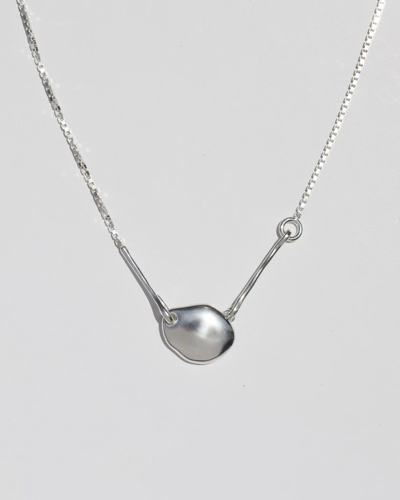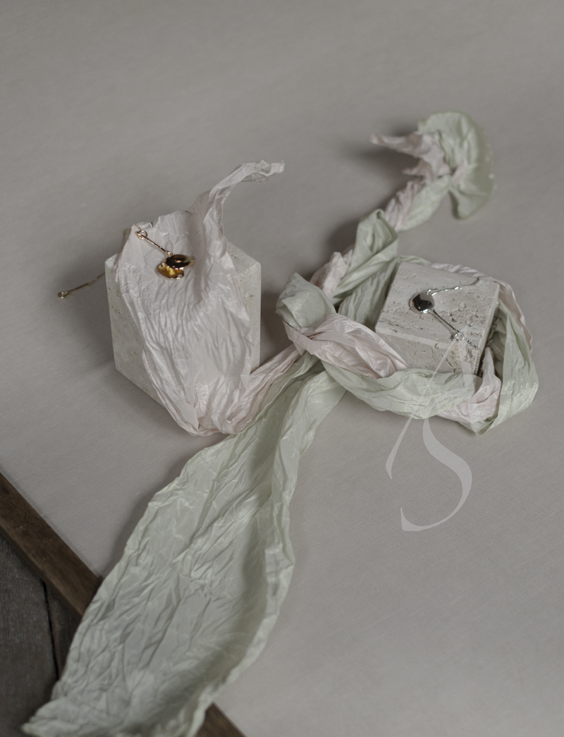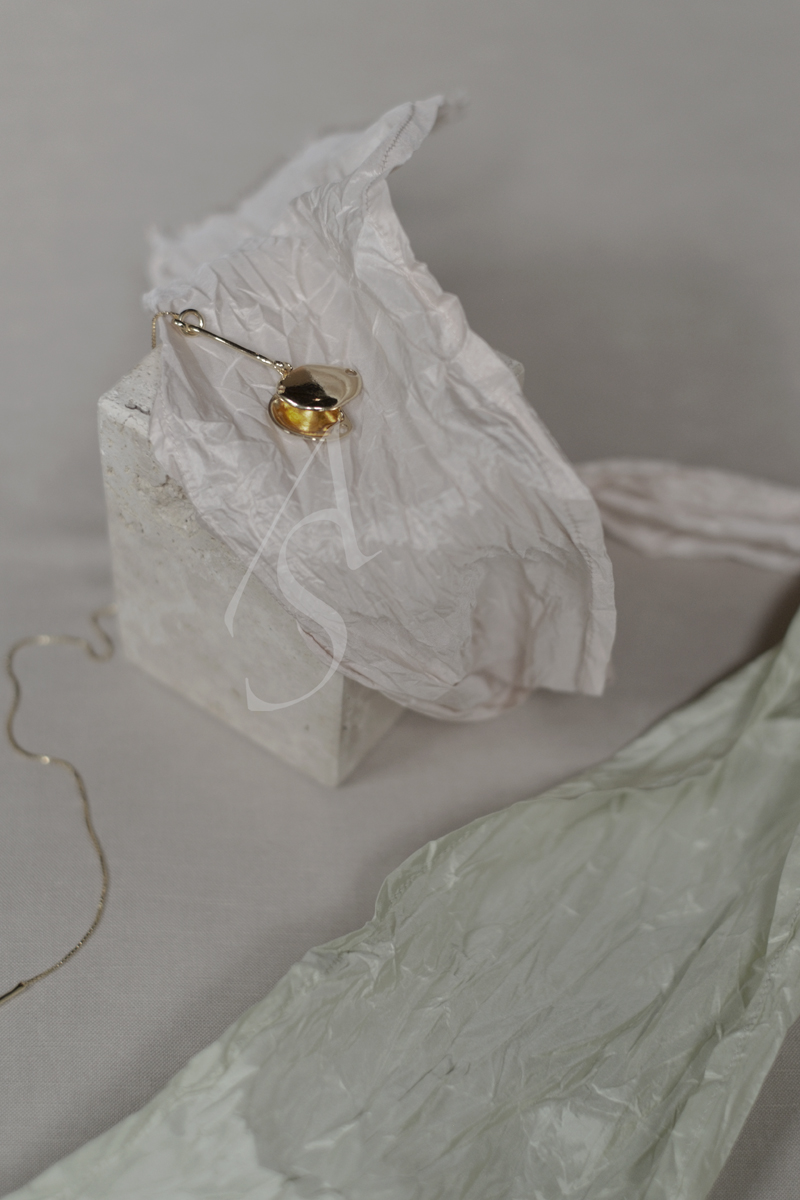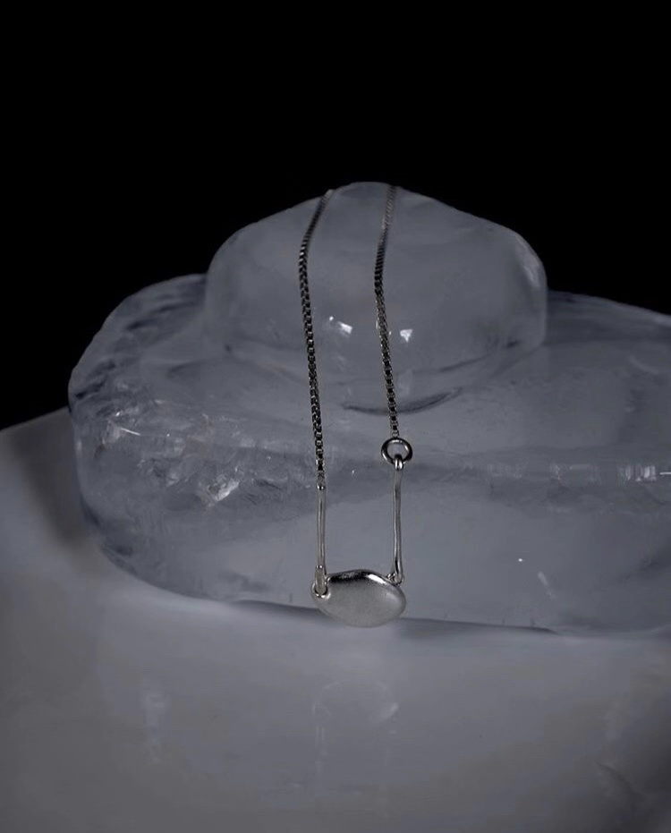 以旧式相片盒为灵感,佩戴时形状又如扇贝,构思精巧。制作工艺均手工完成,在暗光下也呈现光亮的色泽。