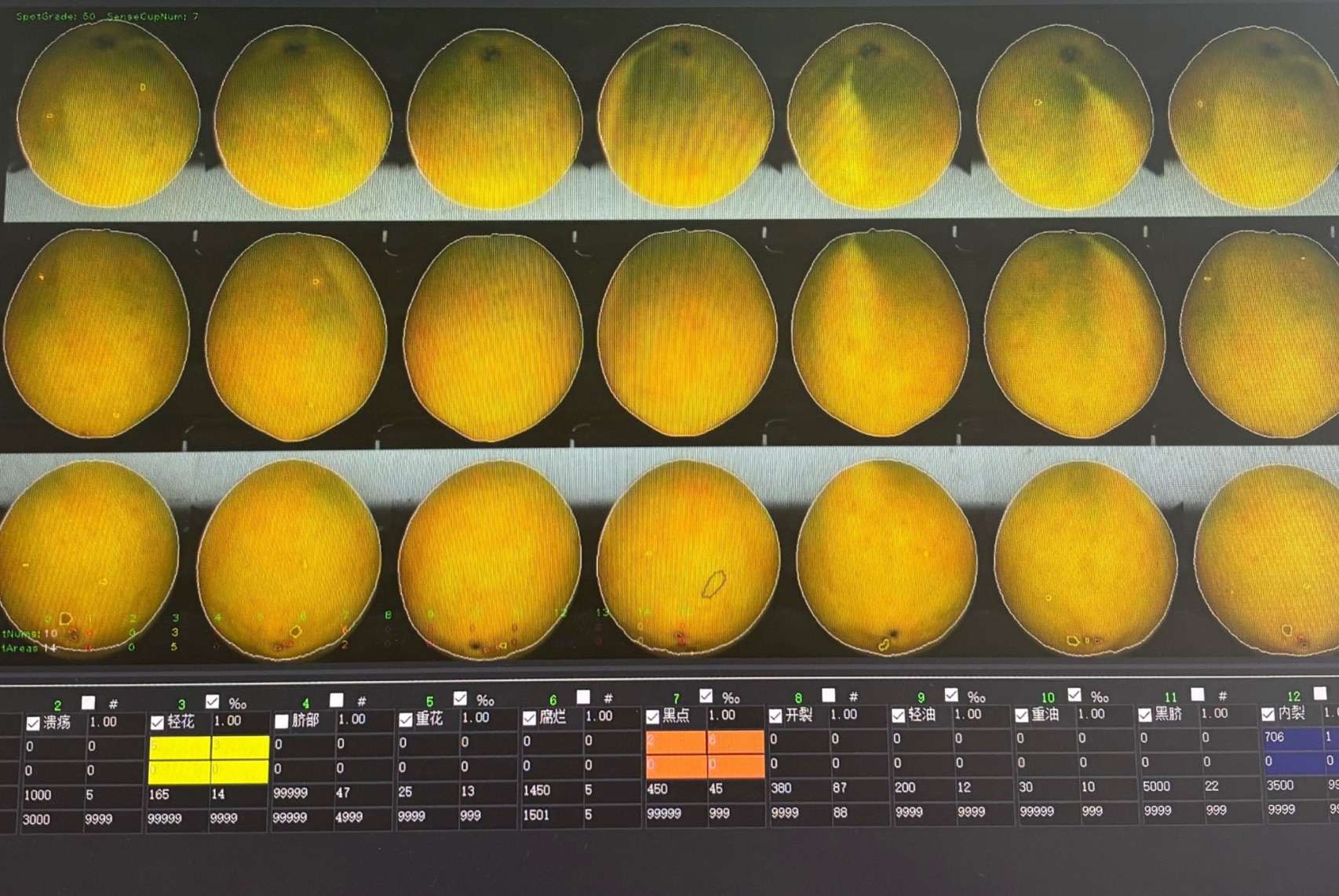 脐橙进入生产线后,全方位拍照无盲区,能够对脐橙外部的色泽、大小、克重、太阳斑、溃疡和内部的糖度、果肉损伤等情况做不同等级的精细化分级。
