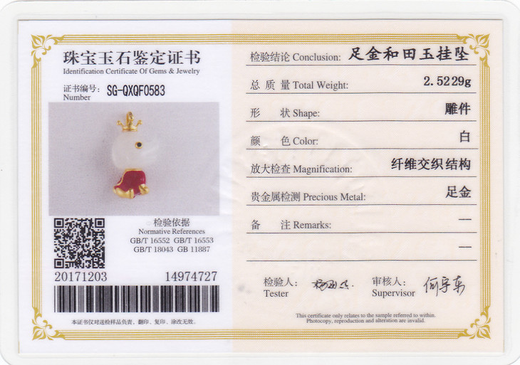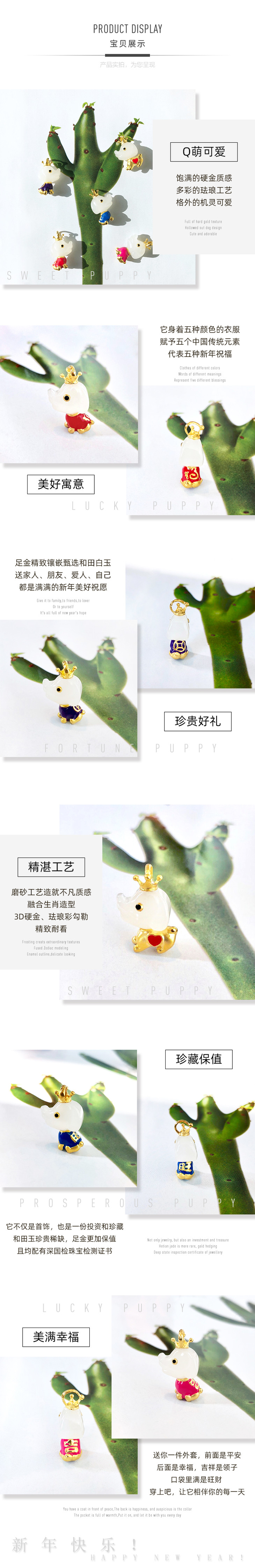 3D足金和田玉(白玉)吊坠-2018五福萌宠