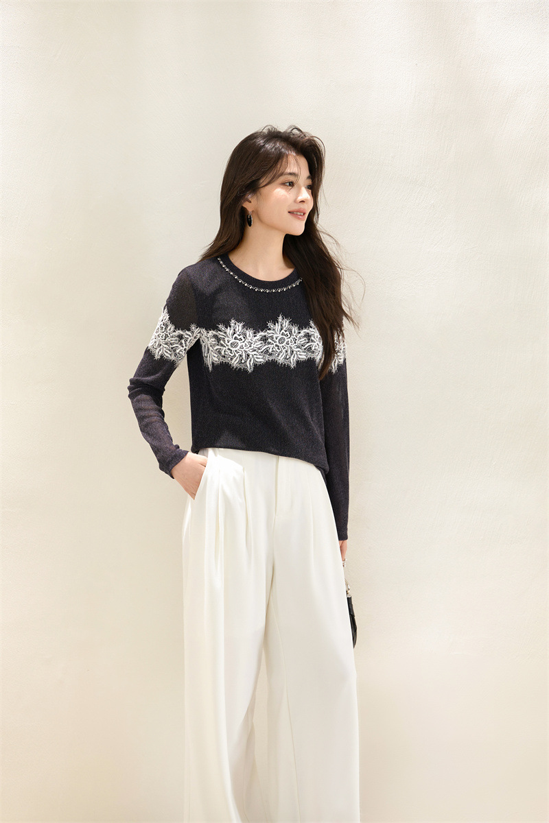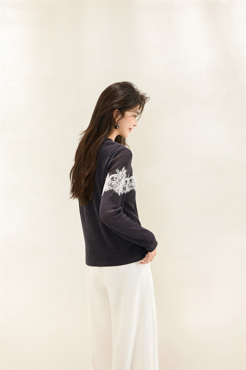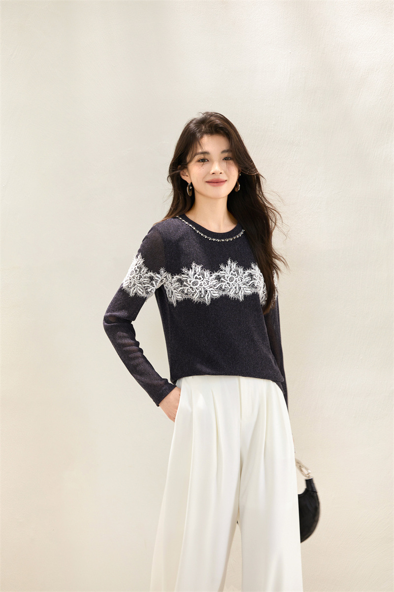 「自」全新升级【铂金会员165/天猫219/差价54】(13624)洛诗琳韩系圆领蕾丝拼接上衣2025秋季新款气质钉珠打底衫
