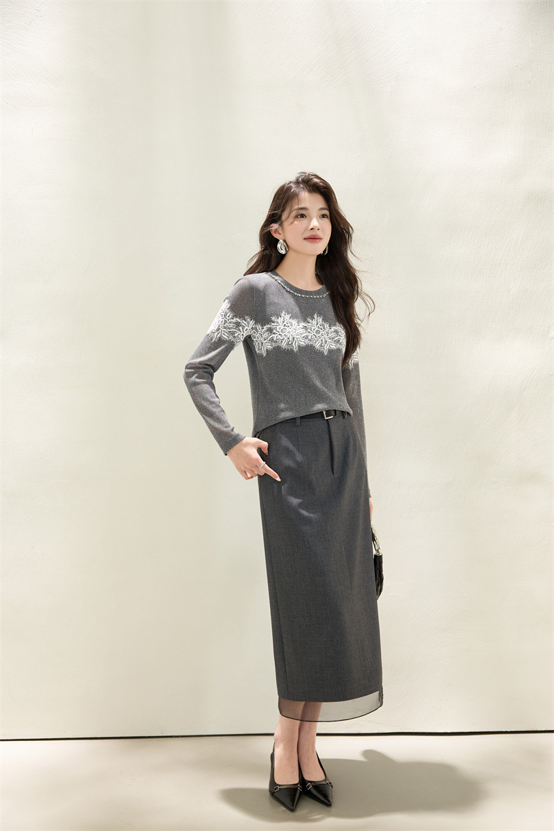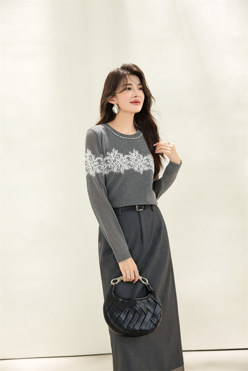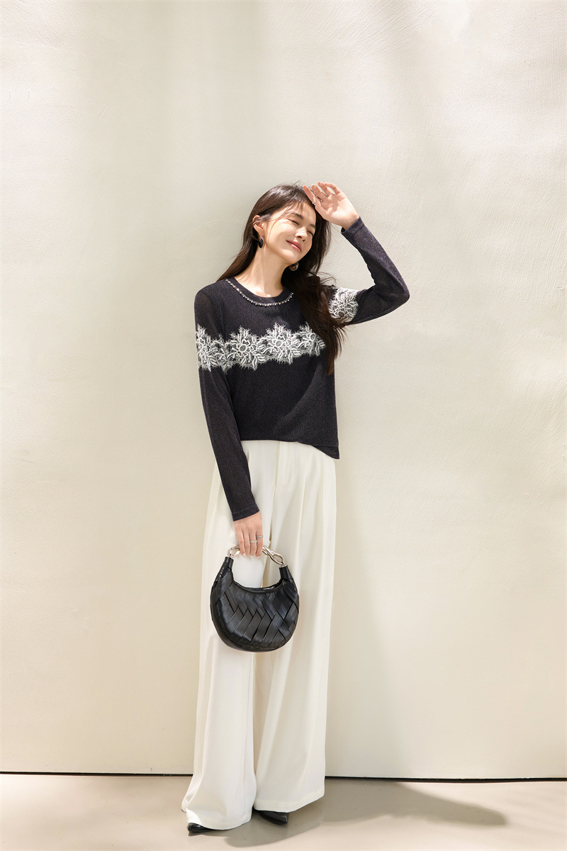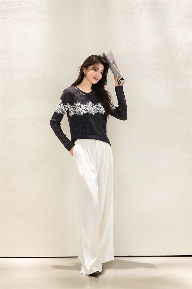 「自」全新升级【铂金会员165/天猫219/差价54】(13624)洛诗琳韩系圆领蕾丝拼接上衣2025秋季新款气质钉珠打底衫