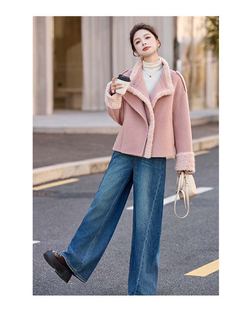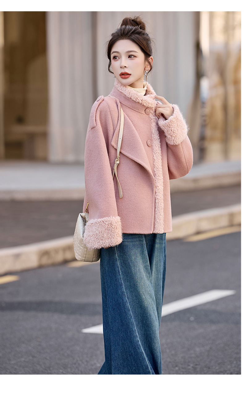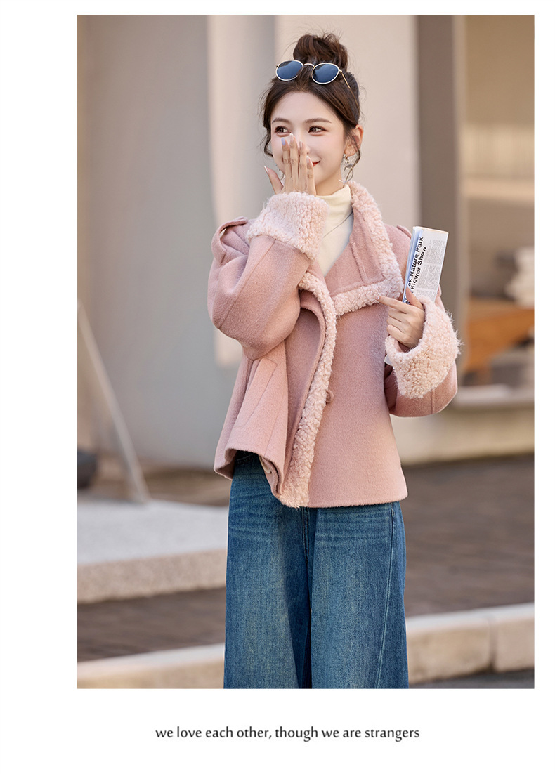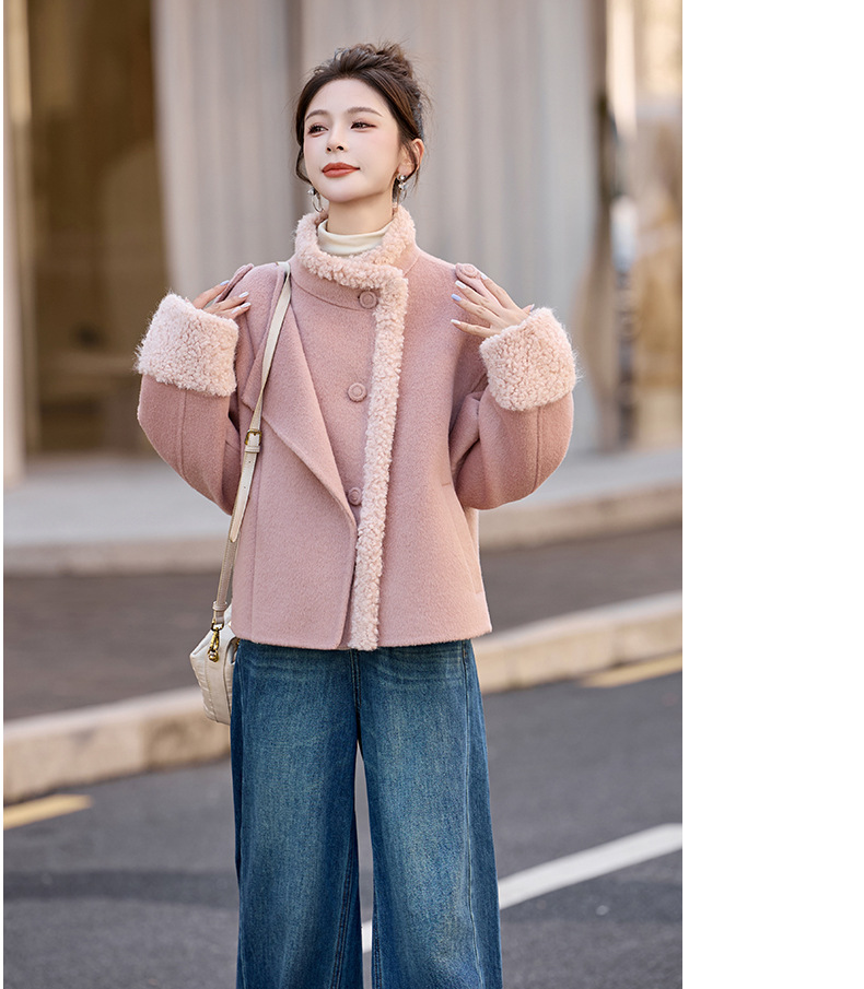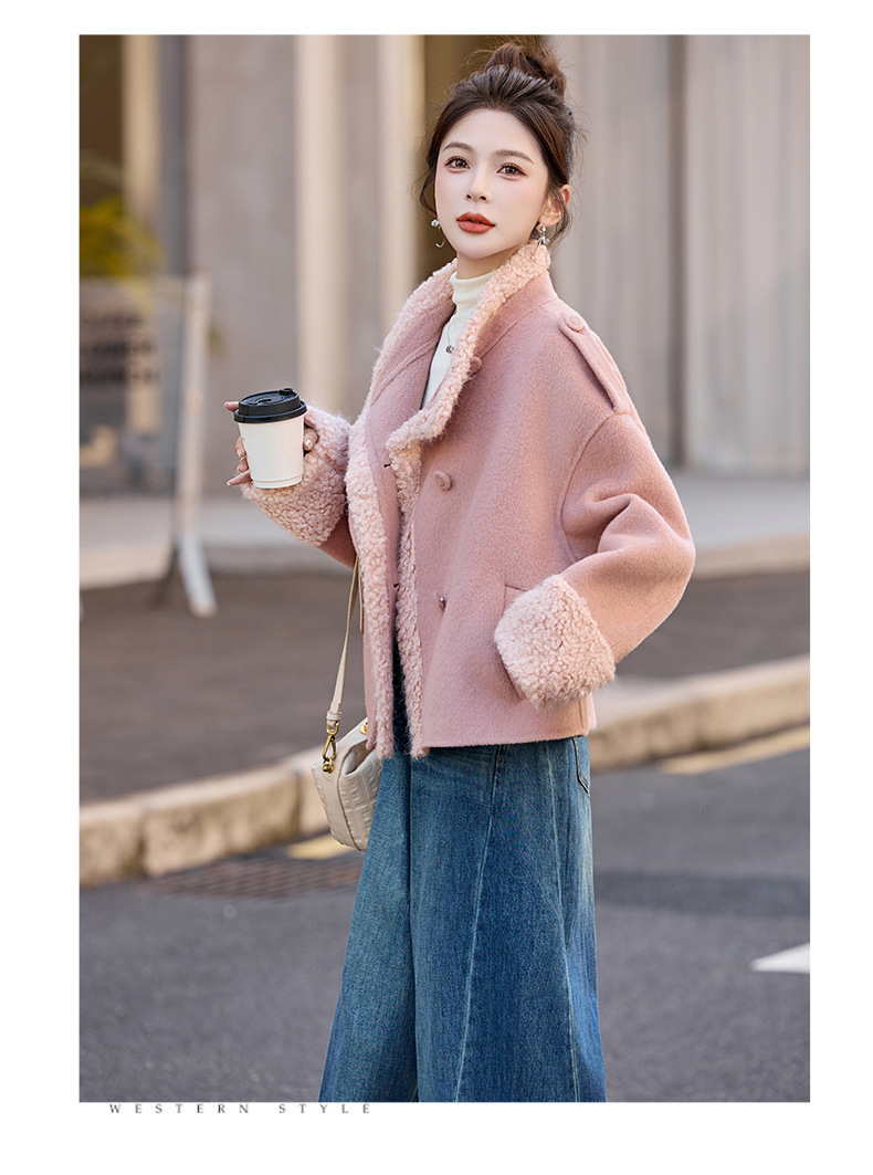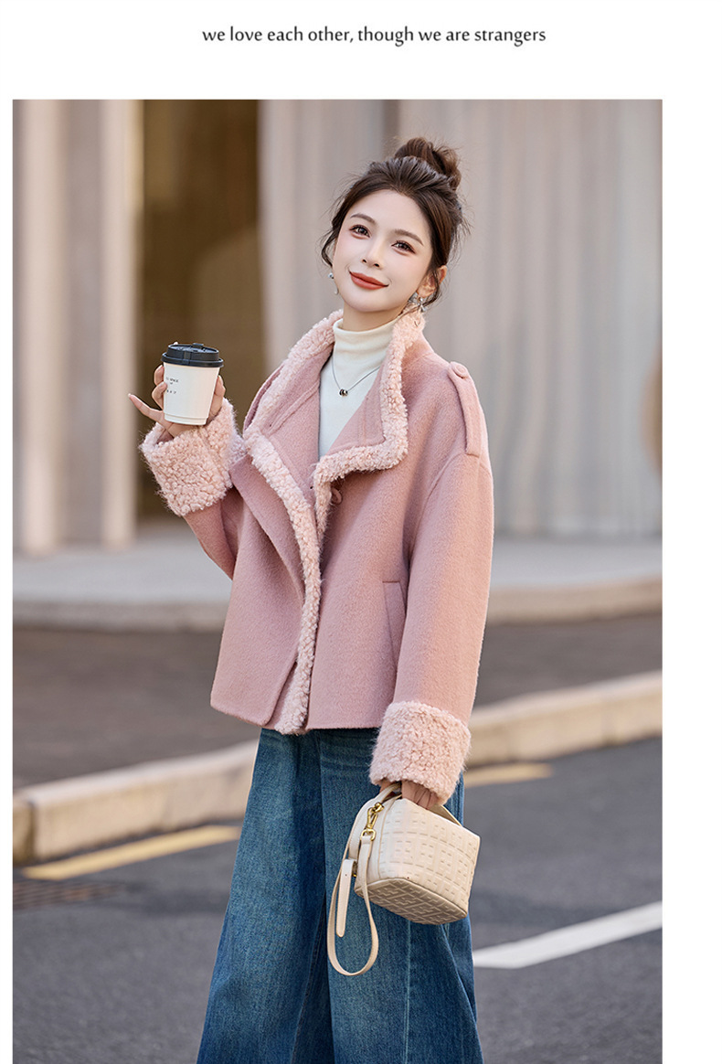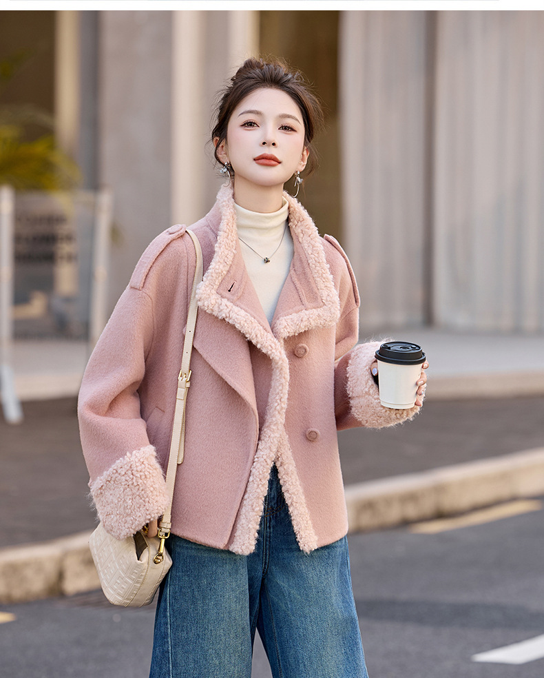 粉色彷羊羔毛拼接双面羊毛大衣,韩系宽松呢子外套HR-QIXFS25-5143