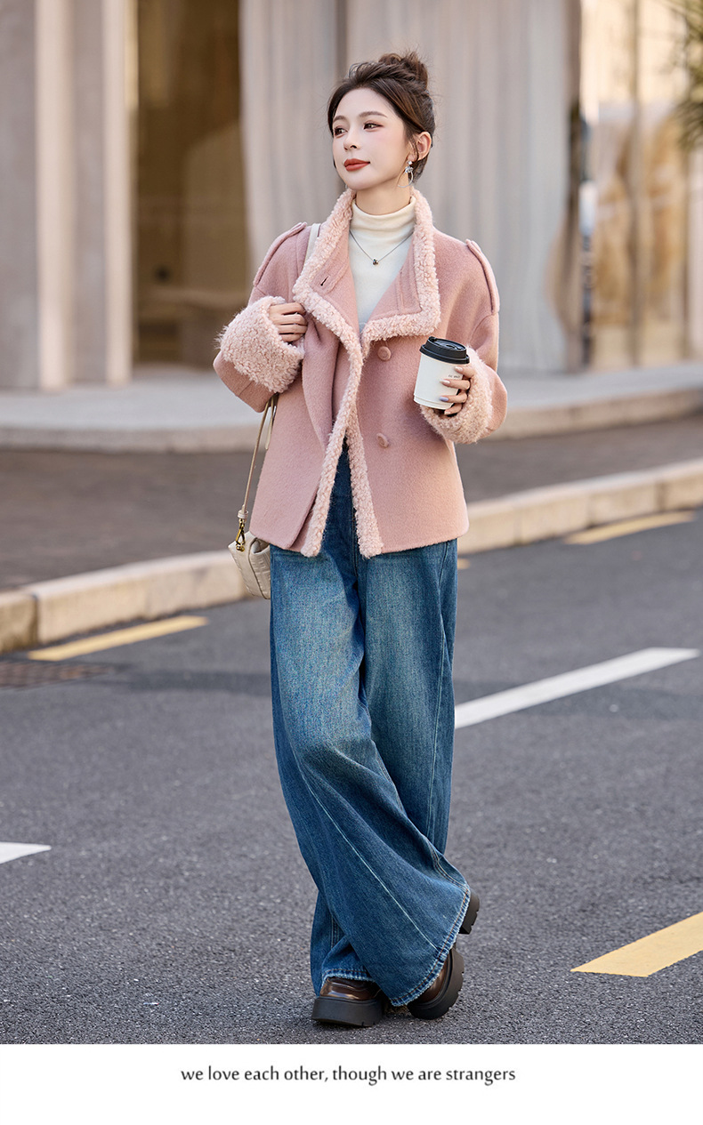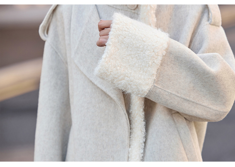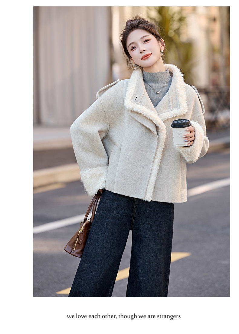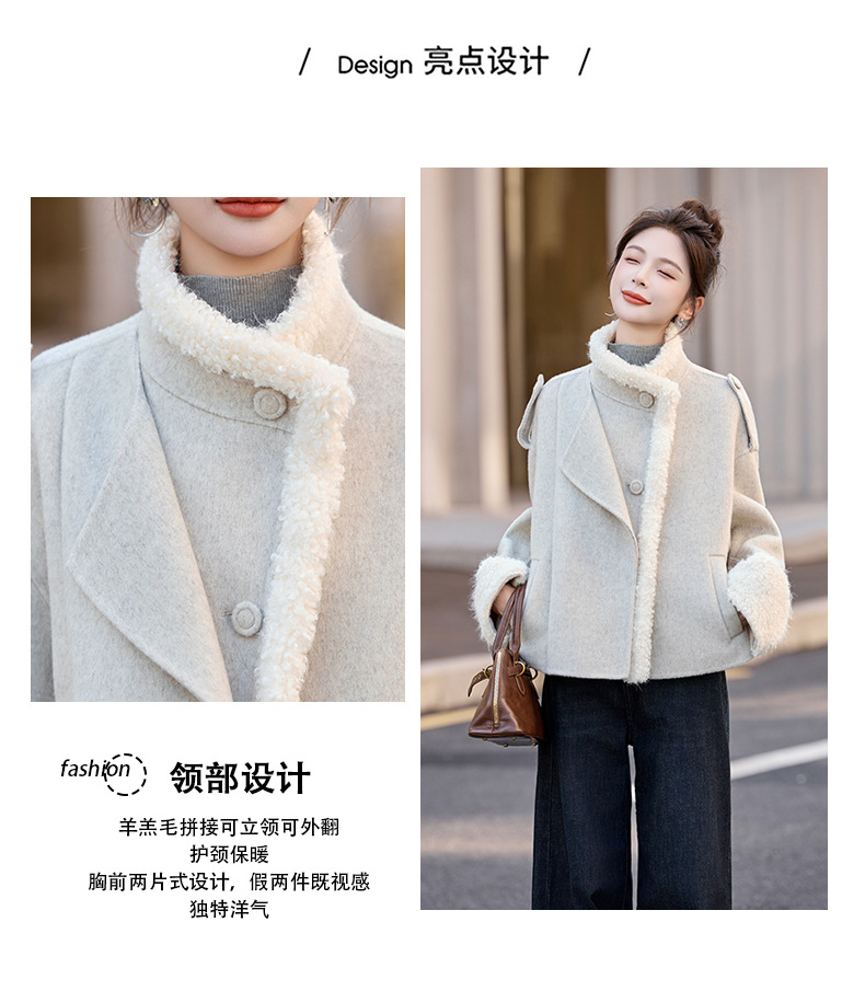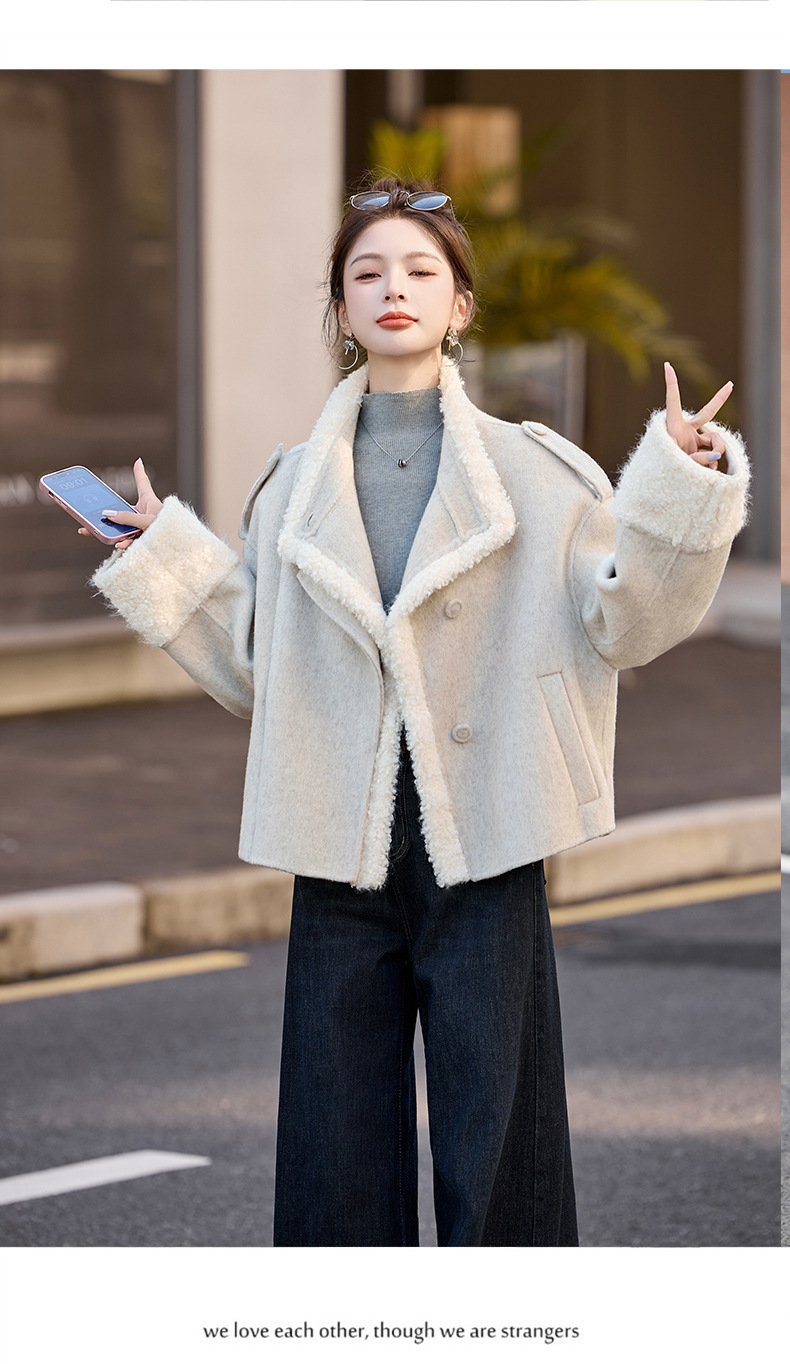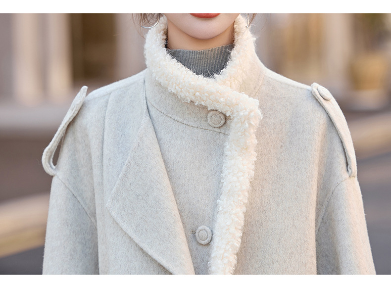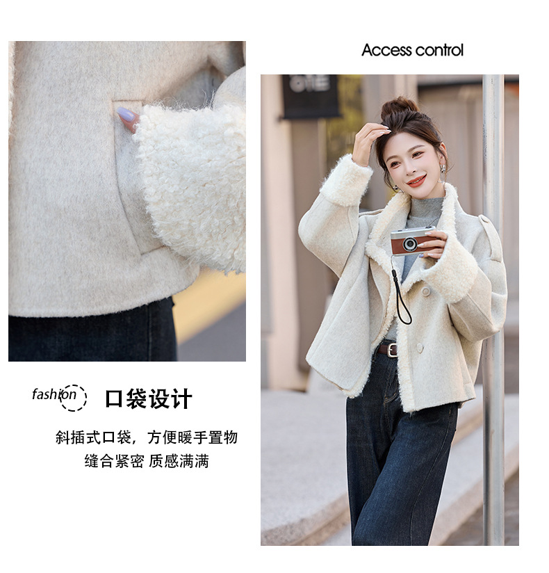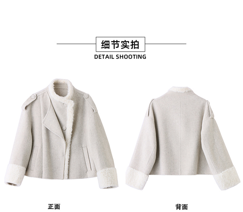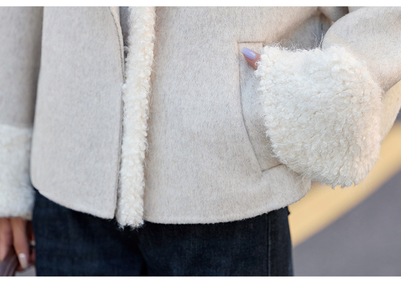 粉色彷羊羔毛拼接双面羊毛大衣,韩系宽松呢子外套HR-QIXFS25-5143