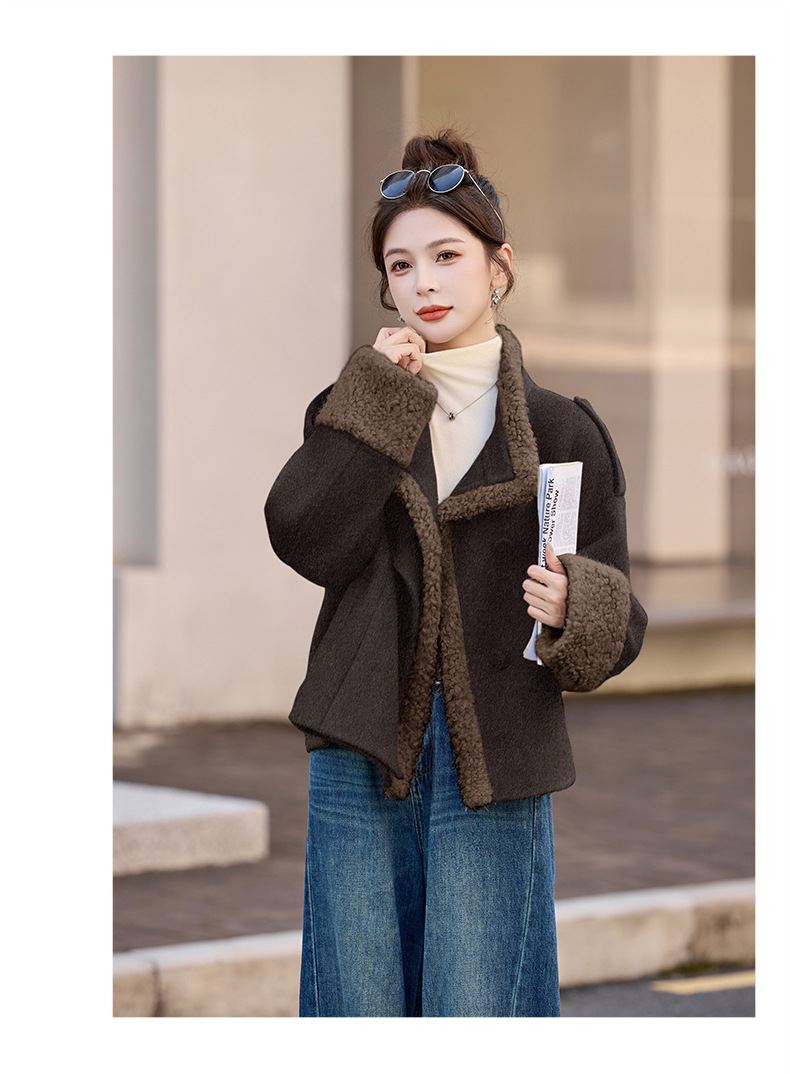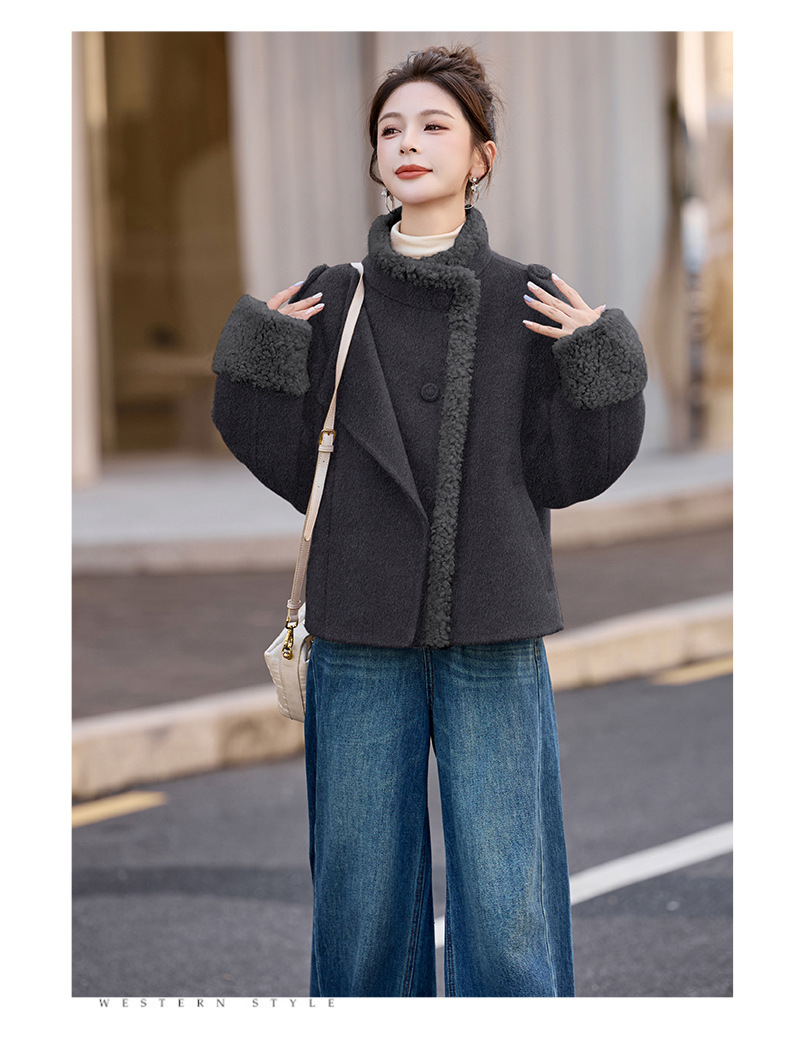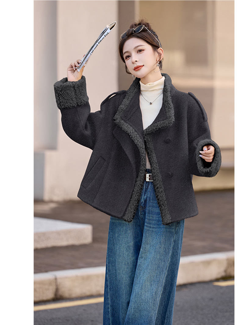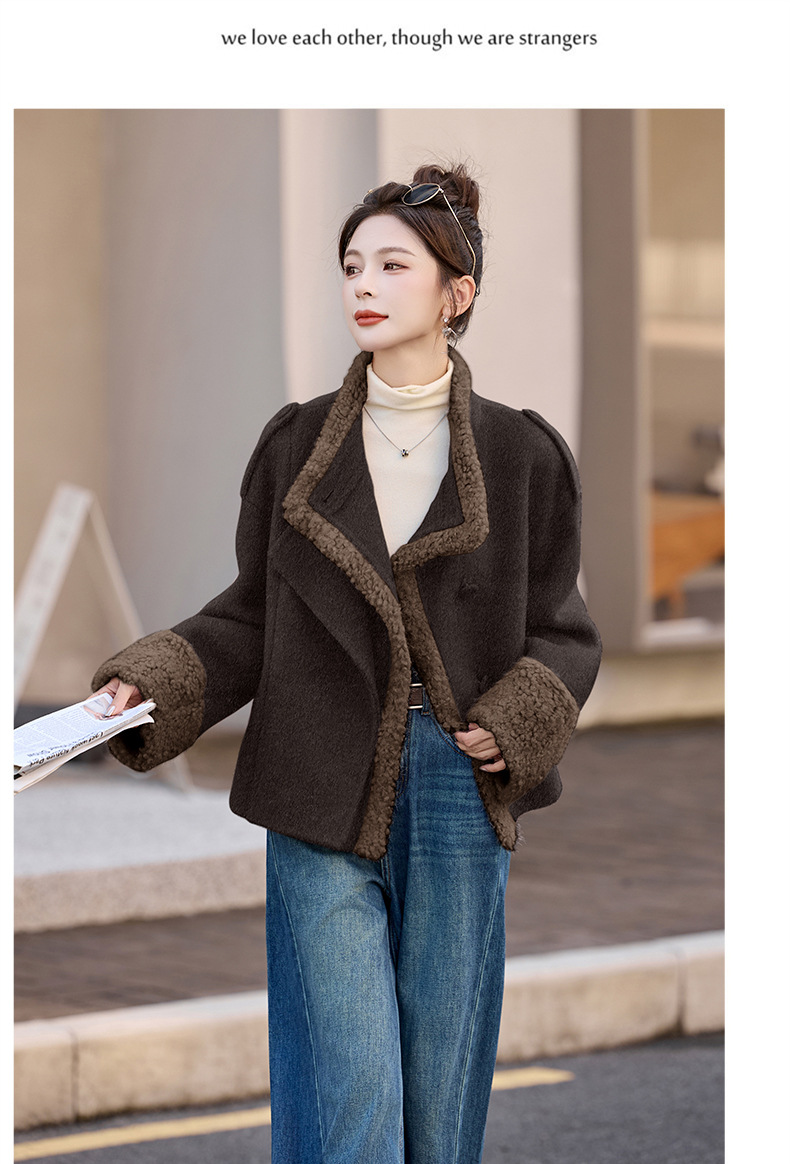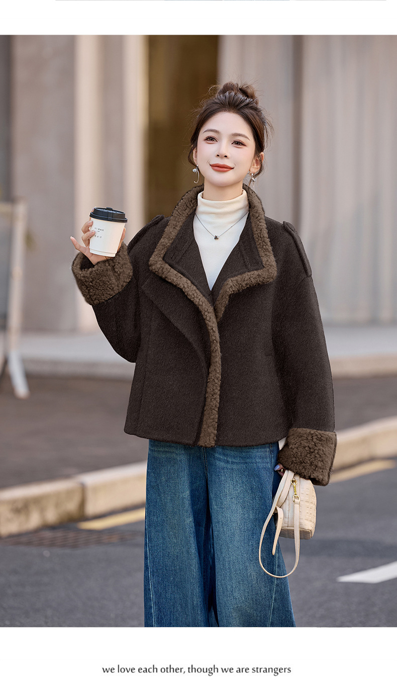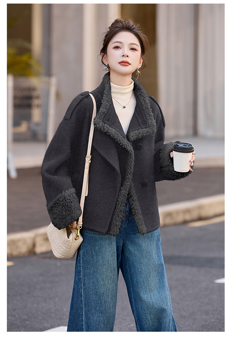 粉色彷羊羔毛拼接双面羊毛大衣,韩系宽松呢子外套HR-QIXFS25-5143