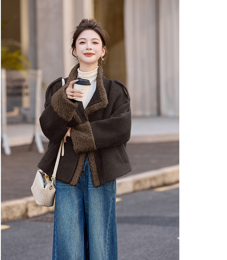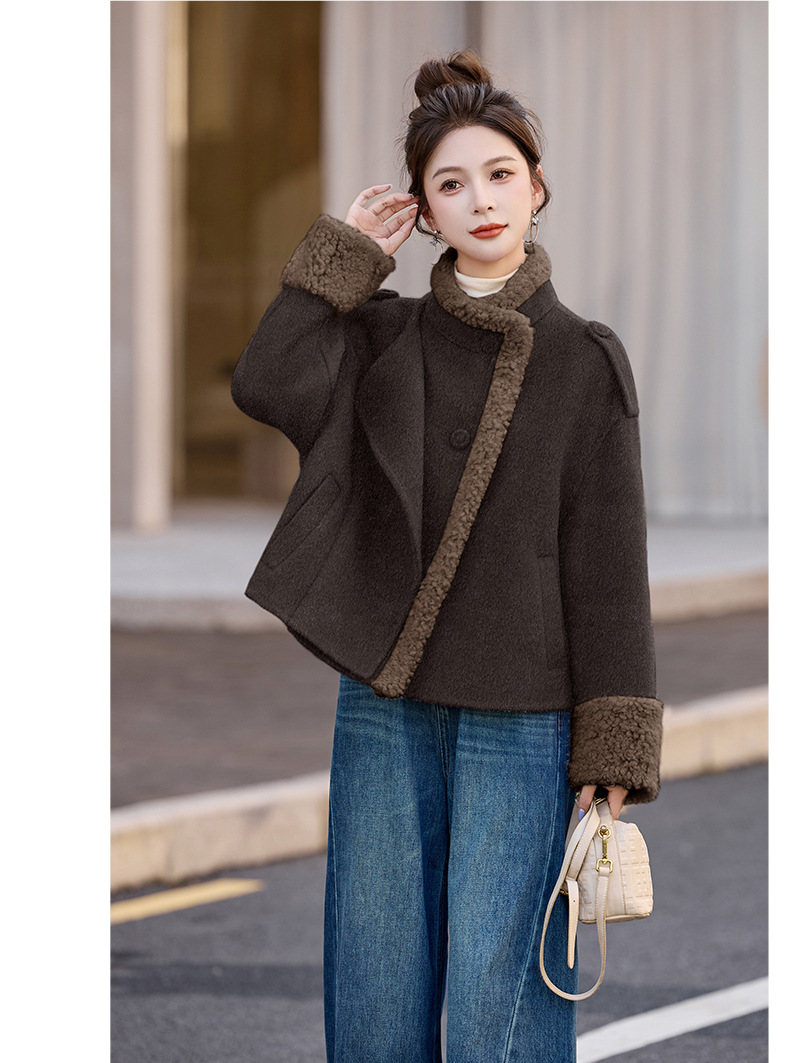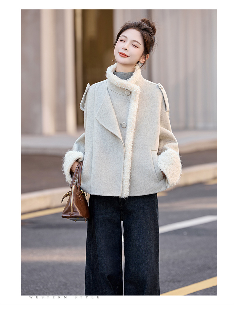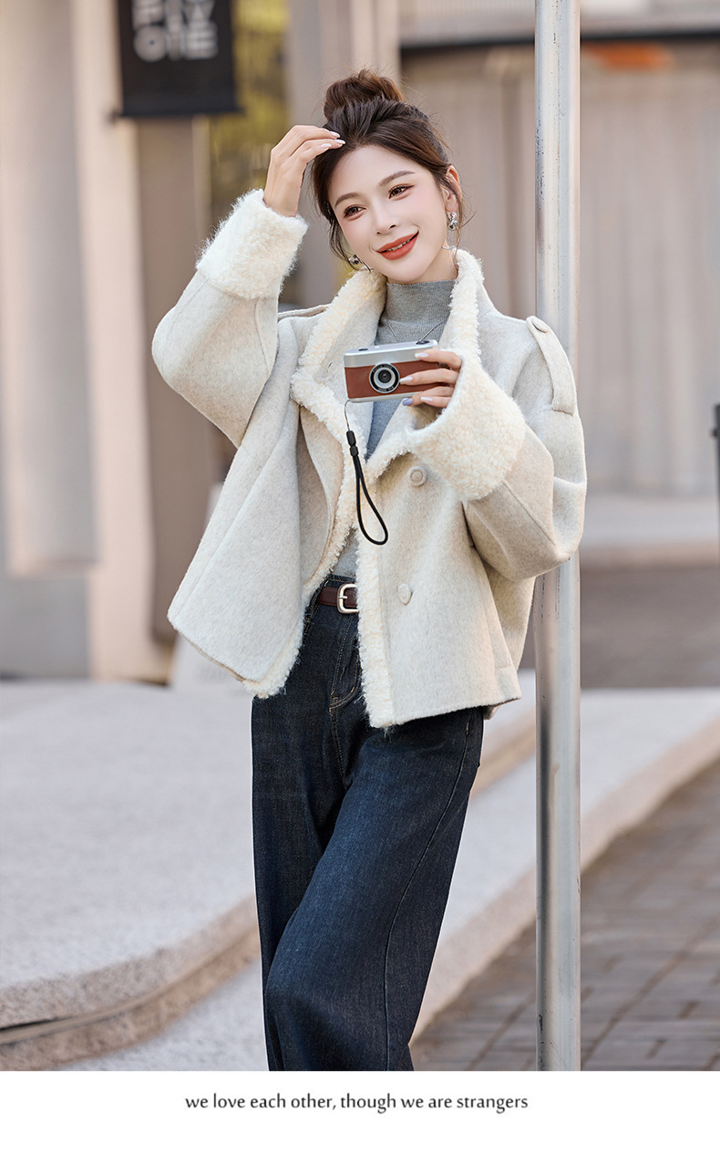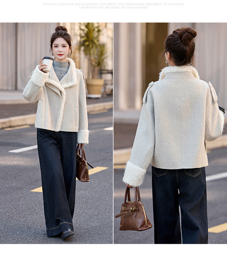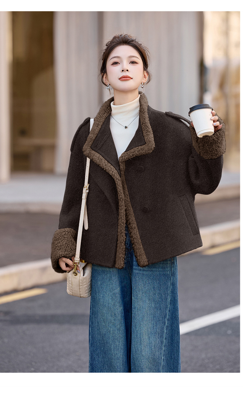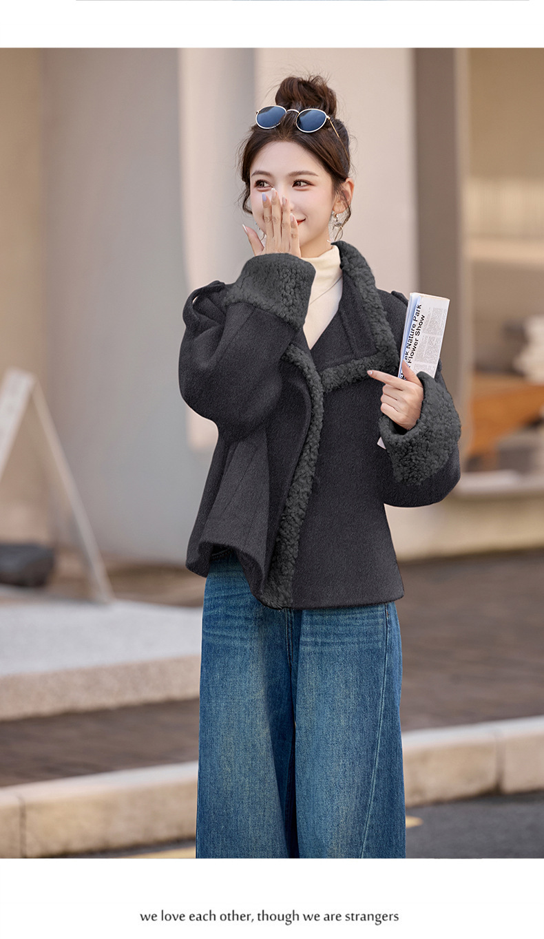 粉色彷羊羔毛拼接双面羊毛大衣,韩系宽松呢子外套HR-QIXFS25-5143