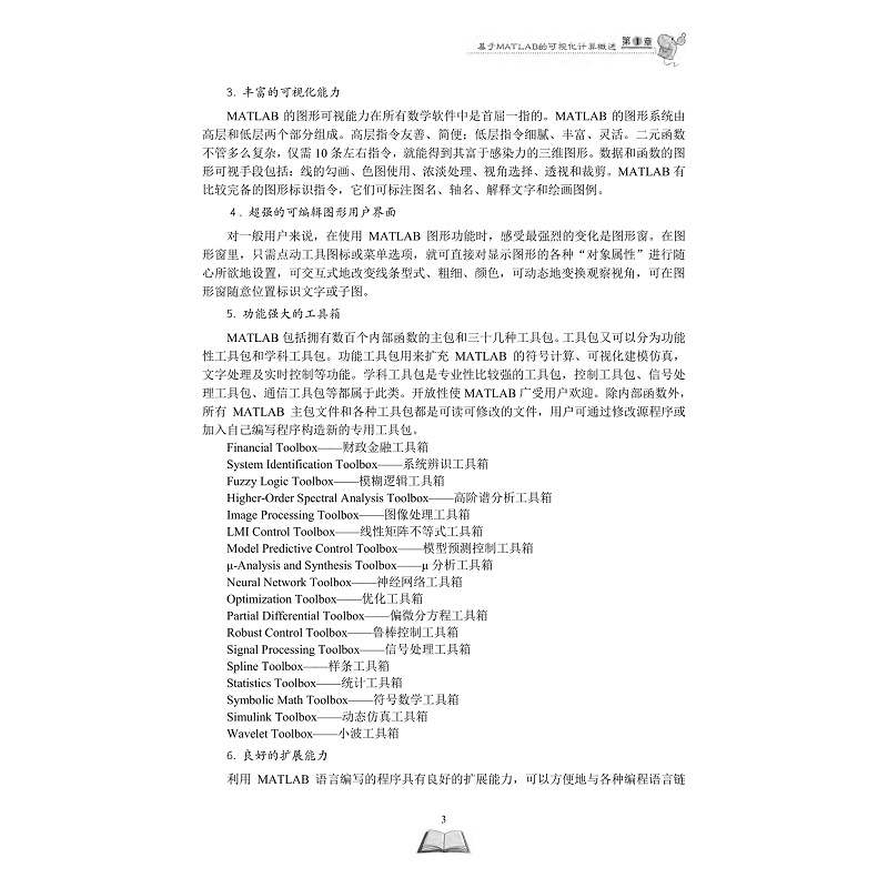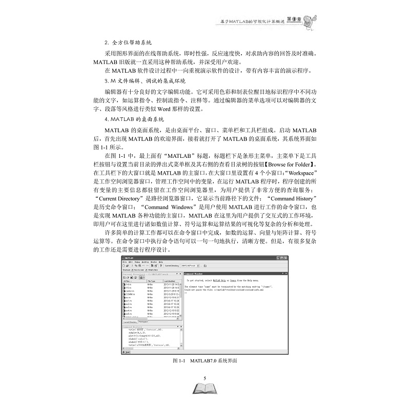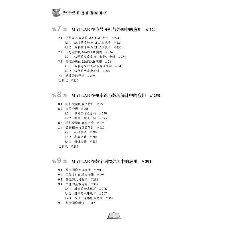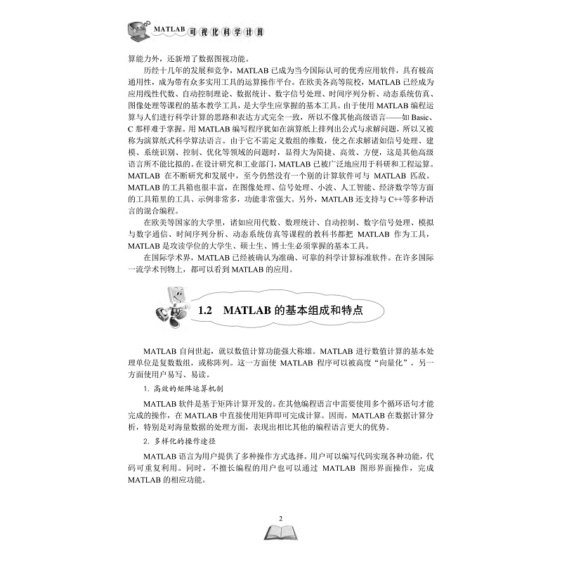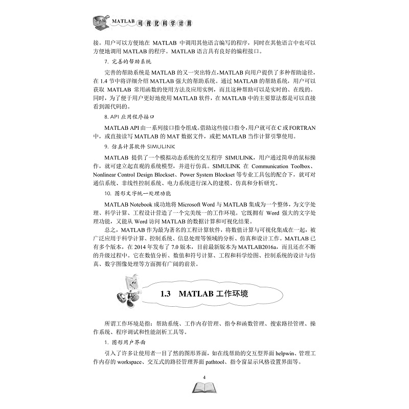 MATLAB 的应用范围非常广,包括科学计算、信号和图像处理、通讯、控制系统设计、测试和测量、财务建模和分析以及计算生物学等众多应用领域。附加的工具箱(单独提供的专用 MATLAB 函数集)扩展了 MATLAB 环境,以解决这些应用领域内特定类型的问题。利用MATLAB提供的各种分析和计算工具大大的方便科学计算。本书是应浙江大学计算机学院远程教育的需要而编写的,因而在编写过程中突出了MATLAB的应用,增强了MATLAB在可视化方面的应用,减少了较深的数学上的应用,本书也适用于计算机及理工、文等各科的学生使用。