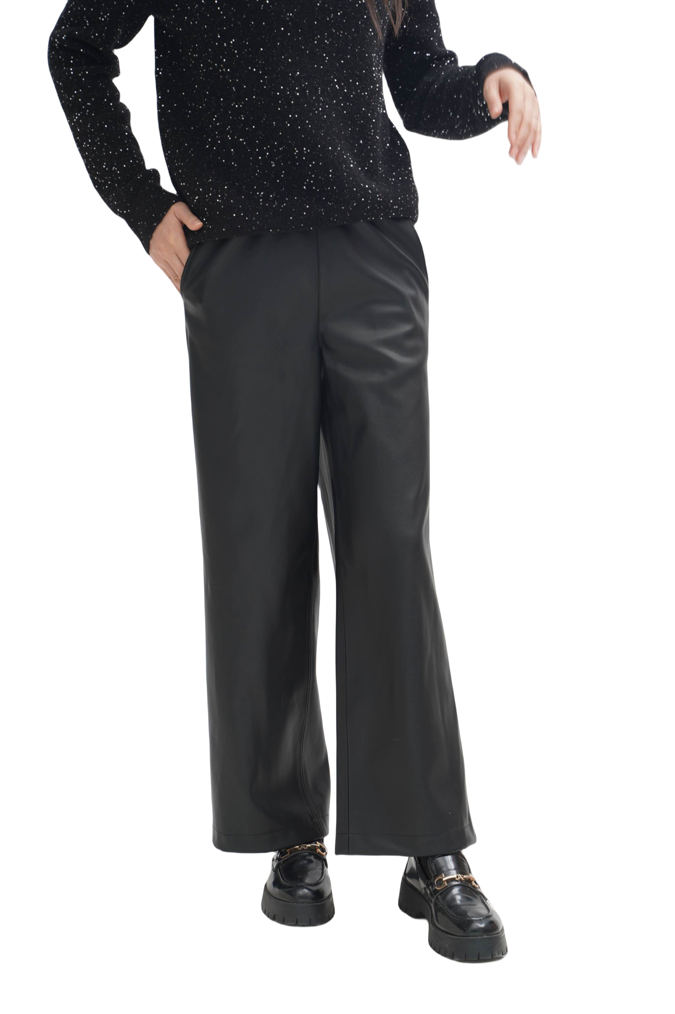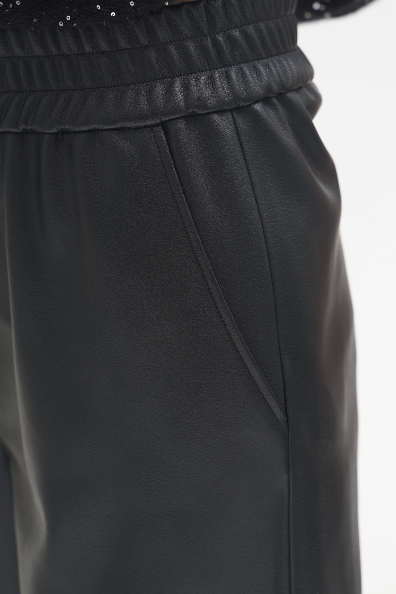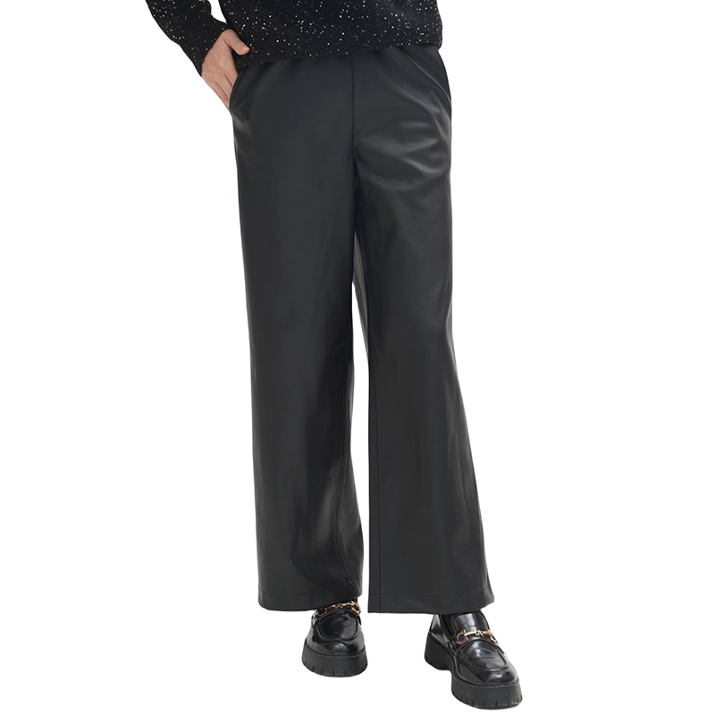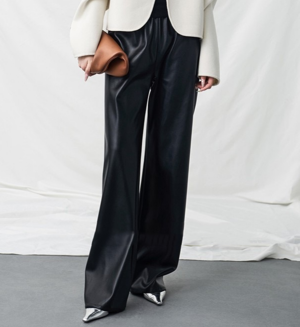 皮裤:选用100%聚酯纤维的仿羊皮手感面料,细腻柔韧,非常有质感,宽松利落的流线型裤腿,修饰腿型且遮肉显瘦,松紧腰头建议卡码拍小。免洗或轻柔冷水手洗,平铺晾挂。