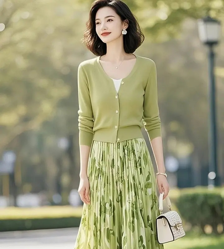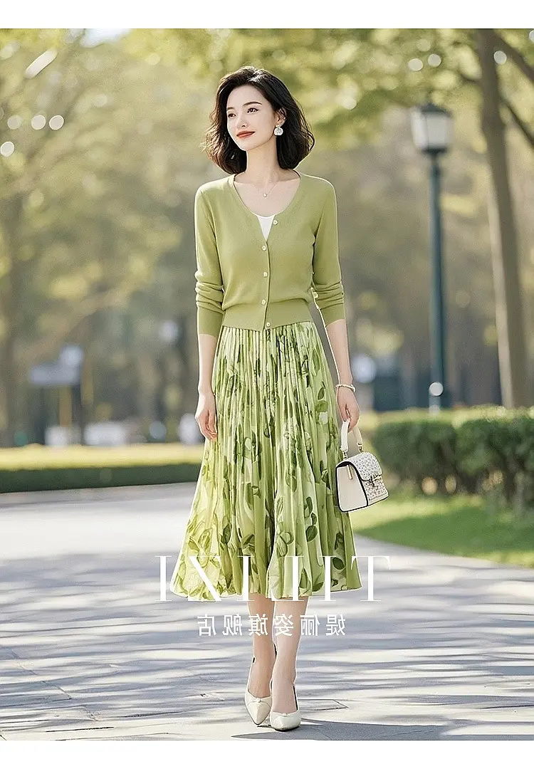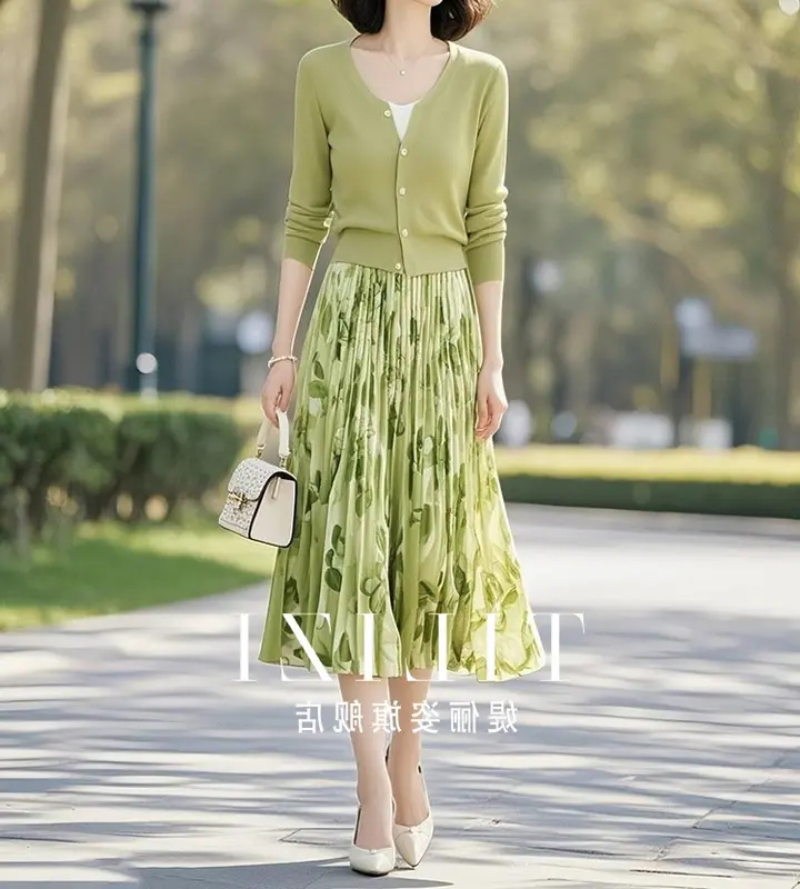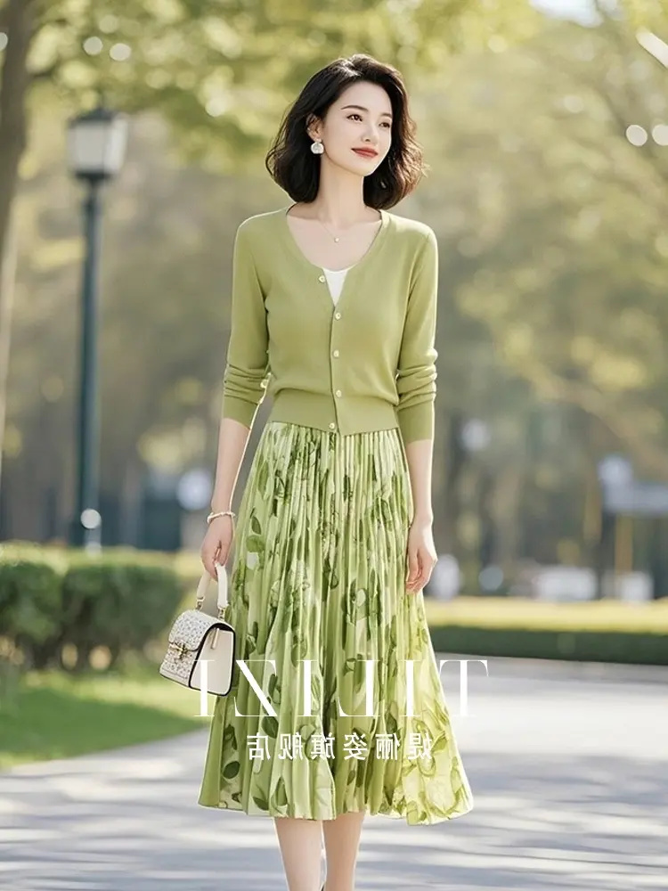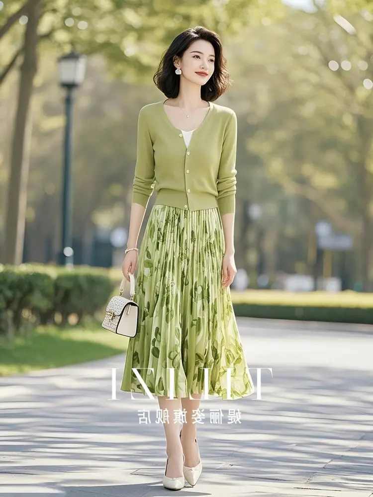 2025超火开春穿搭一整套韩风chic气质减龄休闲清新绿色两件套装裙