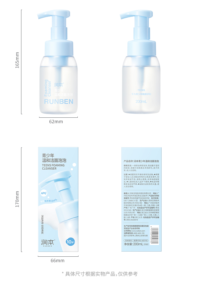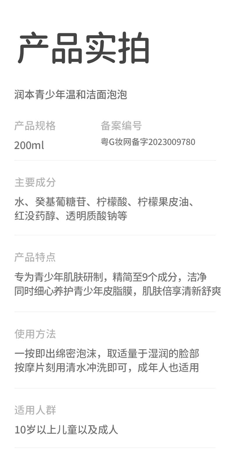 润本(RUNBEN)青少年温和洁面泡泡200ml控油洁净10岁以上男女孩儿童学生洗面奶