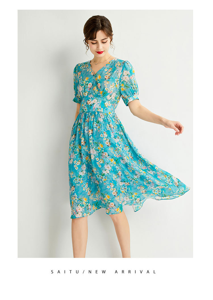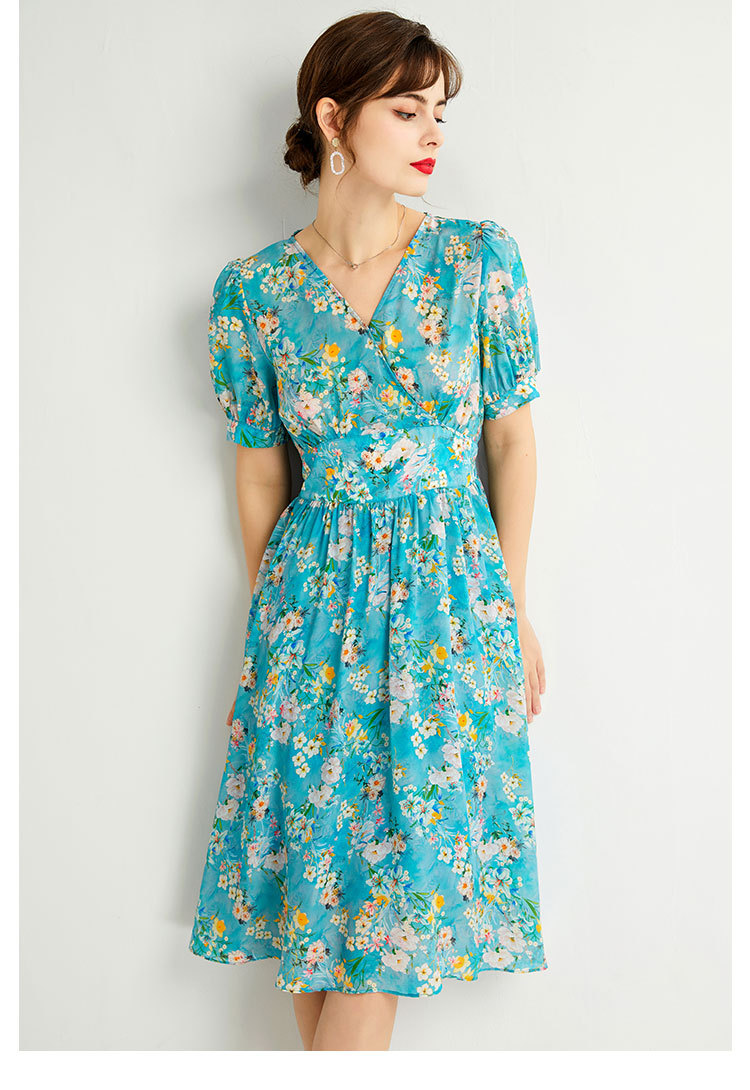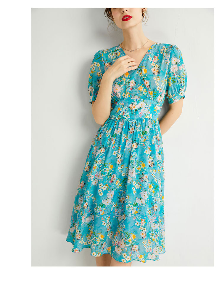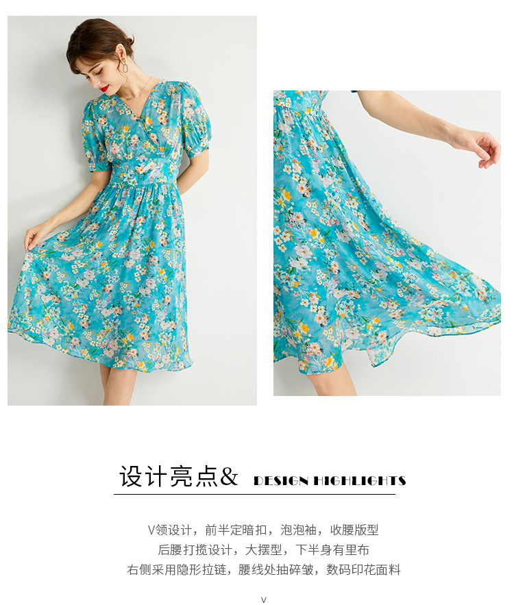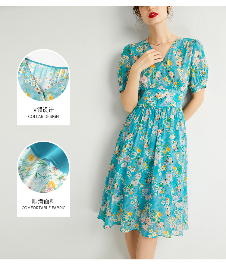 v领时尚收腰桑蚕丝,碎花真丝连衣裙KBN-230117