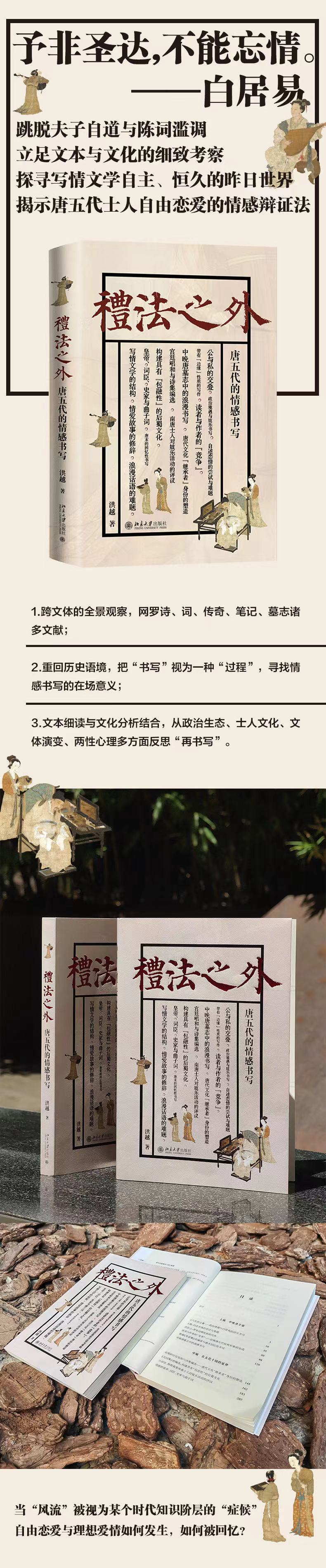 《礼法之外:唐五代的情感书写》收入十四篇文章,讨论九世纪初至十世纪中叶,即中晚唐至五代时期的情感书写。这时候,士人通过讲述和写作来分享情爱诗歌和故事,“风流才子”“有情人”成为士人构想自我形象的新模式。作者从文本、文化两个角度考察这一文学文化现象,一方面分析作品的结构、修辞特点,另一方面考察这种写作兴起的社会原因,通过个案研究去理解情感书写与士人追求政治成功、积累文化资本、塑造自我形象之间的关联,以及这种边缘写作与社会秩序、文学传统之间的紧张关系。