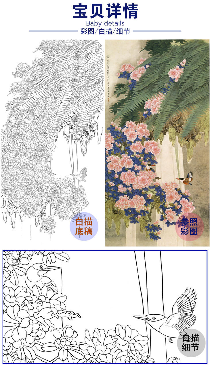竖幅四尺六尺工笔花鸟白描底稿-周彦生《花晖》-多种白描尺寸可选-A084