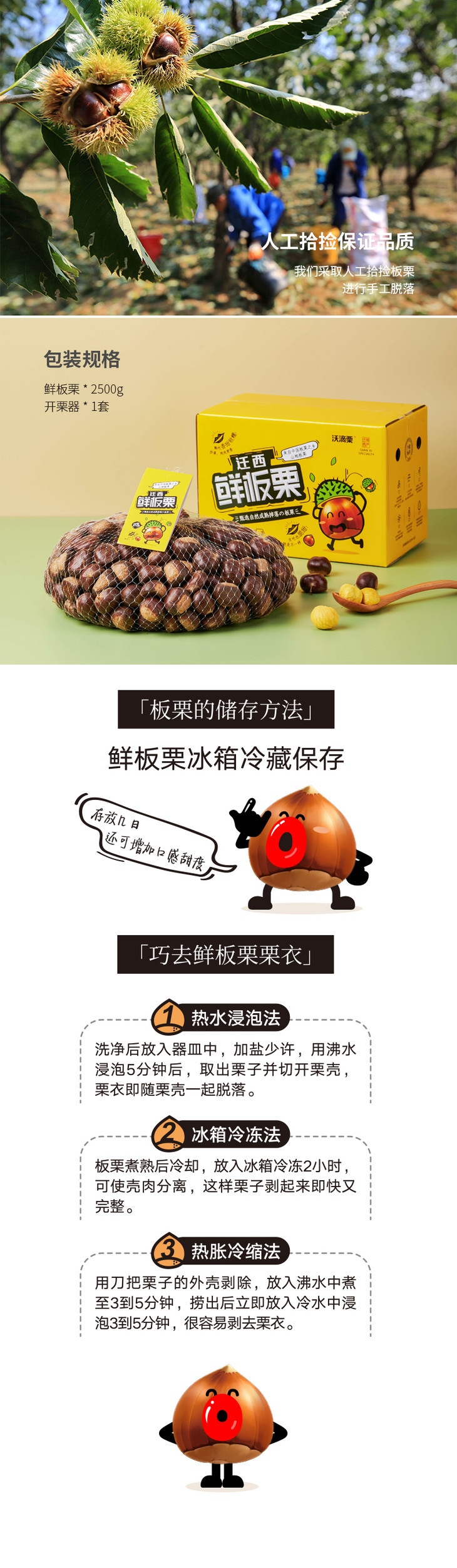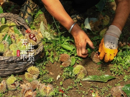 山地种植的板栗,类于半野生状态生长,不打农药。每一颗板栗从开花至成熟掉落,最后经人工捡拾,以最原始的方式保留最纯正的自然本味。