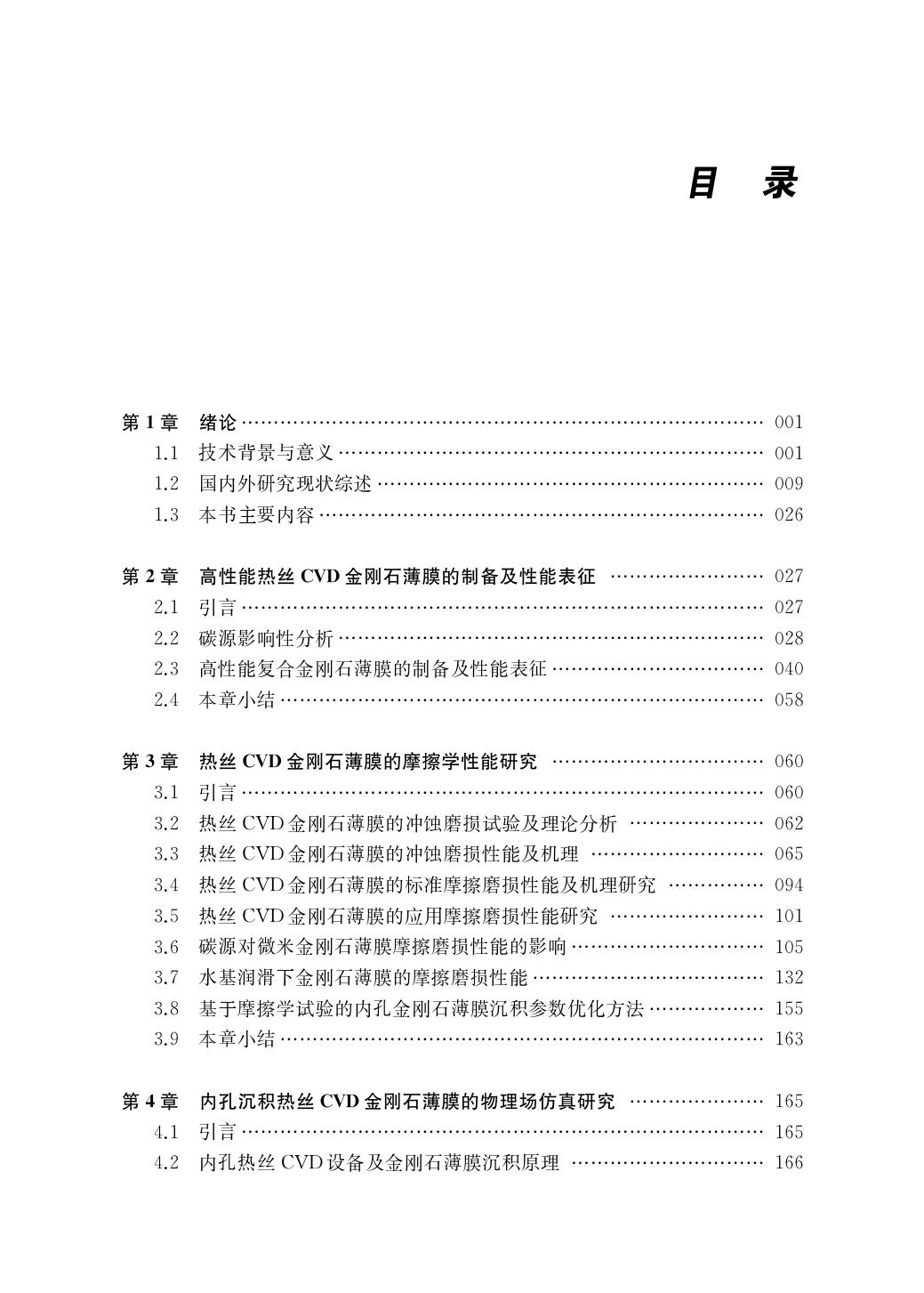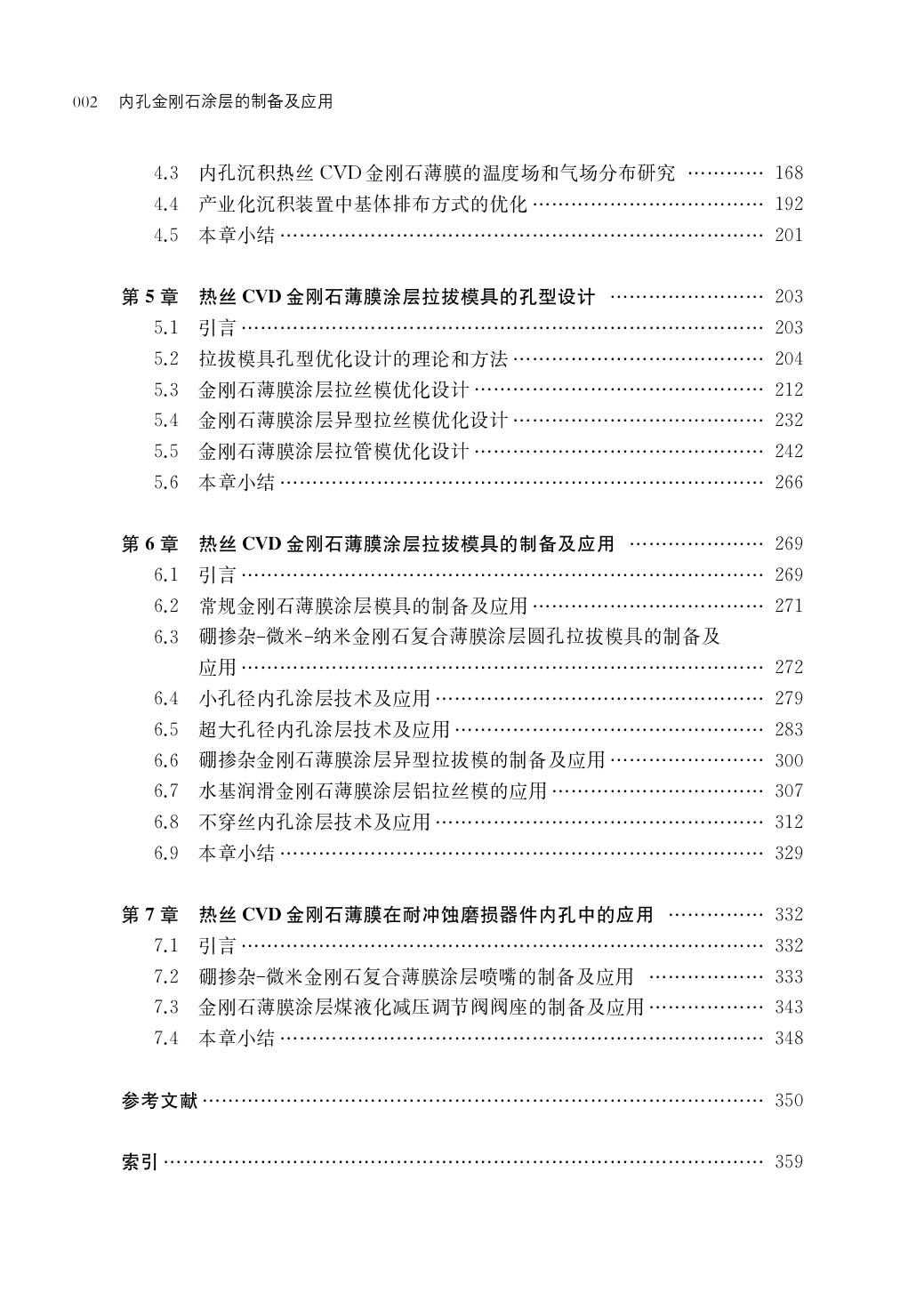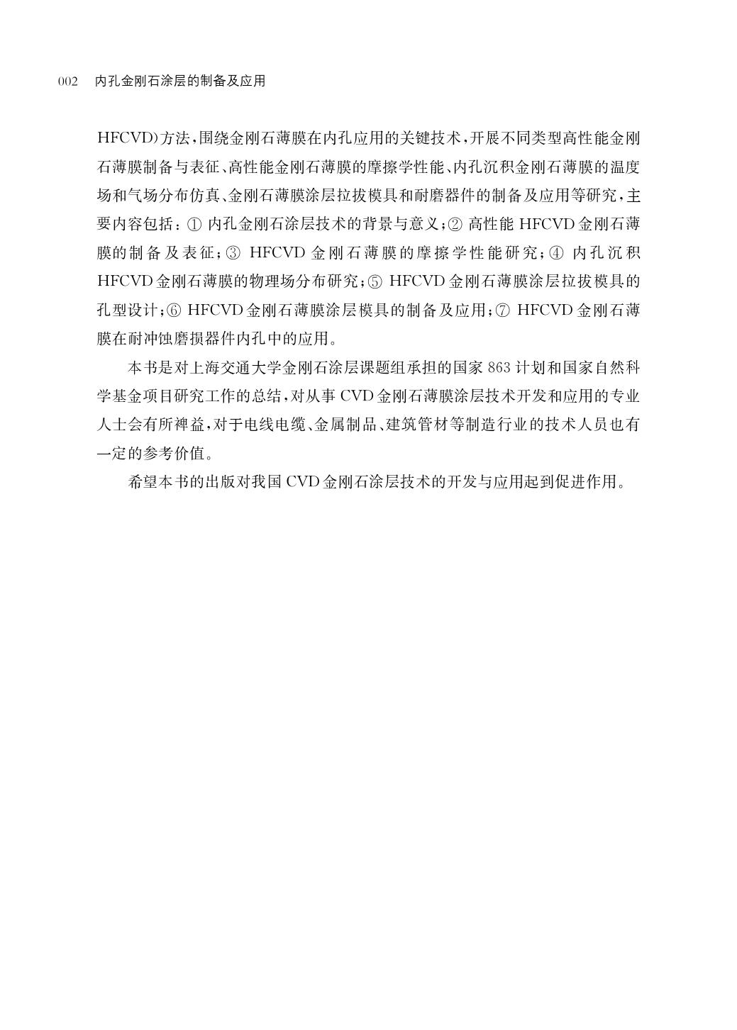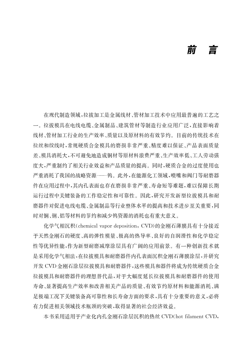 本书首先阐述了内孔化学气相沉积金刚石涂层技术及应用研究的重要意义,针对不同内孔应用条件制备具有不同特性的高性能热丝化学气相沉积(chemical vapor deposition,CVD)金刚石薄膜,并研究了不同类型热丝CVD金刚石薄膜的摩擦学性能,进一步对内孔沉积热丝CVD金刚石涂层的温度场和气场进行仿真分析研究。在此基础上,进行CVD金刚石薄膜涂层拉拔模具的孔型设计,开展CVD金刚石涂层拉拔模具的制备及应用研究。最后,还进行了内孔金刚石涂层在耐冲蚀磨损器件方面应用技术开发。本书对内孔金刚石涂层关键技术进行了全面系统的研究,丰富了CVD金刚石薄膜涂层应用技术内涵并拓宽了其应用范围。