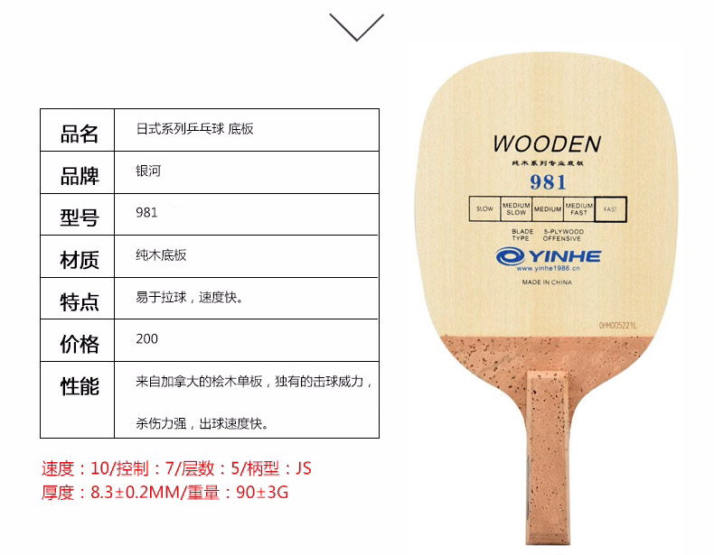 Yinhe银河 981 专业乒乓球拍底板5层纯木日直底板