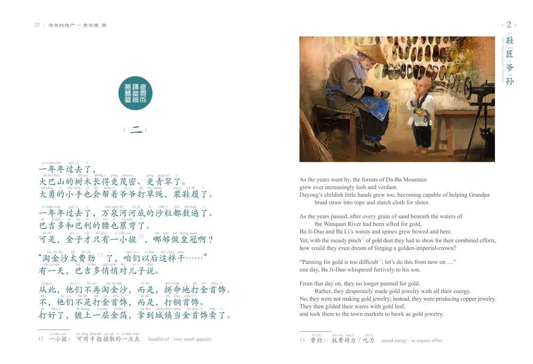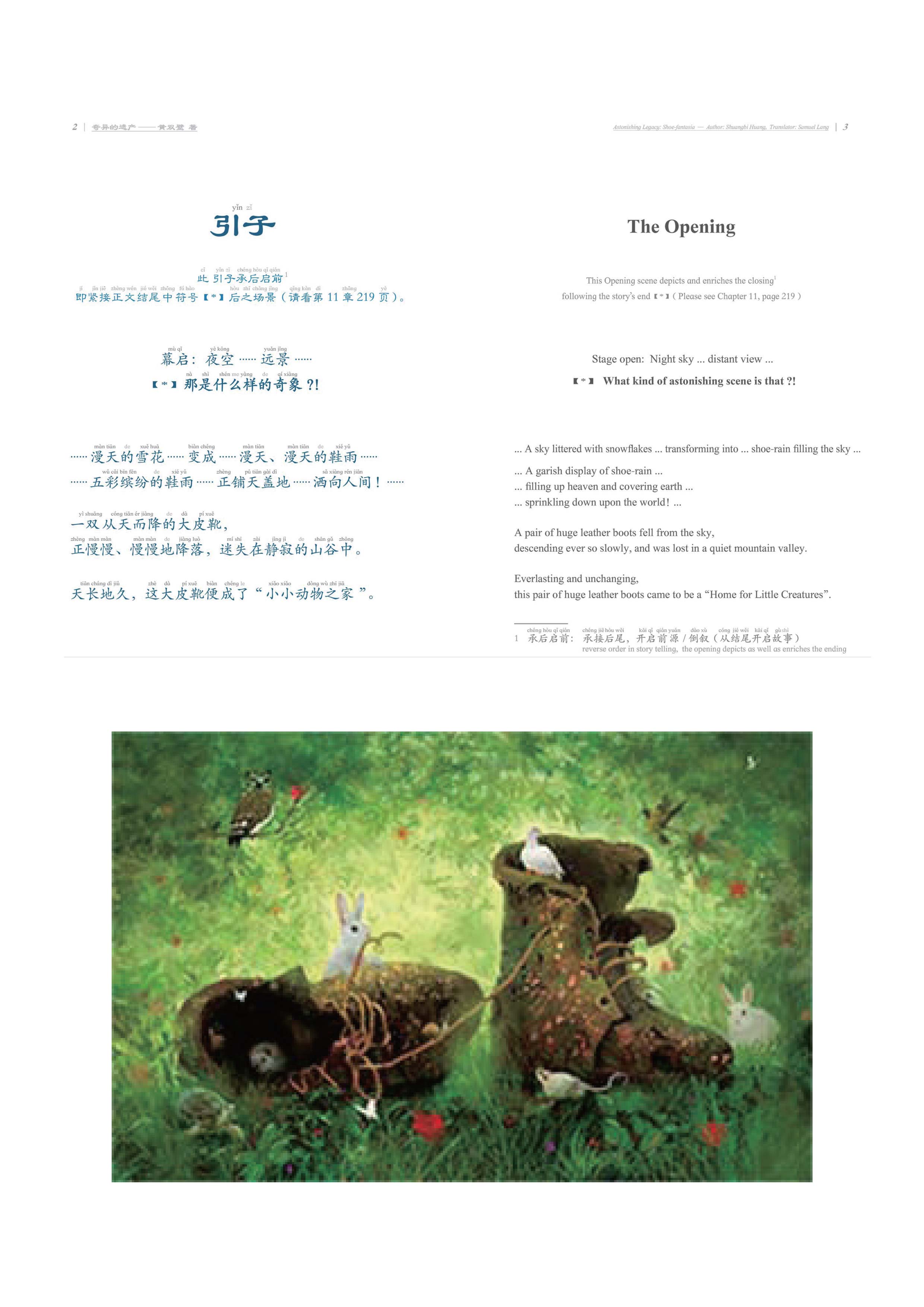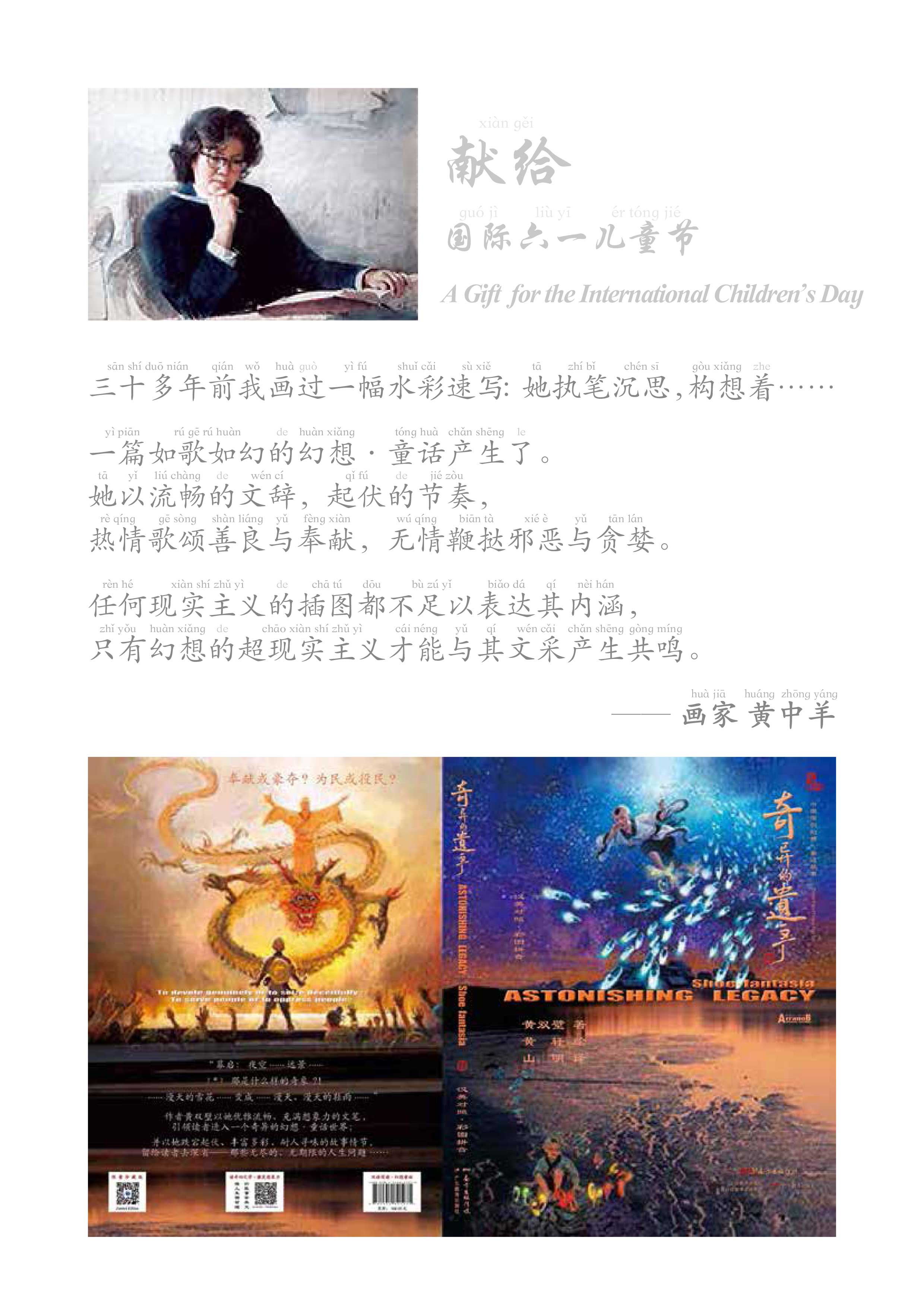 《奇异的遗产—— ASTONISHING LEGACY: Shoe-fantasia》 是既有童话语境、又具幻想小说特征的中长篇中国原创幻想•童话故事;一本特别为国际读者量身定制的罕见的对外汉语教学——汉语•英语•拼音•双语对照阅读——中国原创 幻想文学读物。本书不仅仅是中文读物,同时还是全中文以按字注音识别词组的拼音读物,英文读物,三合一并配彩图。其文采如歌如幻、充满想像力。