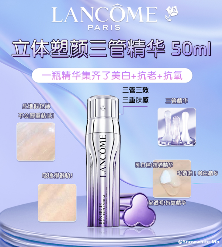 👑️兰蔻立体塑颜三管精华 50ml 👍全新兰蔻塑颜三管精华,三管三效,三重肤感💥。 👑一瓶精华集齐了美白+抗老+抗氧,融合后的质地也很轻盈,精简护肤,超级方便💦~ 💎1管抗氧精华:99%高淳阿魏酸,改善暗沉。 💎1管美白:VC+烟酰胺+377,焕亮透白。 💎1管抗老精华:4%亚麻籽肽+长效玻尿酸,提拉紧致。