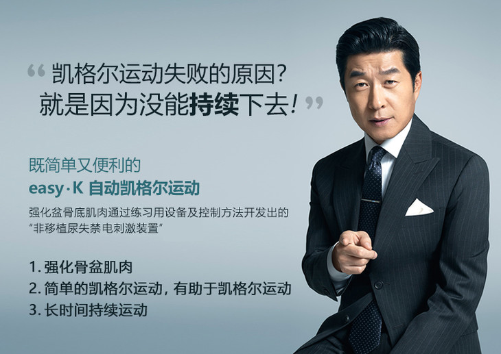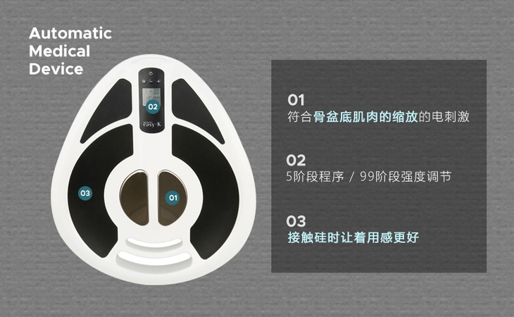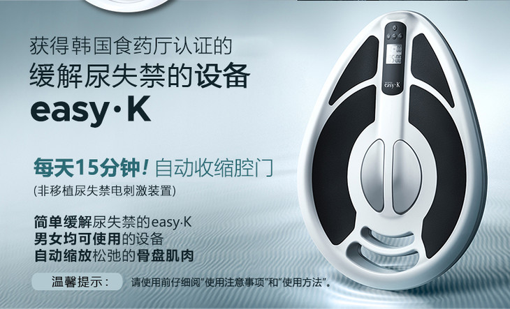easy-k盆底肌强化仪器预防尿失禁或大便失禁为目的,在体外通过电极刺激盆底肌肉做凯格尔运动的非移植型神经刺激仪器。