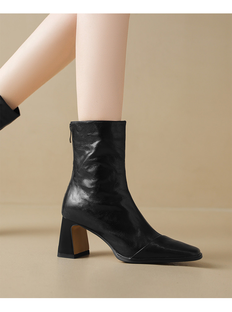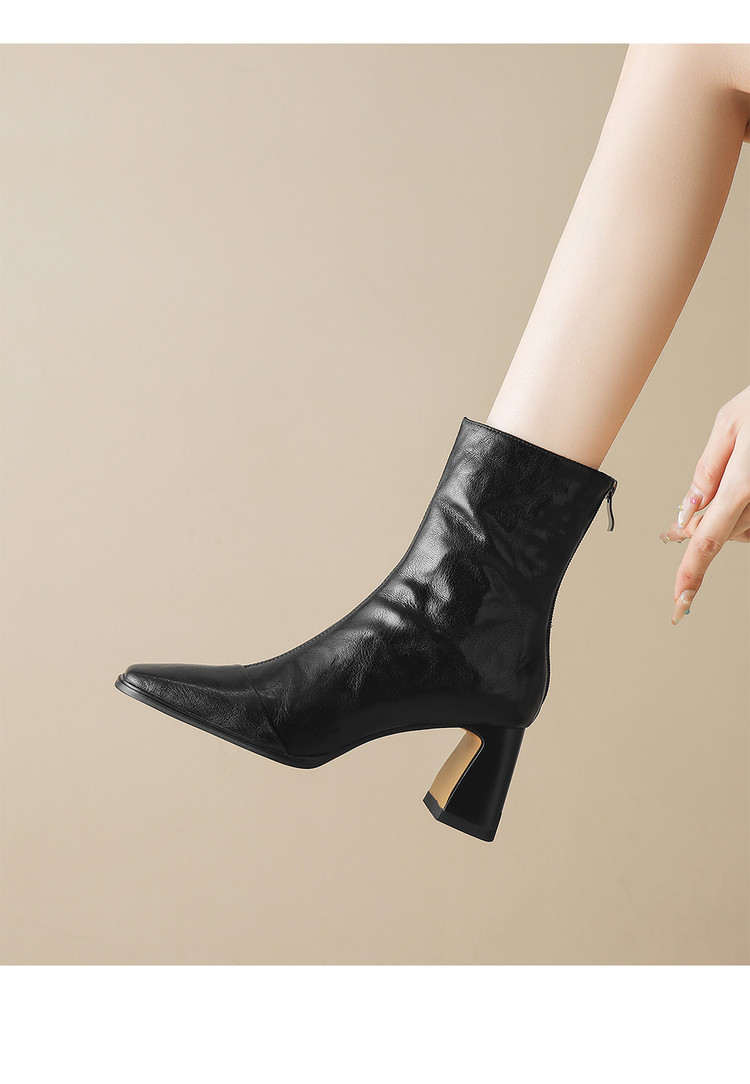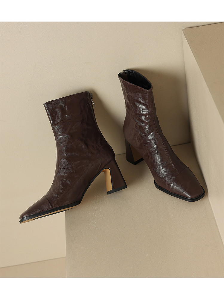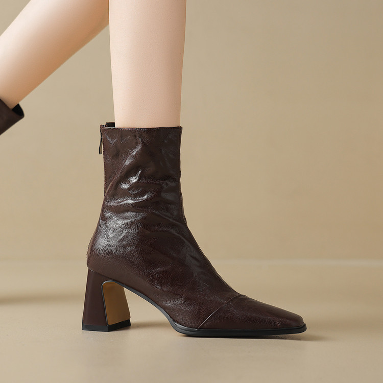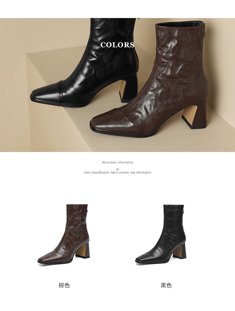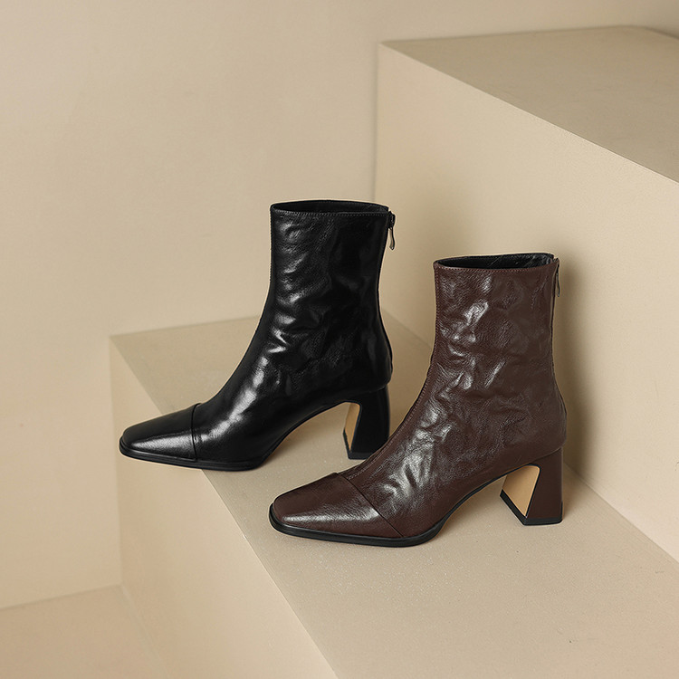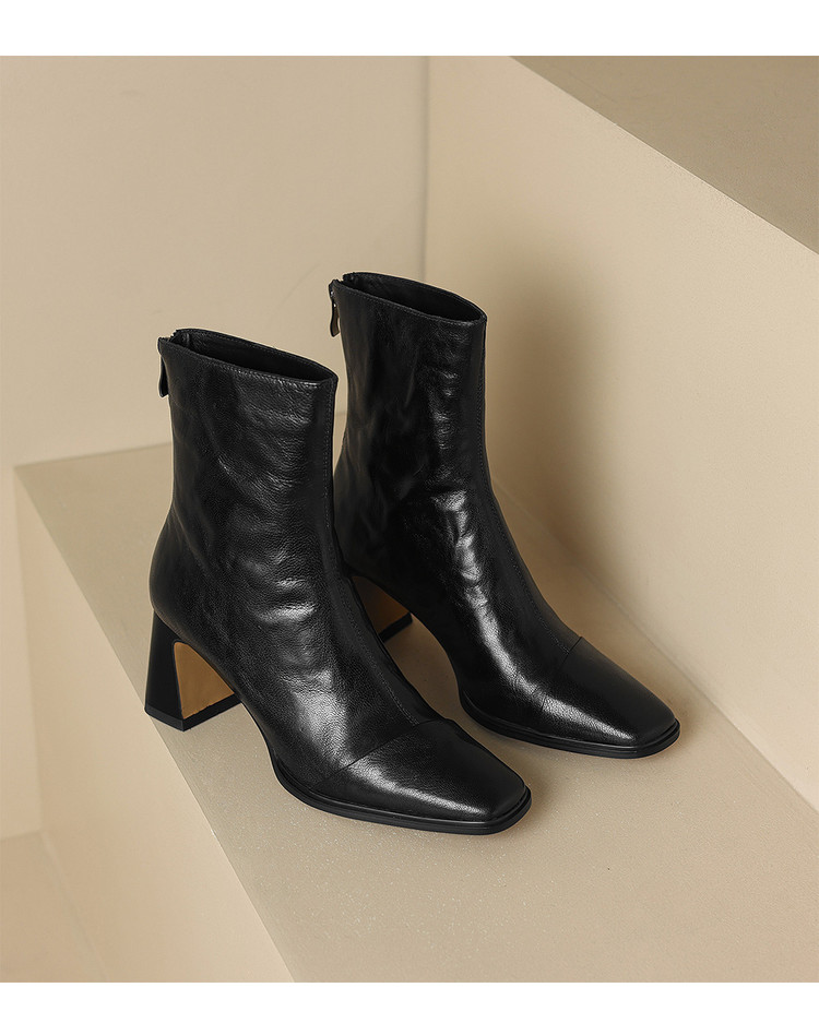 【预售5天】羊皮版~方头法式气质粗跟短靴女后拉链通勤瘦瘦靴复古马丁靴单靴WXJFG&W720