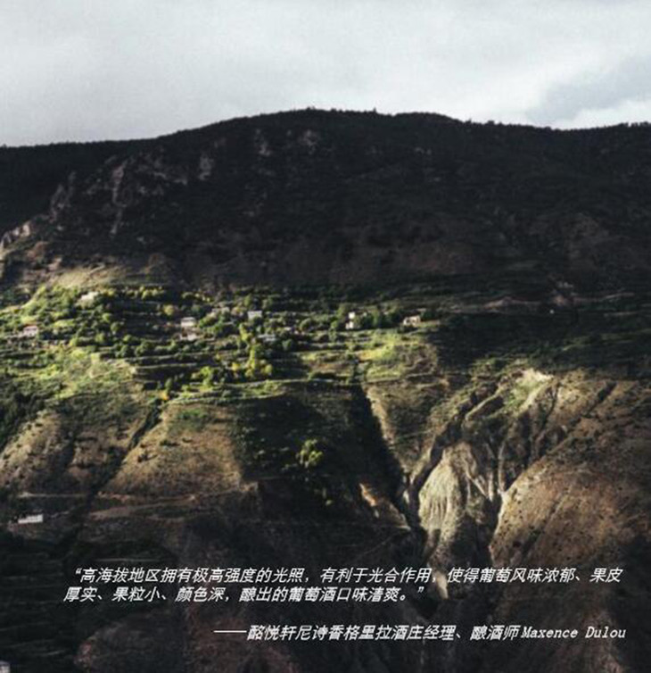 “高海拔地区拥有高强度的光照,有利于光合作用,使得葡萄风味浓郁、果皮 厚实、果粒小、颜色深,酿出的葡萄酒口味清爽。 ”—— 酩悦轩尼诗香格里拉酒庄经理、酿酒师 Maxence Dulou