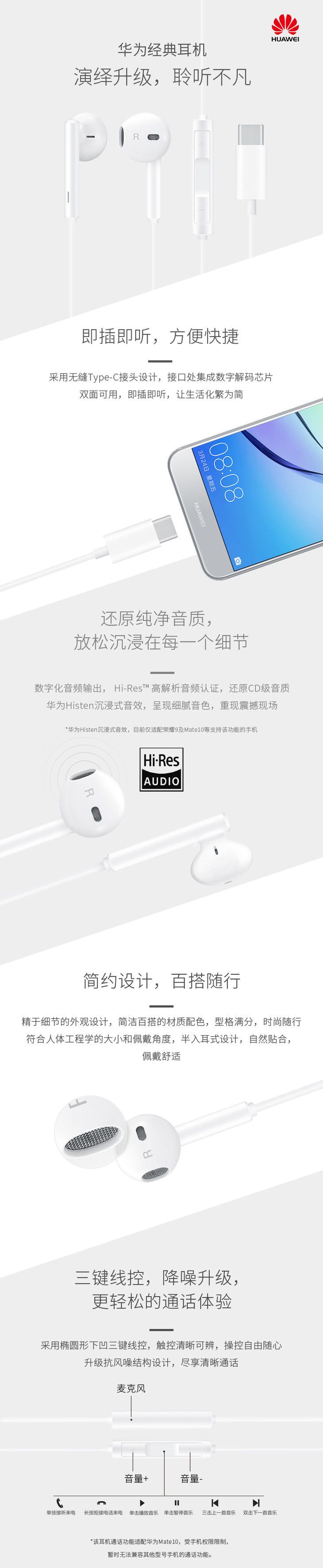 HUAWEI 经典有线耳机 TypeC接口 降噪 半入耳式