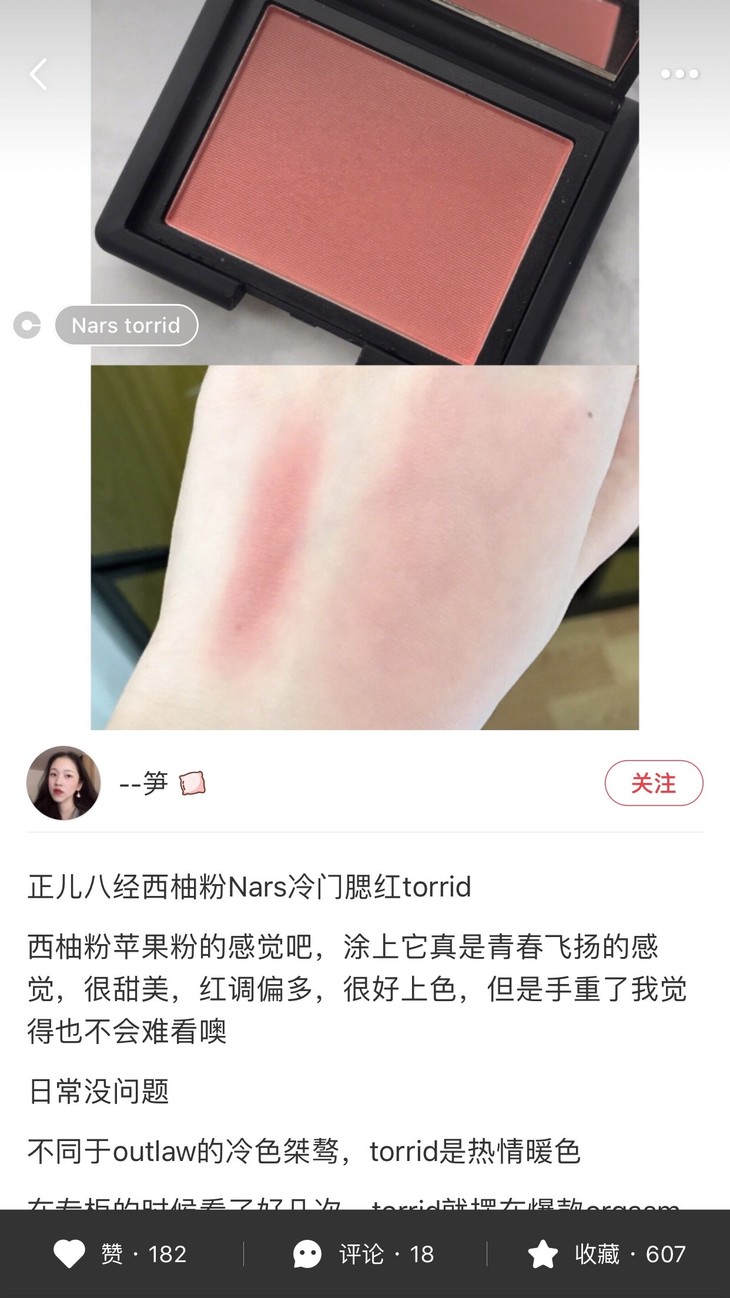 NARS 腮红TORRID# Torrid是橘色系腮红的代表,金色珠光比较多的珊瑚橙色少量多次涂,✨气质自然显!!㊙️黑黄皮福音,🍬它属于带微闪、偏橘的珊瑚色,和偏黑黄的肤色搭一点也不会觉得有违和感。❄️上脸是健康的颜色,很自然,在提升气色的同时还有一些修容的作用,😏显瘦,简直是无敌好物!😍