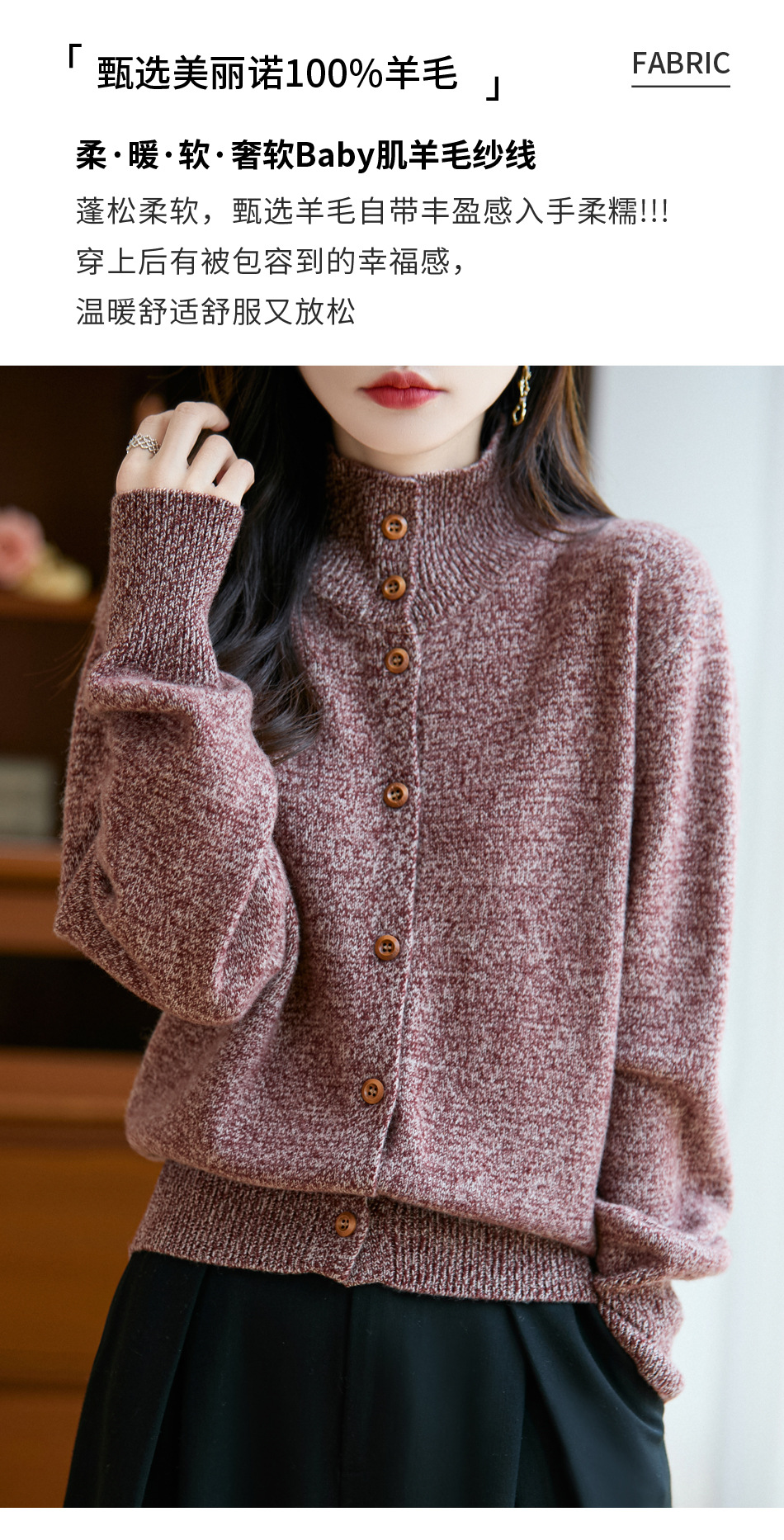 丁摩 100%纯羊毛高领花纱加厚系扣针织开衫外套QT1G-2103 商品图3