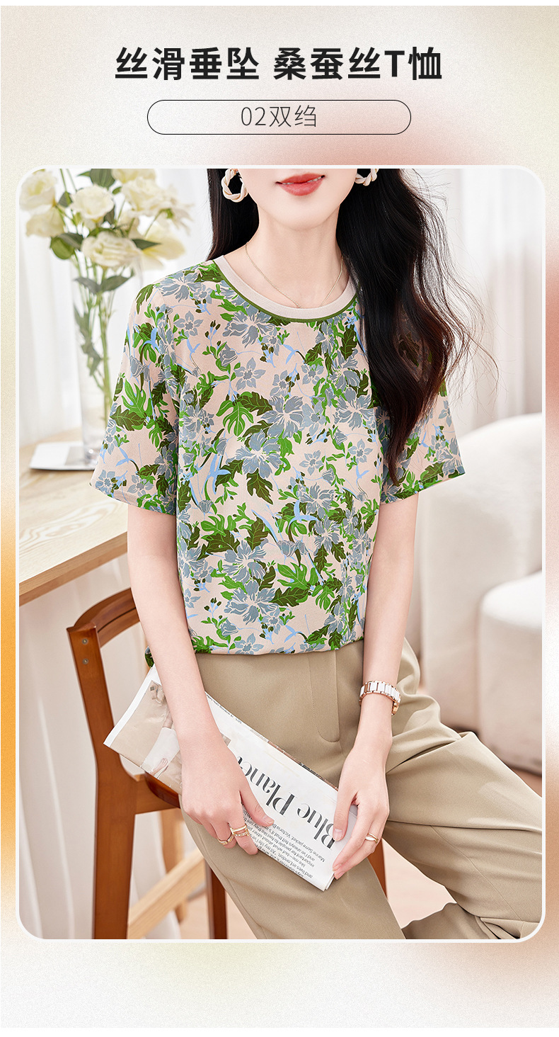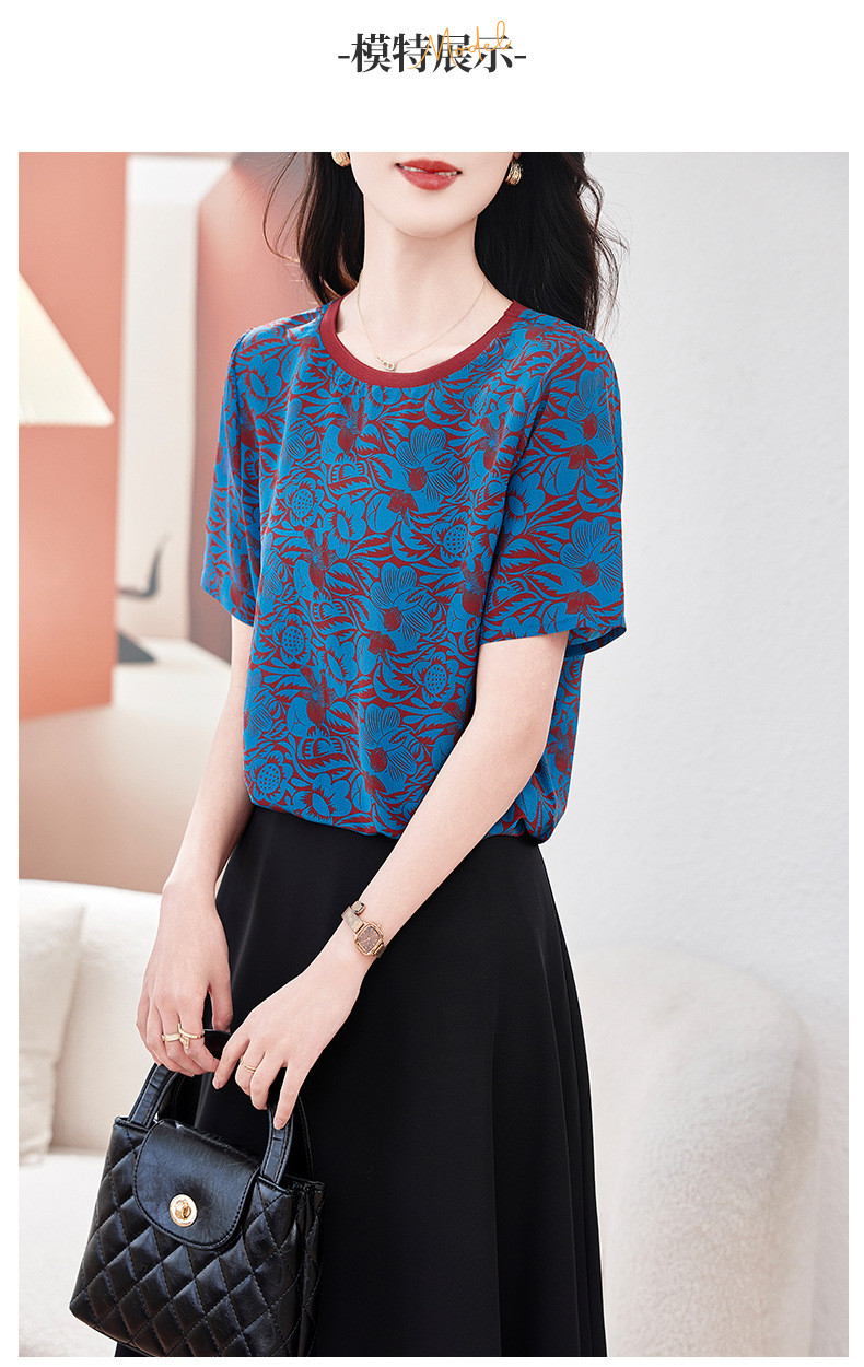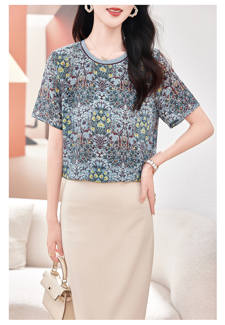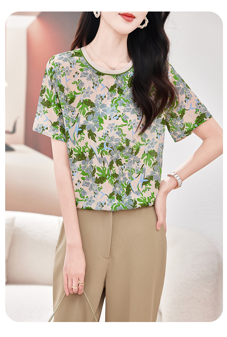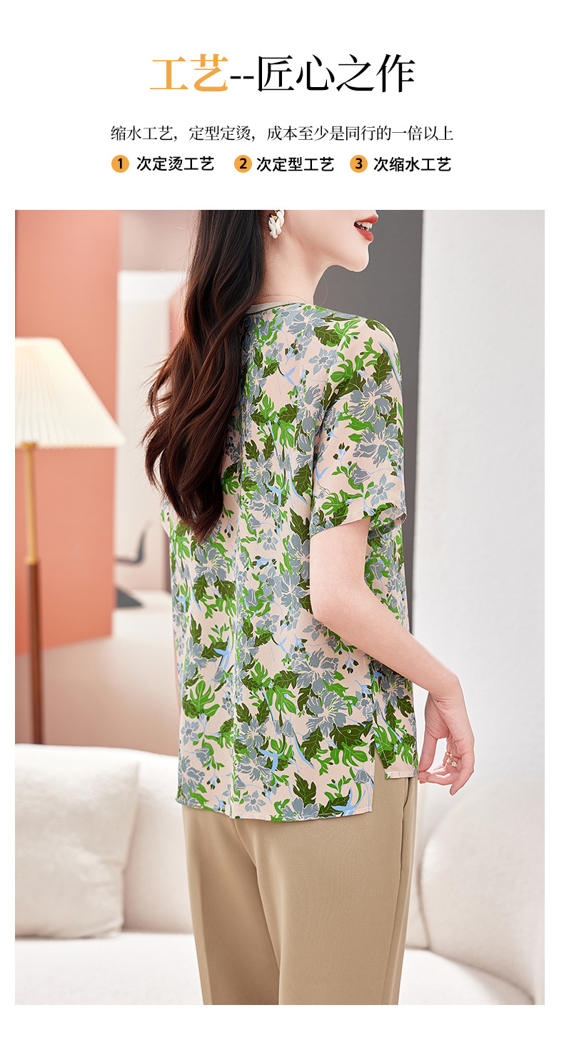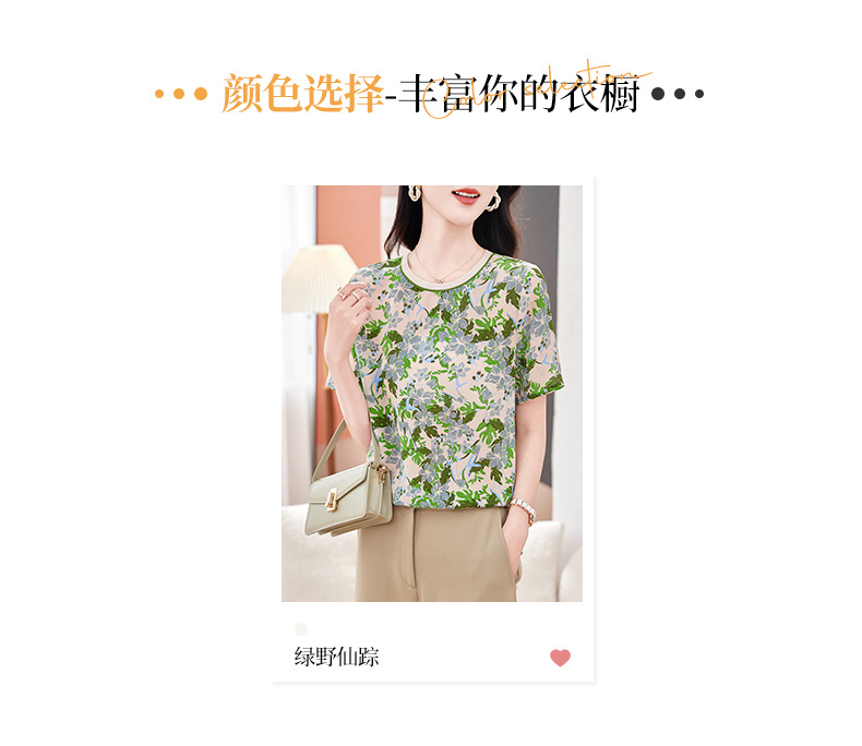 丁摩高端真丝双绉短袖T恤新款夏季时尚印花休闲桑蚕丝小衫上衣AL
