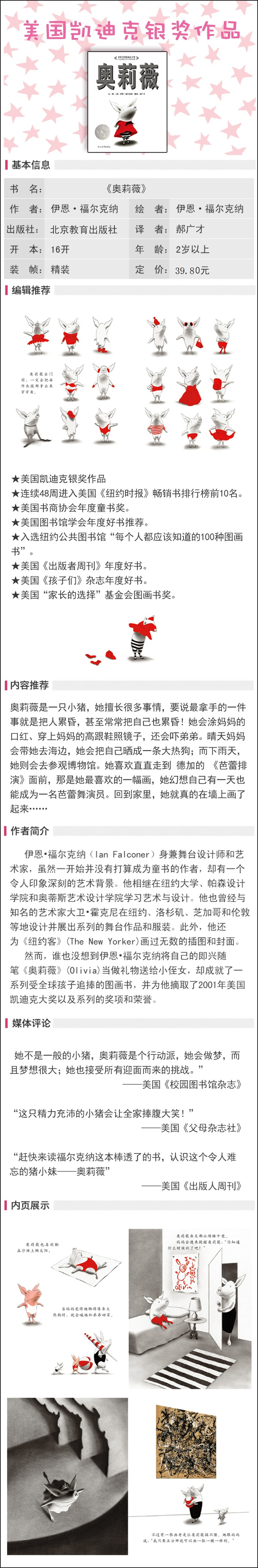 读过《奥莉薇》的爸爸妈妈们,很容易有这样的同感:奥莉薇就是自家的小宝贝!封面一开始,我们看到了奥莉薇的全身正面形象,接着翻下去,奥莉薇的各种衣饰、装备展现在眼前,还有她的各种表情、动作,接着是她的家人。我们感觉奥莉薇已经变得越来越熟悉,形象也越来越丰满,可是回头想......