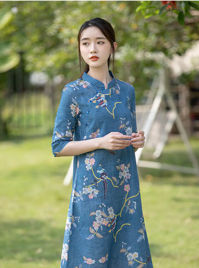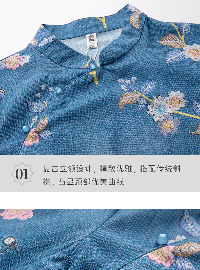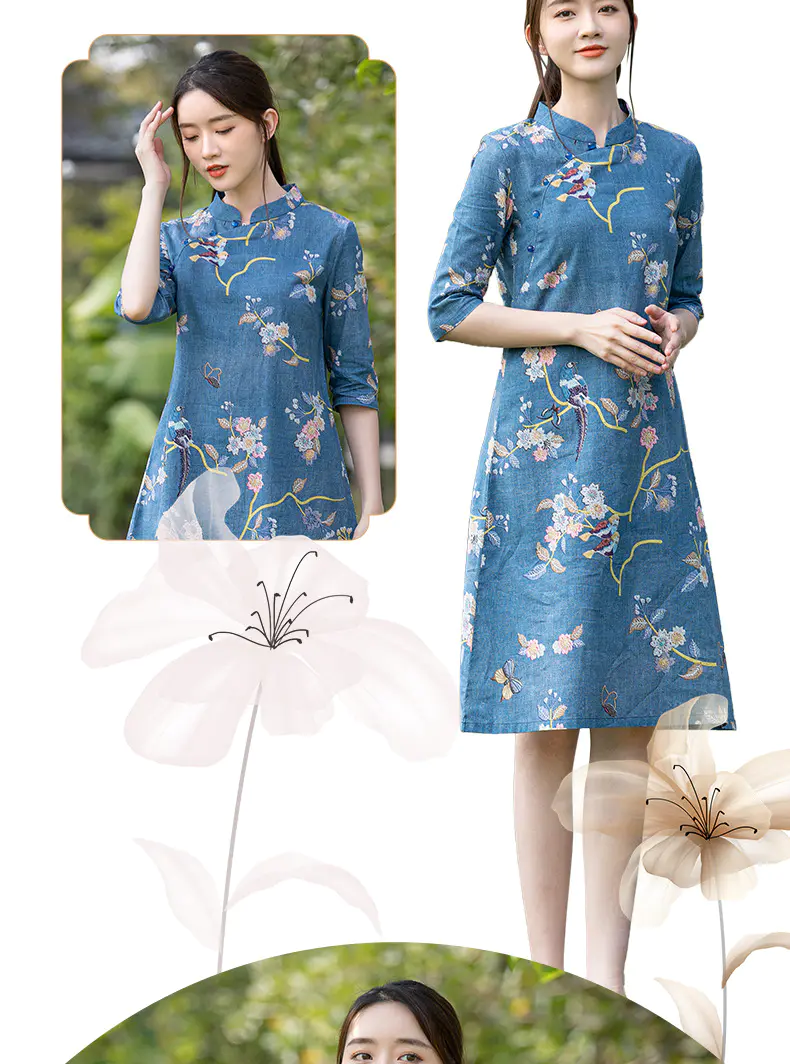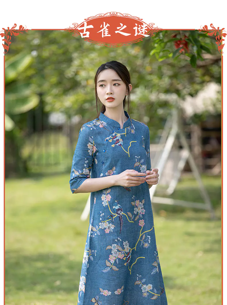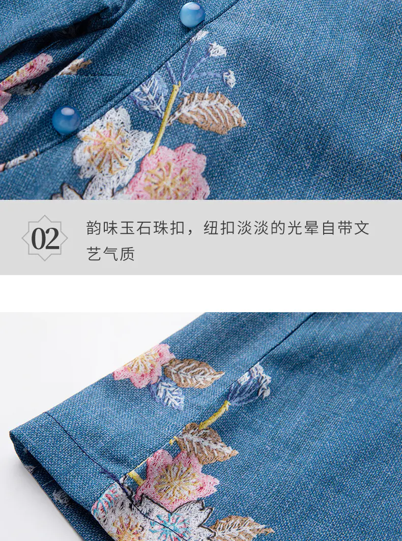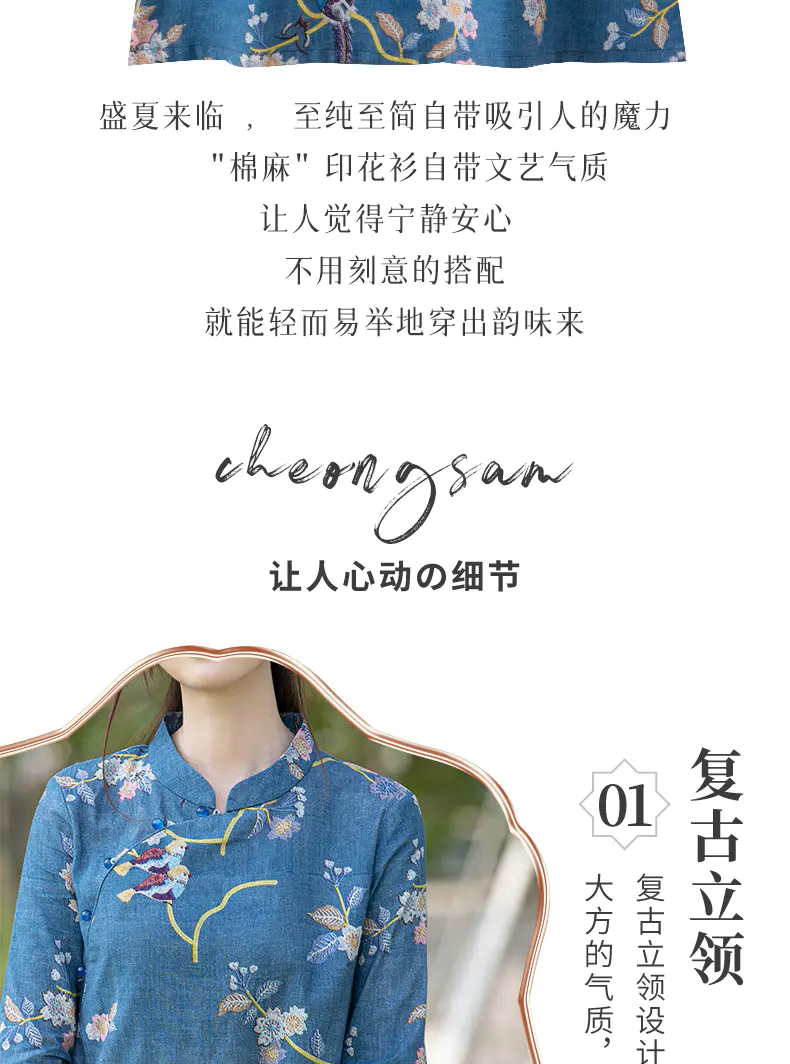JTFS318新款复古文艺中式低领中袖棉麻大摆印花连衣裙