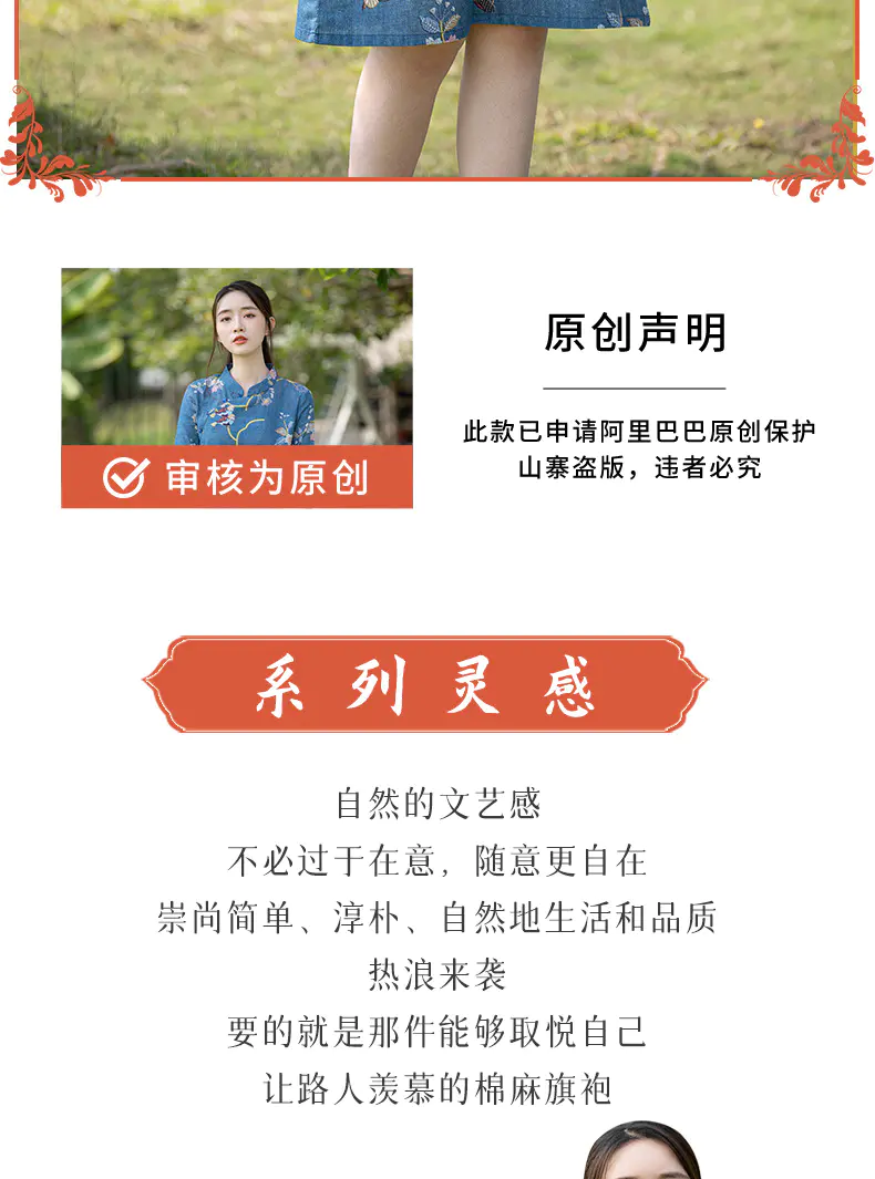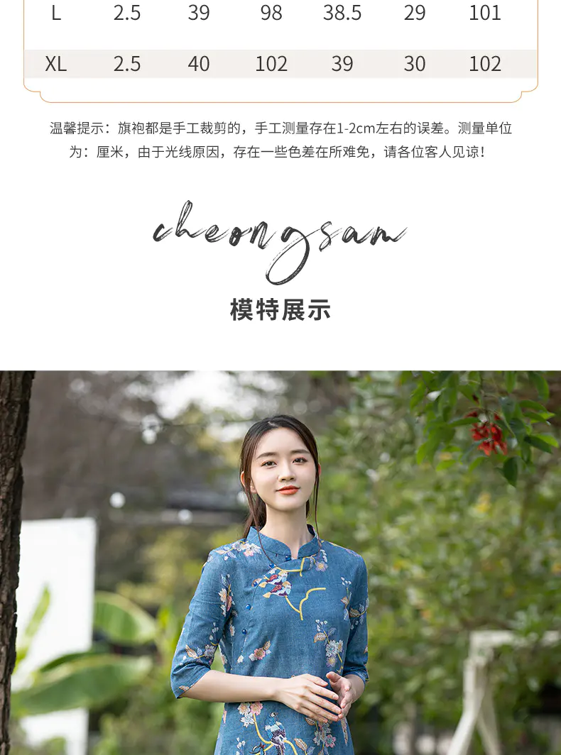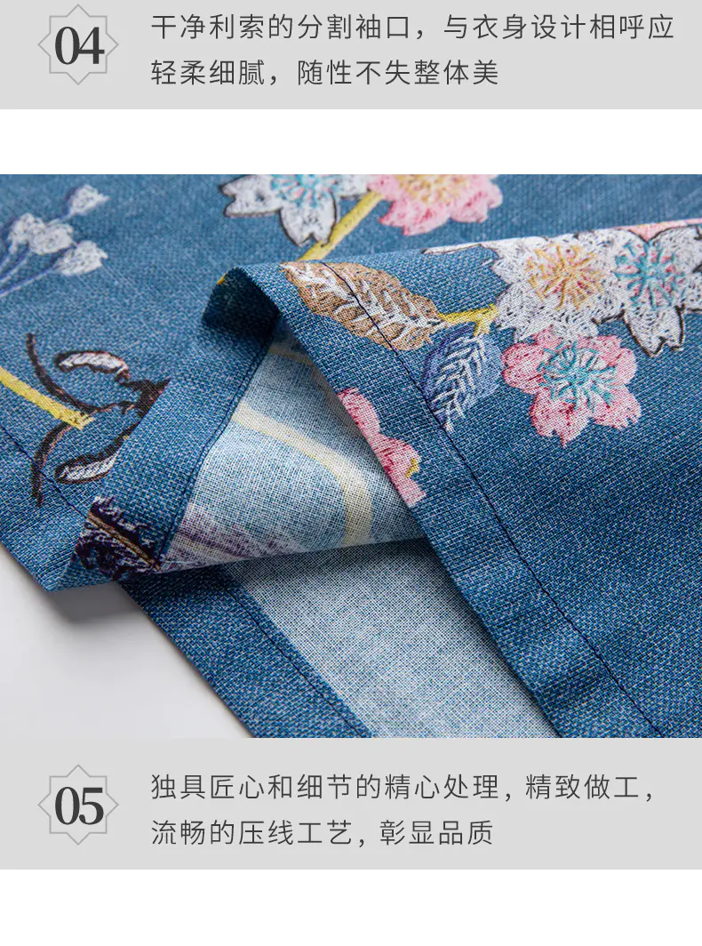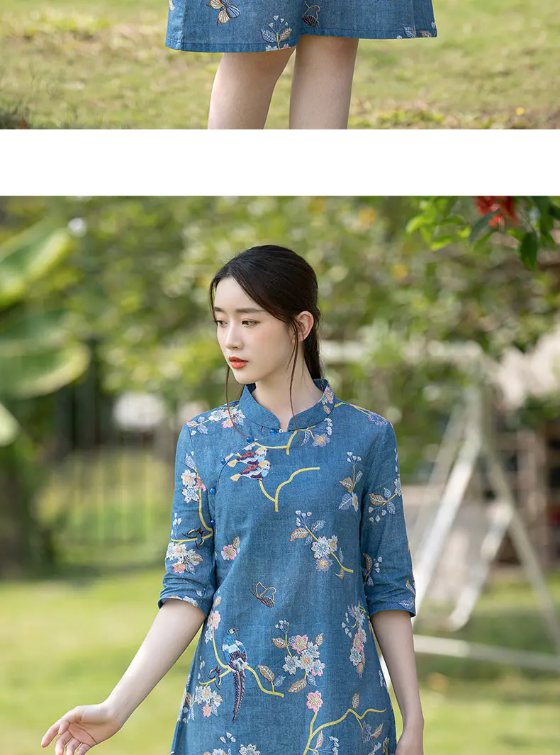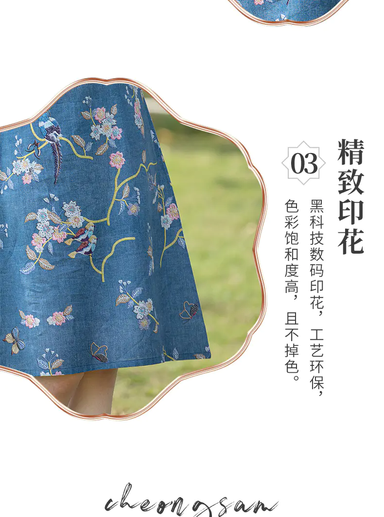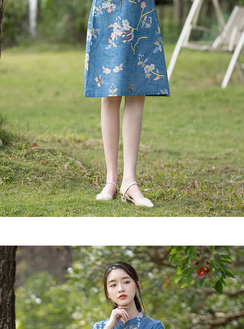JTFS318新款复古文艺中式低领中袖棉麻大摆印花连衣裙