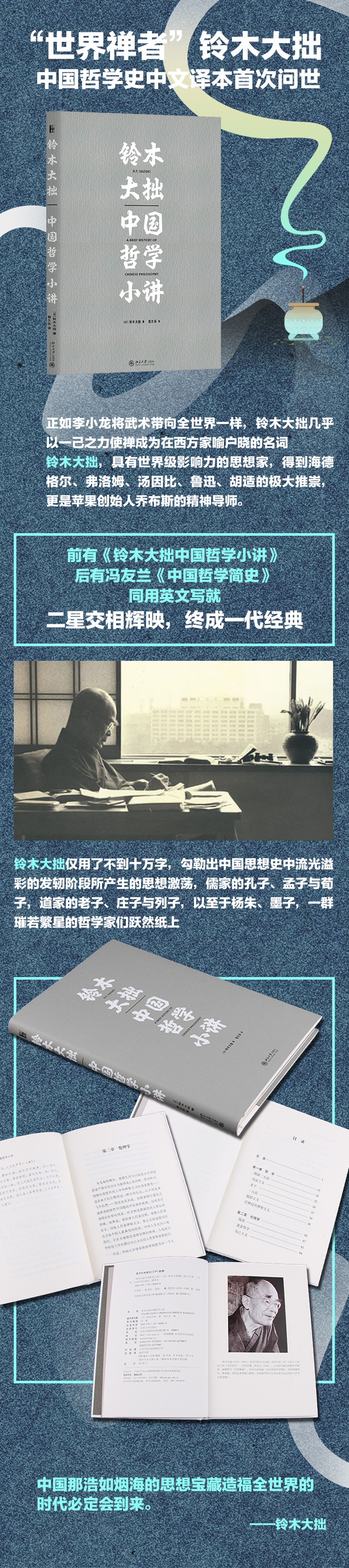 作为一位影响世界至深的思想家,铃木大拙仅仅用了不到十万字,就从哲学、伦理学和宗教三个面向,勾勒出中国思想史中流光溢彩的发轫阶段所产生的思想激荡,儒家的孔子、孟子与荀子,道家的老子、庄子与列子,以至于杨朱、墨子,这一群璀若繁星的哲学家们跃然纸上。