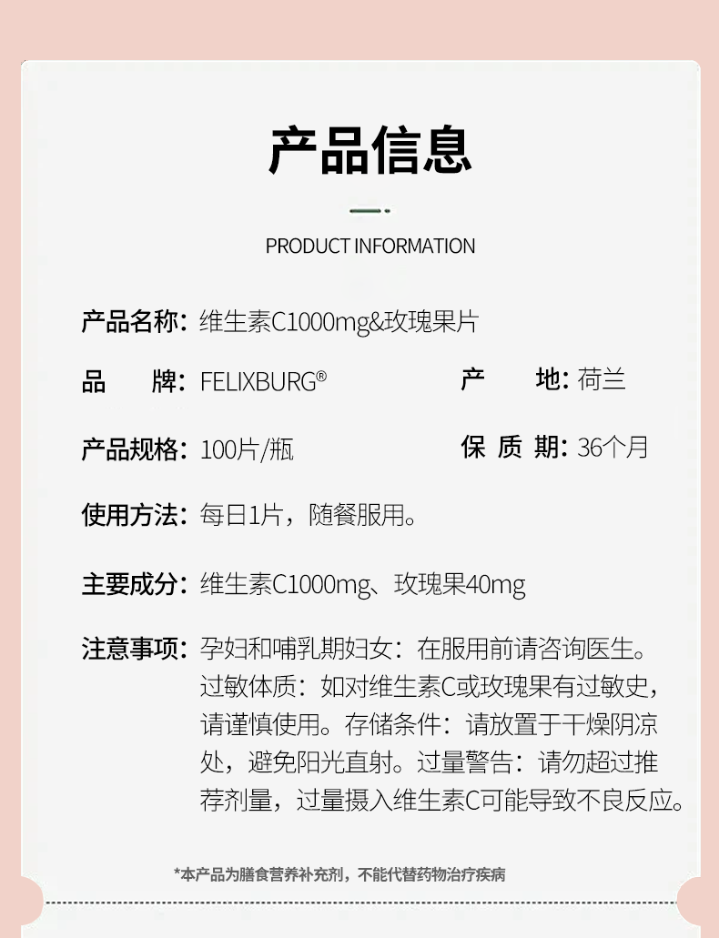 Felixburg维生素c1000mg玫瑰果片 100片/瓶